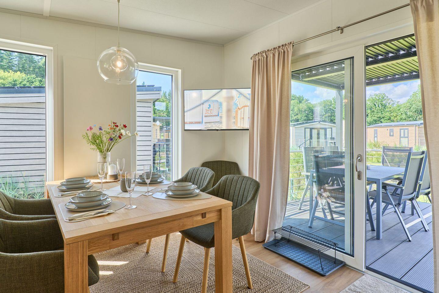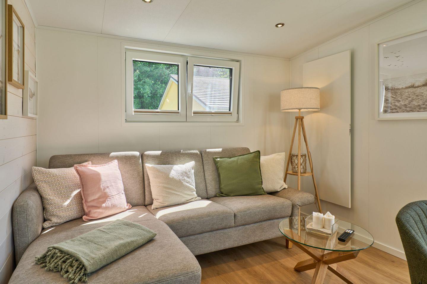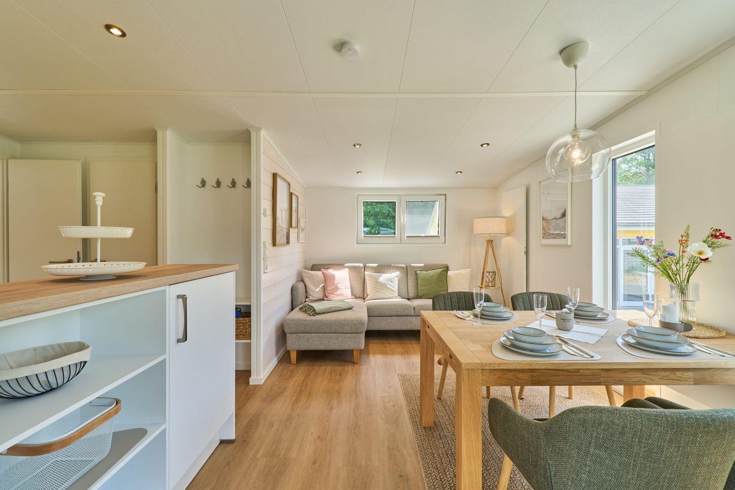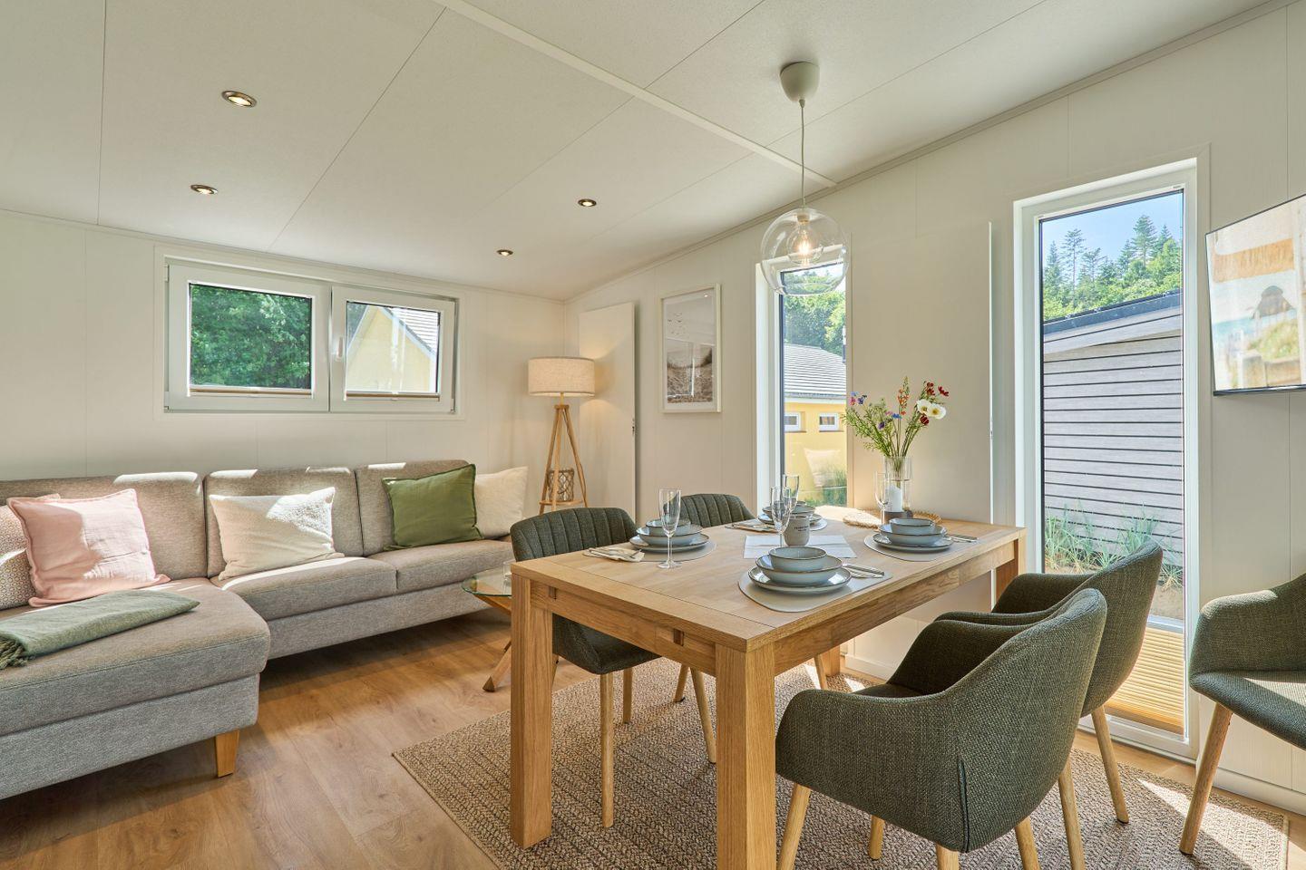 Das Ferienhaus bietet Platz für bis zu fünf Personen und verfügt über zwei gemütliche Schlafzimmer, ein modernes Badezimmer sowie einen offenen Wohn- und Essbereich. Der durchdachte Grundriss gestaltet die 40 m² Wohnfläche freundlich und einladend. Der Wohnbereich ist mit einem komfortablen Sofa und einem Fernseher ausgestattet, sodass Sie entspannte Abende verbringen können. Die große Fensterfront lässt viel Tageslicht herein und bietet einen herrlichen Blick auf den Garten, der mit Gartenmöbeln ausgestattet ist und lädt zum Verweilen ein.