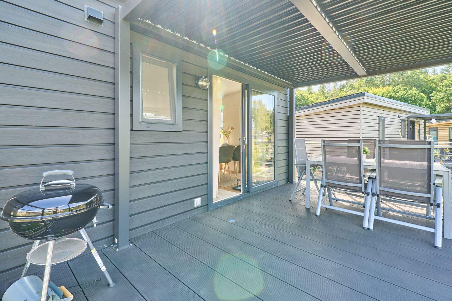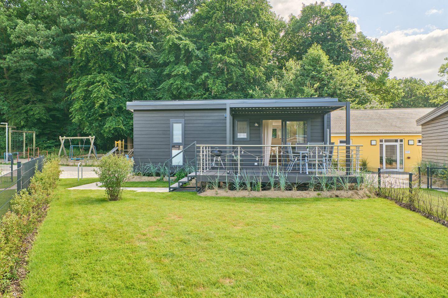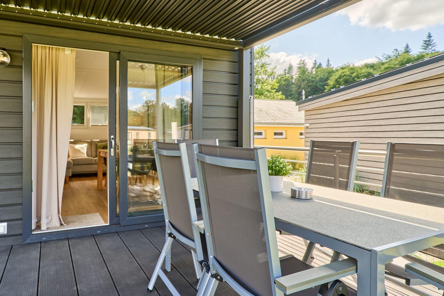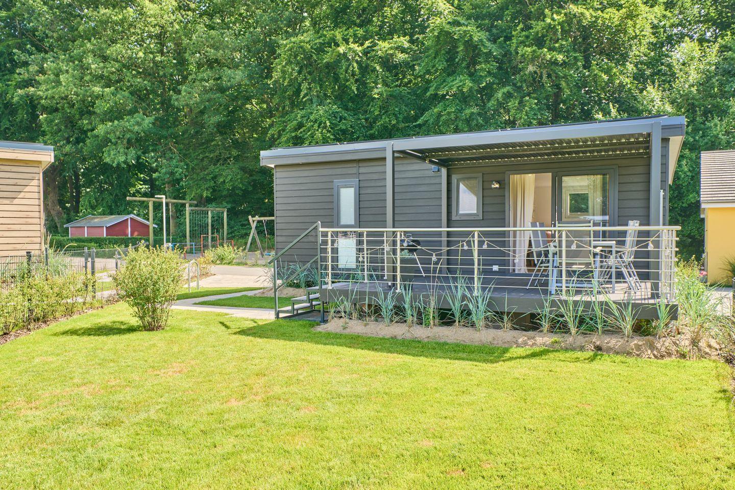 Das Ferienhaus bietet Platz für bis zu fünf Personen und verfügt über zwei gemütliche Schlafzimmer, ein modernes Badezimmer sowie einen offenen Wohn- und Essbereich. Der durchdachte Grundriss gestaltet die 40 m² Wohnfläche freundlich und einladend. Der Wohnbereich ist mit einem komfortablen Sofa und einem Fernseher ausgestattet, sodass Sie entspannte Abende verbringen können. Die große Fensterfront lässt viel Tageslicht herein und bietet einen herrlichen Blick auf den Garten, der mit Gartenmöbeln ausgestattet ist und lädt zum Verweilen ein.