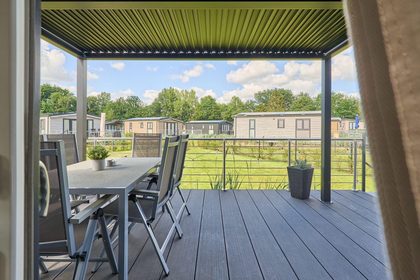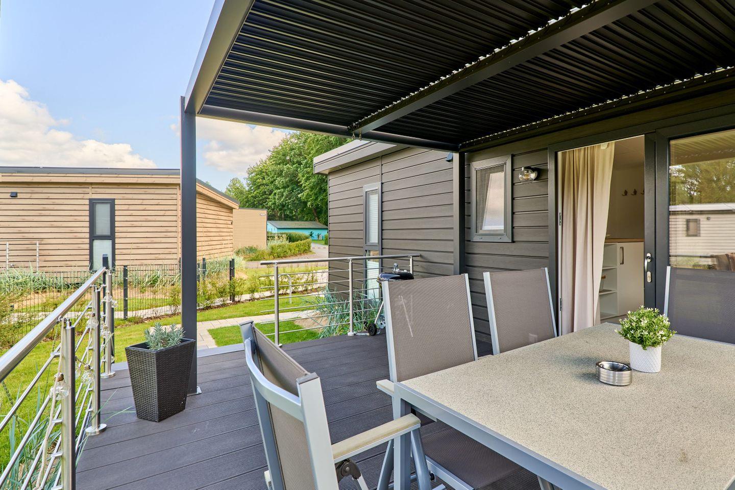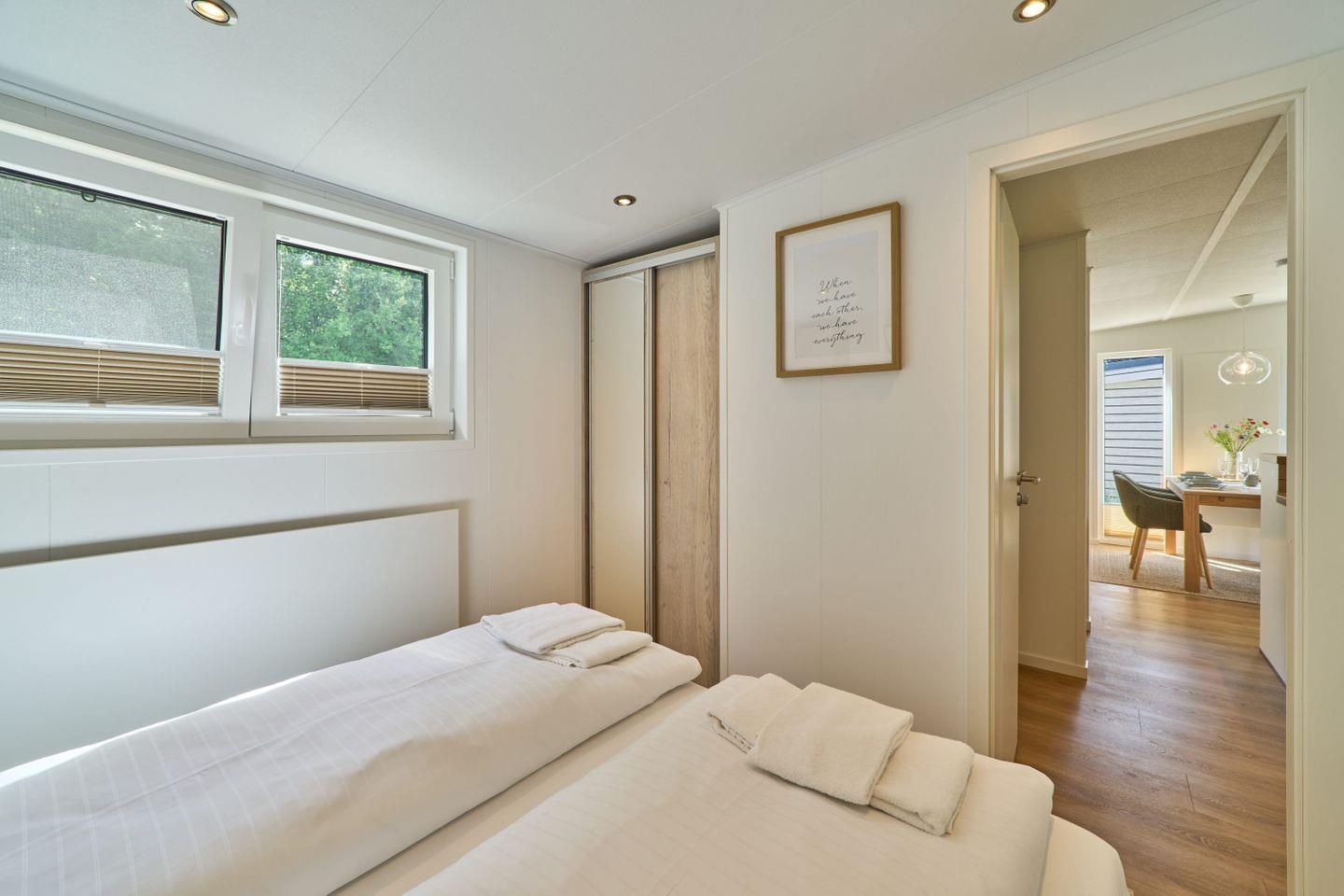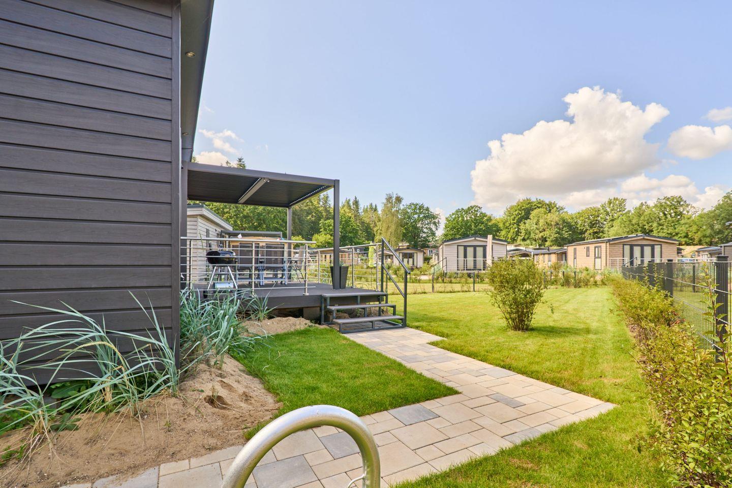 Das Ferienhaus bietet Platz für bis zu fünf Personen und verfügt über zwei gemütliche Schlafzimmer, ein modernes Badezimmer sowie einen offenen Wohn- und Essbereich. Der durchdachte Grundriss gestaltet die 40 m² Wohnfläche freundlich und einladend. Der Wohnbereich ist mit einem komfortablen Sofa und einem Fernseher ausgestattet, sodass Sie entspannte Abende verbringen können. Die große Fensterfront lässt viel Tageslicht herein und bietet einen herrlichen Blick auf den Garten, der mit Gartenmöbeln ausgestattet ist und lädt zum Verweilen ein.