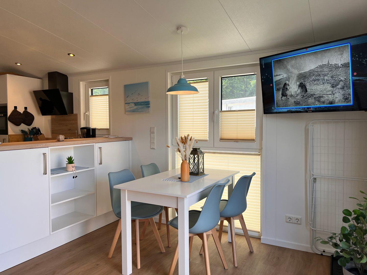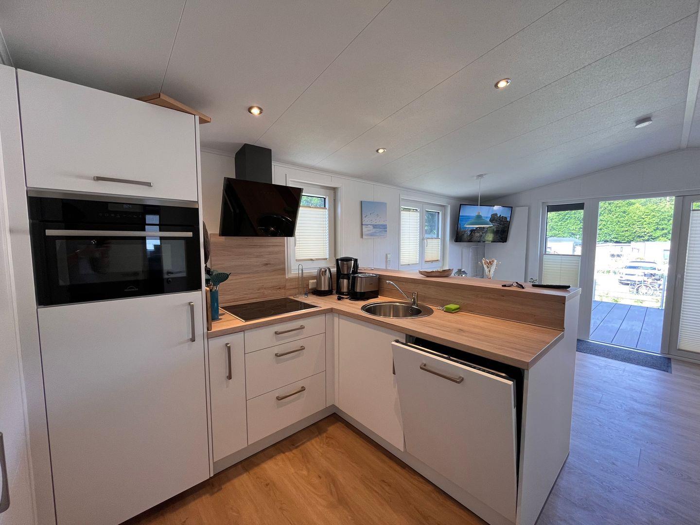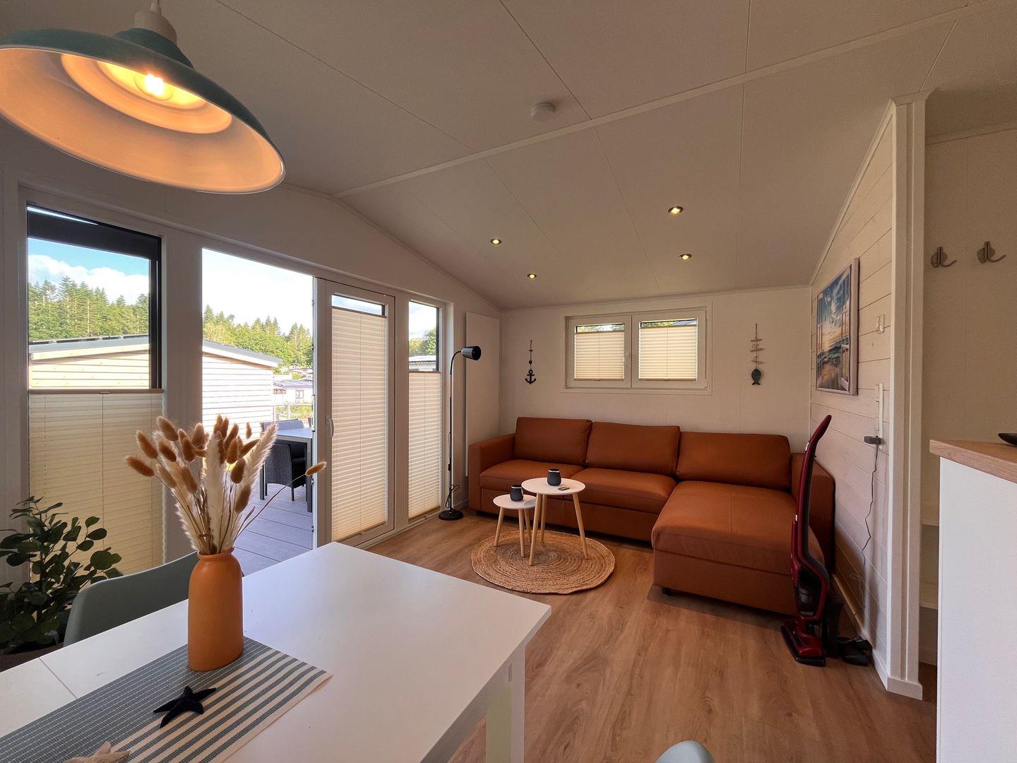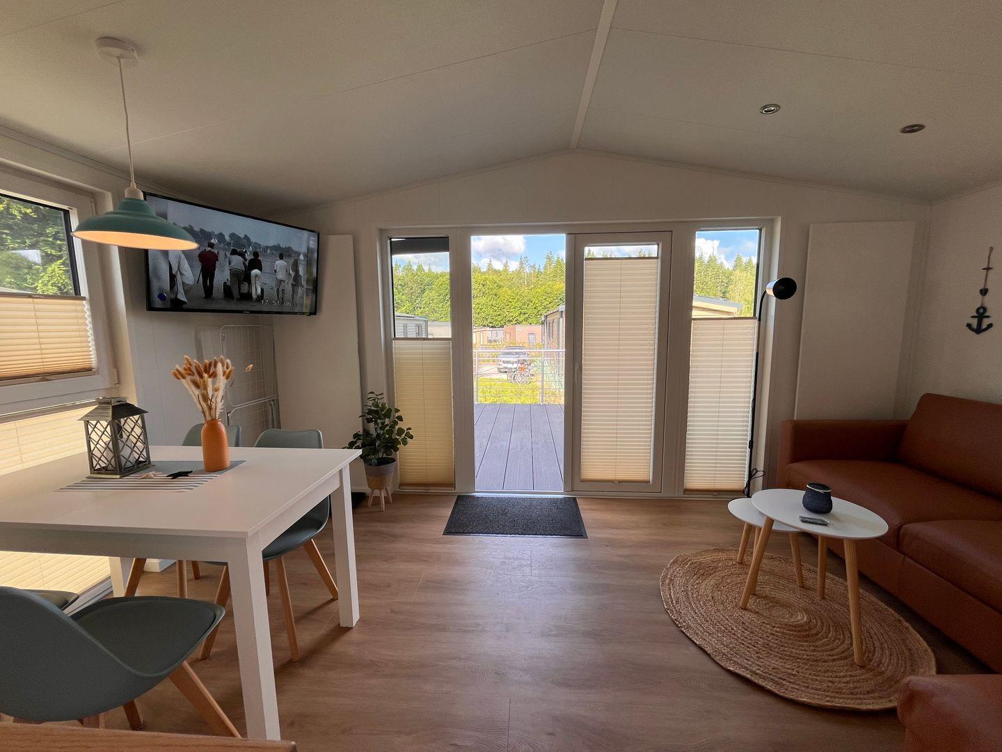 Das Ferienhaus verfügt über insgesamt drei Zimmer, darunter zwei Schlafzimmer mit Vinylbodenbelag, die für erholsamen Schlaf sorgen. Im Wohnzimmer mit ebenfalls vinylverlegtem Boden können Sie sich in einer gemütlichen Sofaecke entspannen. Die offene Küche ist zum Wohnzimmer hin gestaltet und komplett ausgestattet, unter anderem mit einem Ceran-Herd, Backofen, Geschirrspüler, Kühlschrank mit integriertem Gefrierfach, Kaffeemaschine, Wasserkocher, Toaster sowie einer Küchenmaschine. Essbereich und Esstisch sind ebenfalls vorhanden, sodass Mahlzeiten bequem eingenommen werden können.