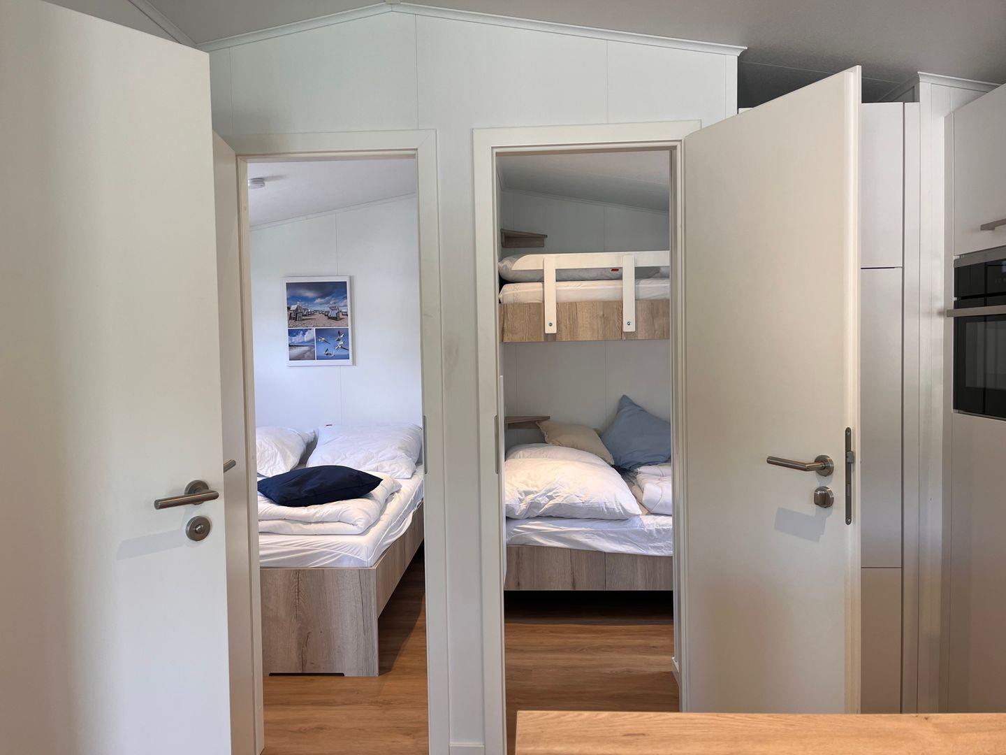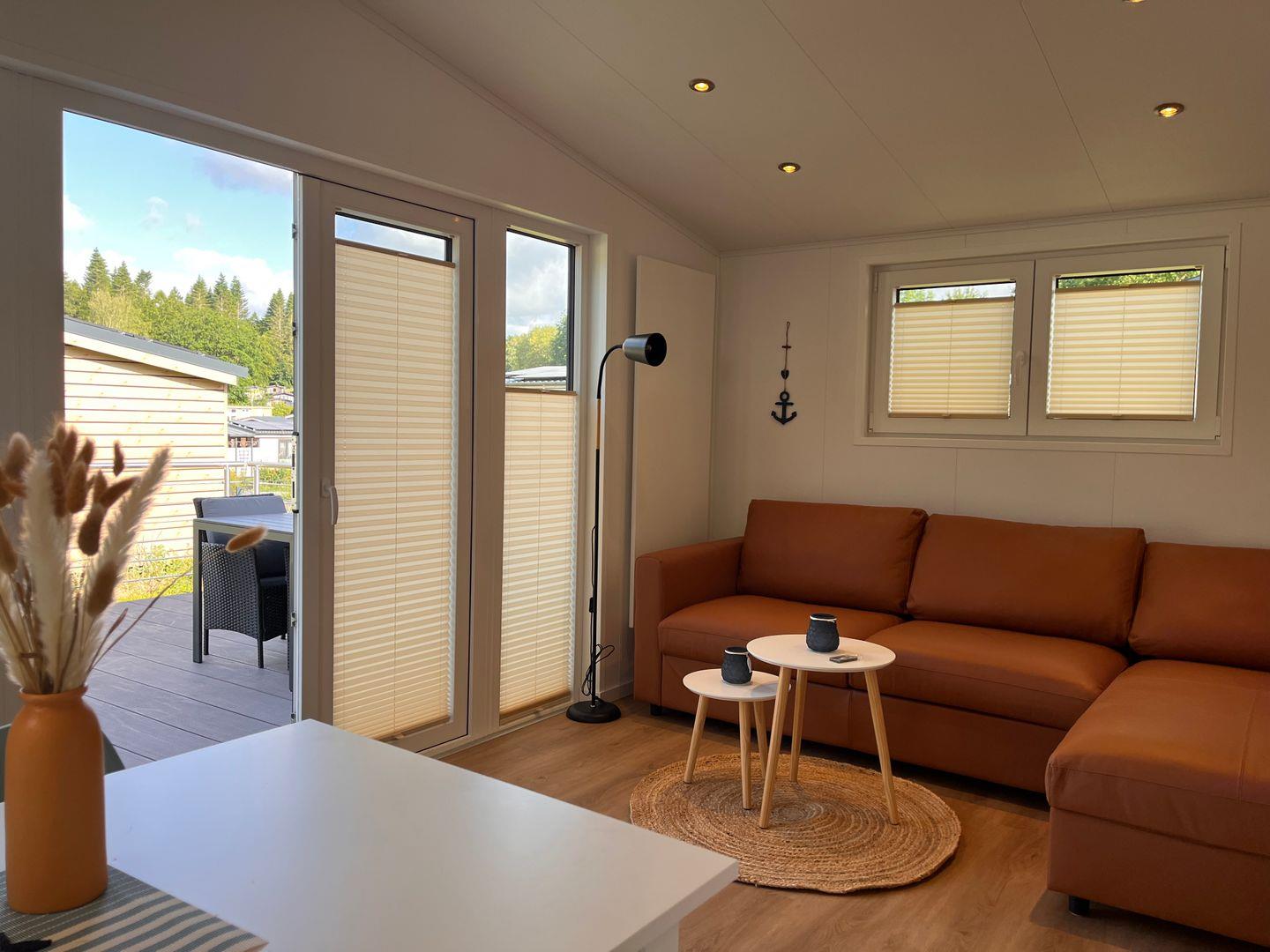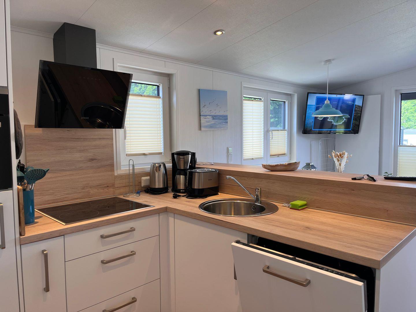 Das Ferienhaus verfügt über insgesamt drei Zimmer, darunter zwei Schlafzimmer mit Vinylbodenbelag, die für erholsamen Schlaf sorgen. Im Wohnzimmer mit ebenfalls vinylverlegtem Boden können Sie sich in einer gemütlichen Sofaecke entspannen. Die offene Küche ist zum Wohnzimmer hin gestaltet und komplett ausgestattet, unter anderem mit einem Ceran-Herd, Backofen, Geschirrspüler, Kühlschrank mit integriertem Gefrierfach, Kaffeemaschine, Wasserkocher, Toaster sowie einer Küchenmaschine. Essbereich und Esstisch sind ebenfalls vorhanden, sodass Mahlzeiten bequem eingenommen werden können.