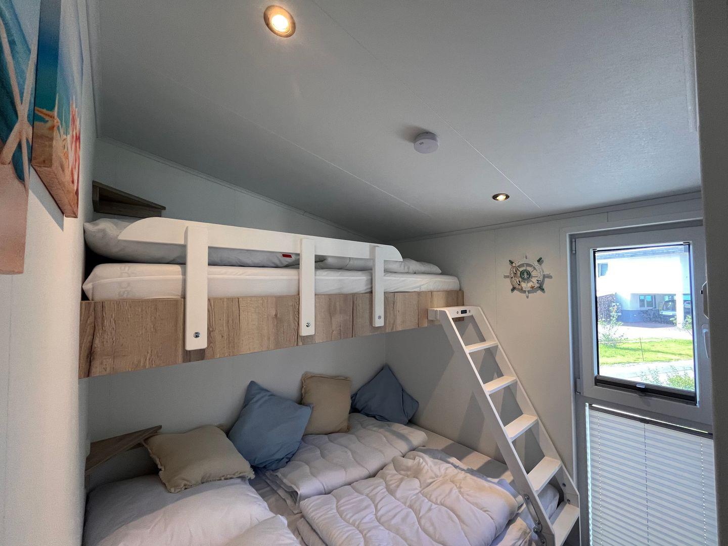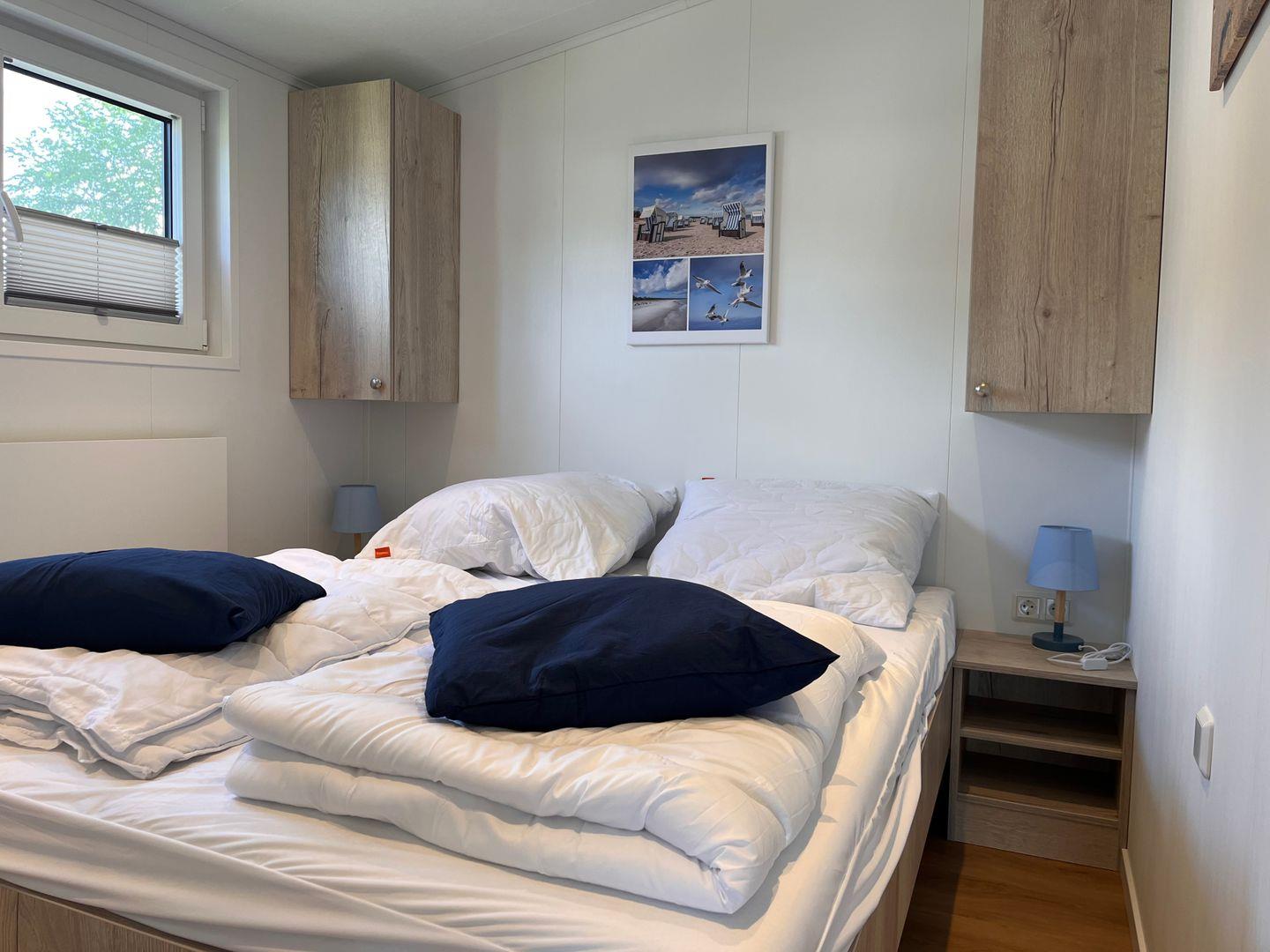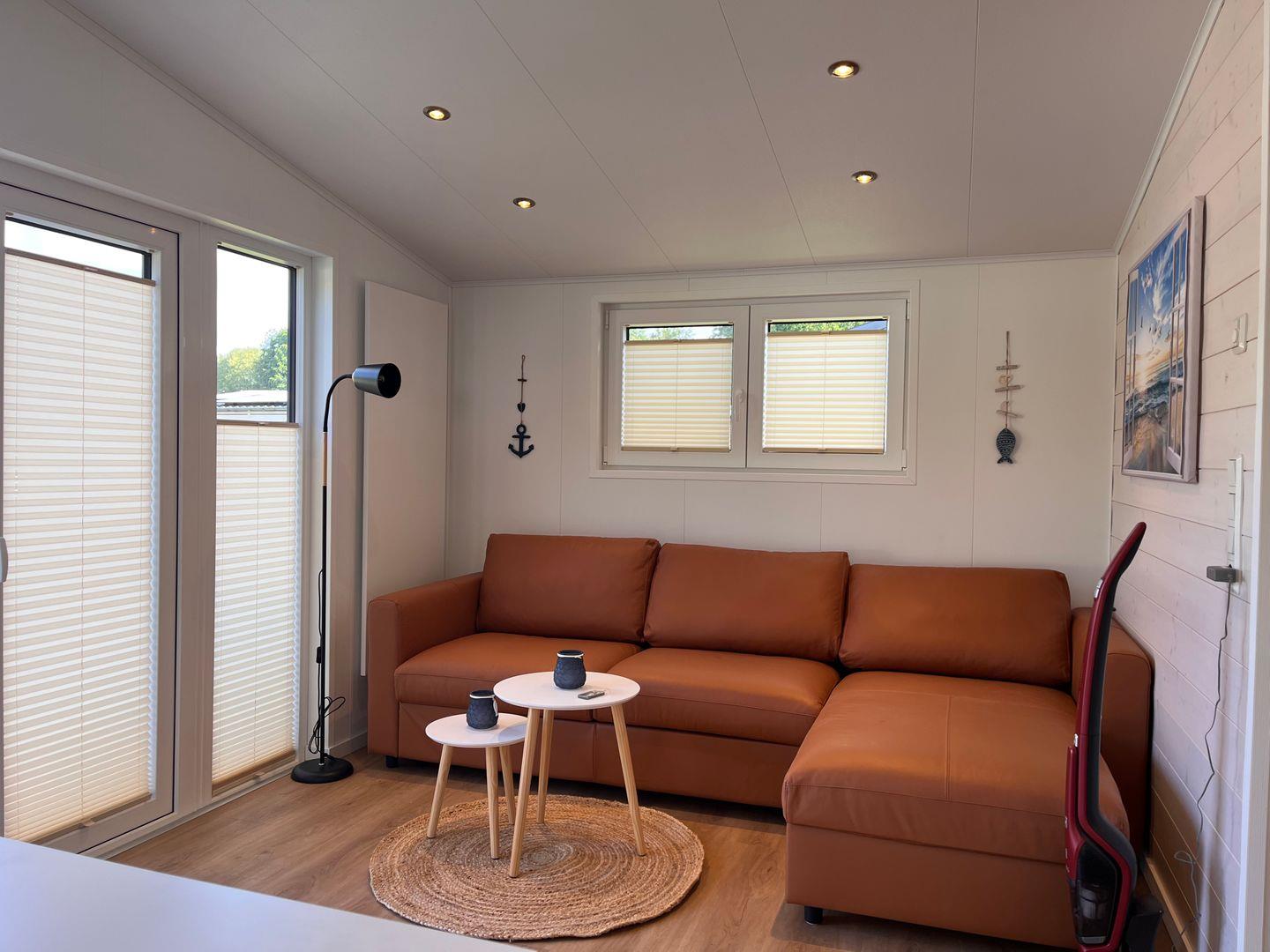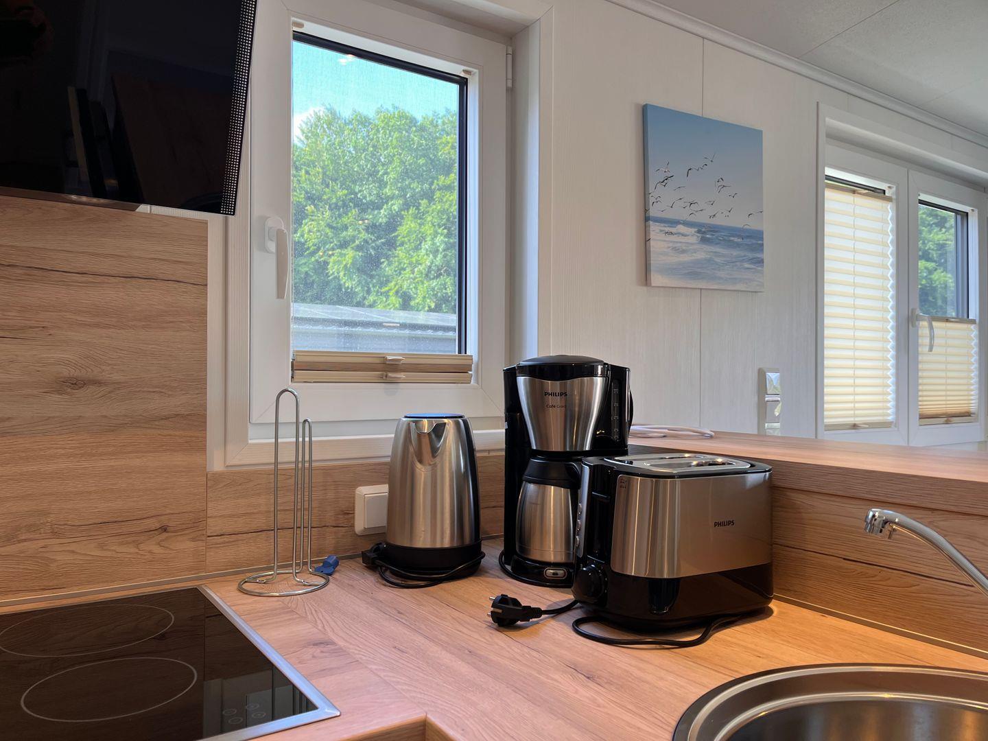 Das Ferienhaus verfügt über insgesamt drei Zimmer, darunter zwei Schlafzimmer mit Vinylbodenbelag, die für erholsamen Schlaf sorgen. Im Wohnzimmer mit ebenfalls vinylverlegtem Boden können Sie sich in einer gemütlichen Sofaecke entspannen. Die offene Küche ist zum Wohnzimmer hin gestaltet und komplett ausgestattet, unter anderem mit einem Ceran-Herd, Backofen, Geschirrspüler, Kühlschrank mit integriertem Gefrierfach, Kaffeemaschine, Wasserkocher, Toaster sowie einer Küchenmaschine. Essbereich und Esstisch sind ebenfalls vorhanden, sodass Mahlzeiten bequem eingenommen werden können.
