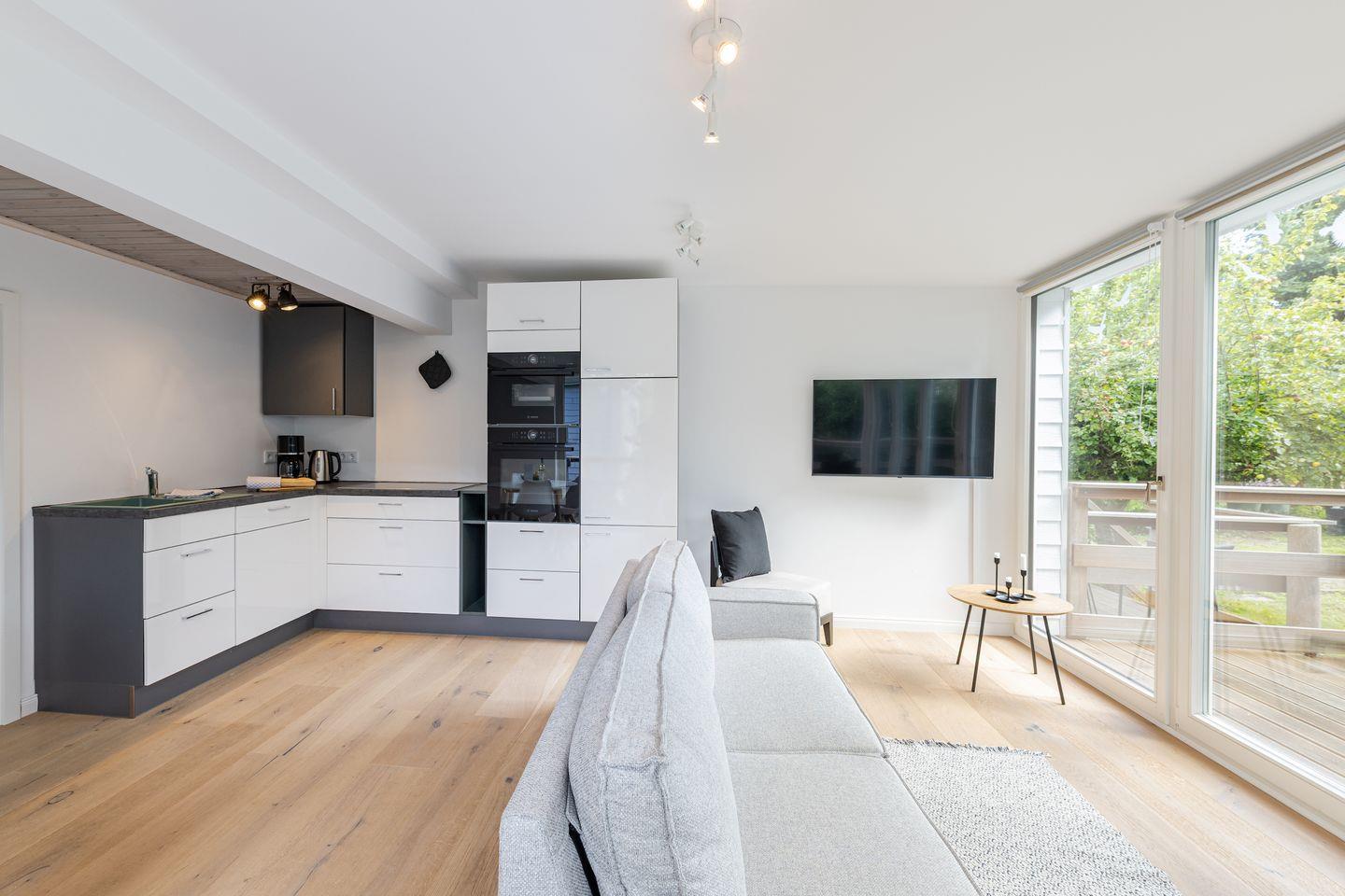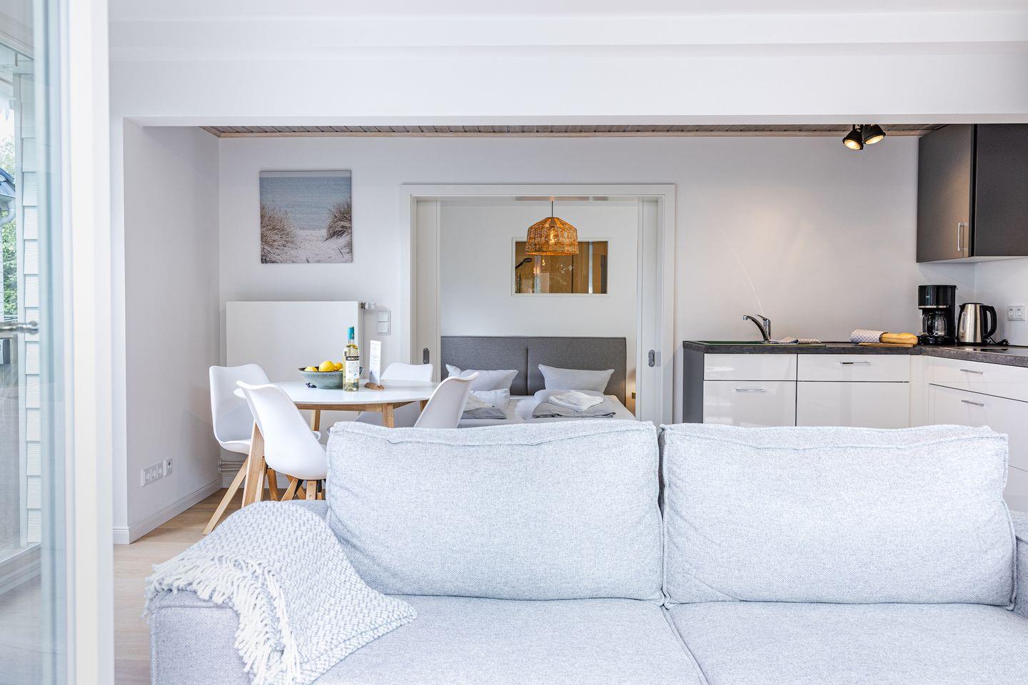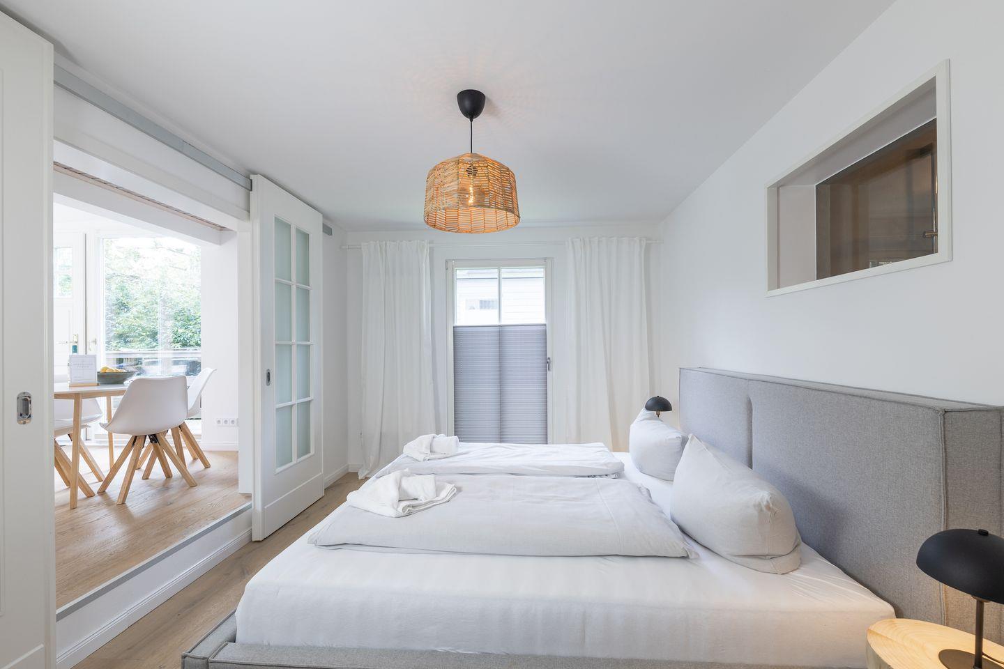 Helle Farben, Parkettböden und ein offenes Raumkonzept schaffen eine freundliche Atmosphäre. Die voll ausgestattete Küche mit Spülmaschine und Kaffeemaschine schließt sich direkt an den Wohnbereich mit Sofa und Esstisch an. Im Schlafzimmer sorgt ein komfortables Bett für erholsamen Schlaf. Das Bad ist großzügig geschnitten und mit bodengleicher Dusche sowie Badewanne ausgestattet. WLAN, TV, Bettwäsche und Handtücher sind inklusive.