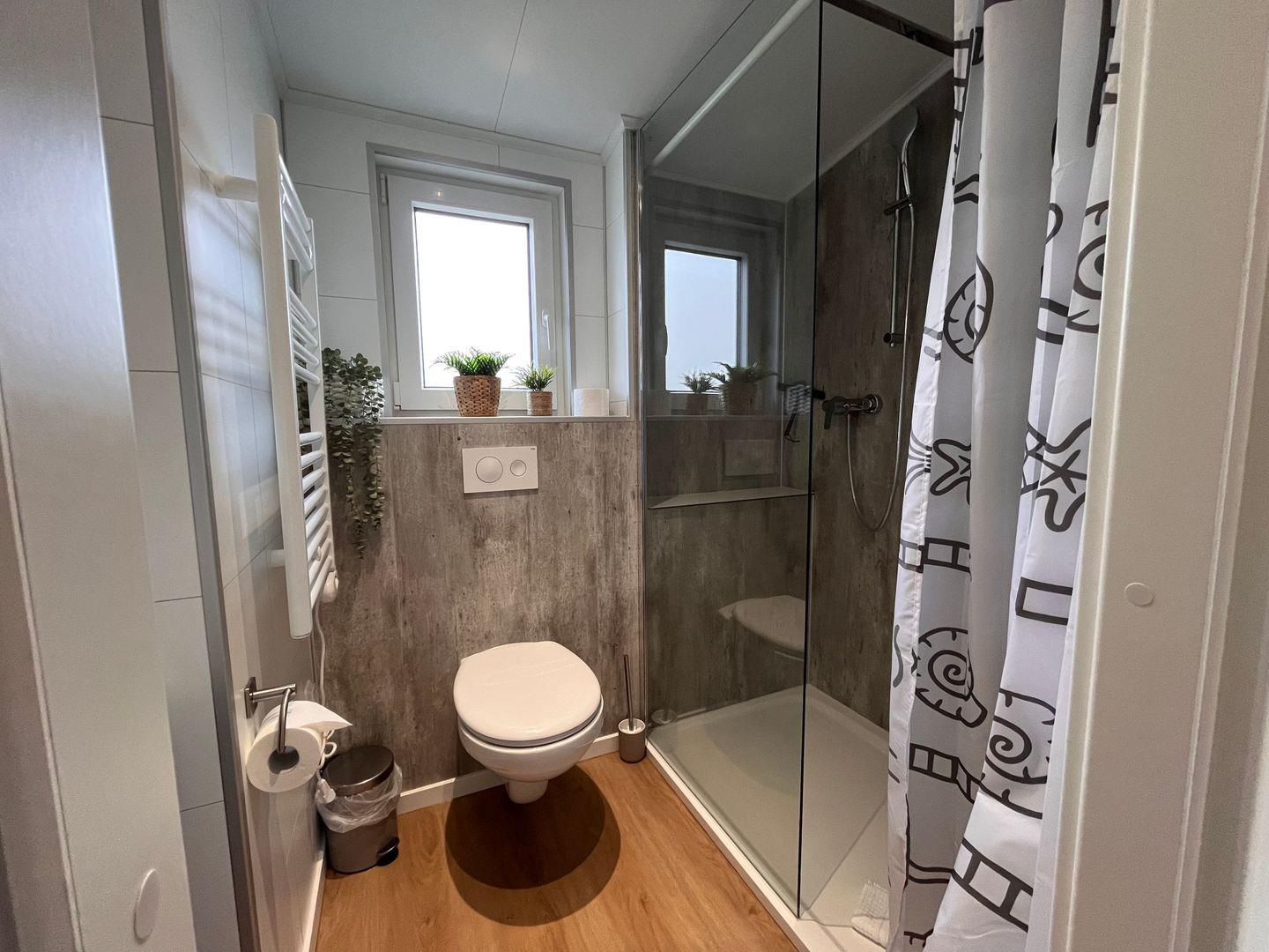 Im Badezimmer steht Ihnen eine moderne, bodengleiche Dusche zur Verfügung. Ein Fenster, WC, Waschbecken, Spiegel, Haartrockner und warmes Wasser komplettieren den Komfort.