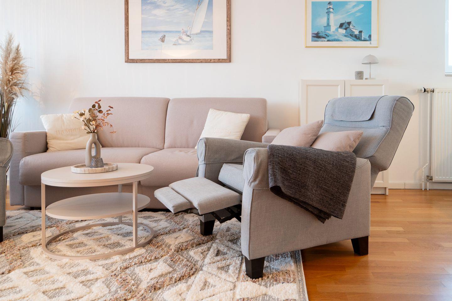 Das separate Schlafzimmer ist mit einem bequemen Doppelbett ausgestattet (2x 90 cm x 200 cm) und sorgt für erholsame Nächte. Im Wohnraum erwartet Sie eine komfortable Sofaecke mit TV, sowie ein moderner Essbereich mit Esstisch und Stühlen. Das Sofa mit Schlaffunktion bietet Platz zum Schlafen für zwei Personen. Alle Schlafräume verfügen über Sichtschutz an den Fenstern, sodass Verdunklung für erholsame Nächste gewährleistet ist.