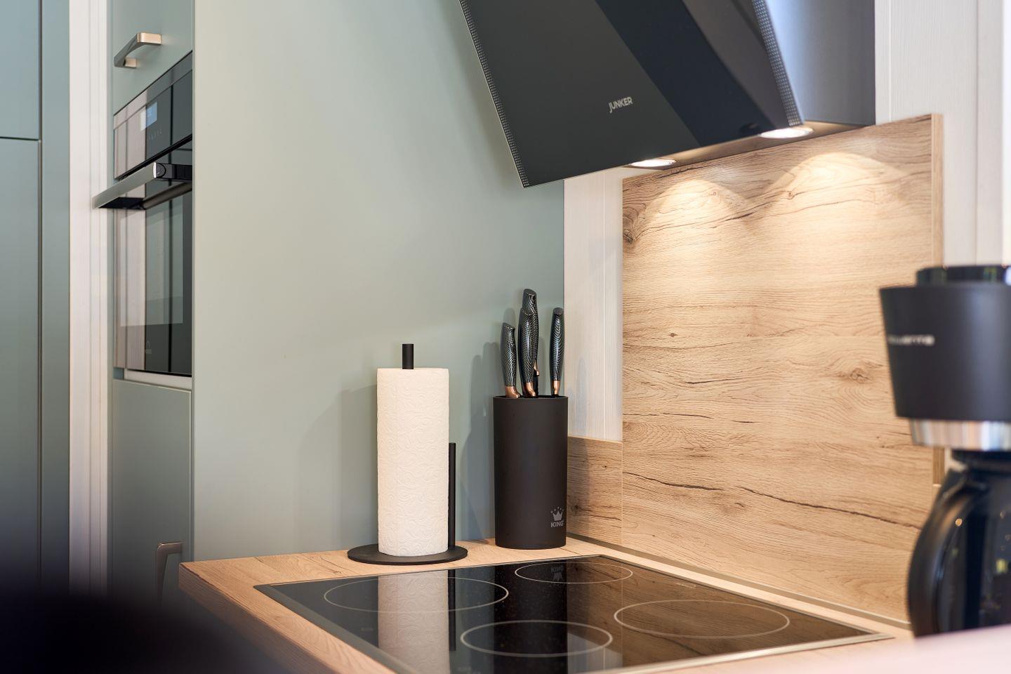Im offenen und lichtdurchfluteten Wohnbereich erwartet Sie eine komfortable Sofaecke zum Entspannen sowie eine moderne Entertainment-Ausstattung mit zwei Satelliten-TVs und WLAN. Der angrenzende Essbereich mit großem Esstisch lädt zum gemeinsamen Genießen ein. Die offen zum Wohnzimmer gestaltete Küche ist hochwertig ausgestattet und lässt keine Wünsche offen: Ceranherd, Backofen, Kühlschrank mit Gefrierfach, Geschirrspüler, Kaffeemaschine, Wasserkocher, Toaster und umfangreiche Küchenutensilien stehen bereit. Auch Gewürze und Geschirrhandtücher werden gestellt.