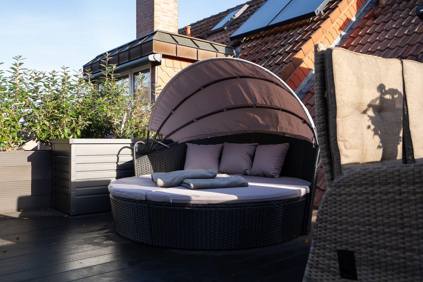 Helles, freundlich eingerichtetes Appartement mit großer Dachterrasse, offener Küche und separatem Schlafzimmer (durch Vorhang abgetrennt). Nur wenige Gehminuten zum Strand. Perfekt für 2–3 Personen und kleine Familien mit Hund.