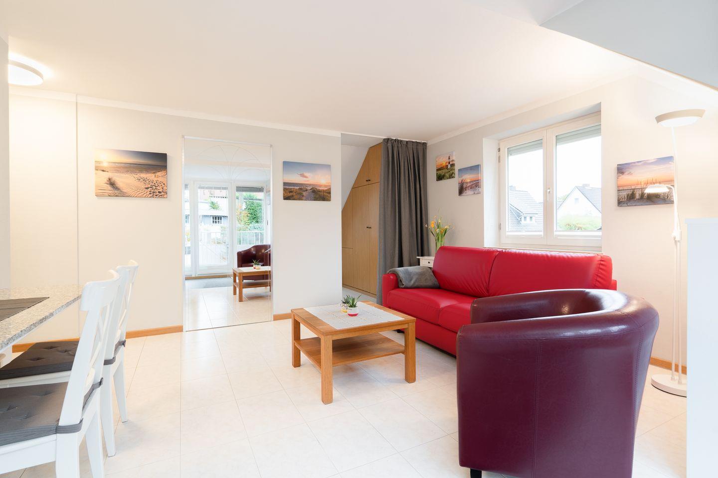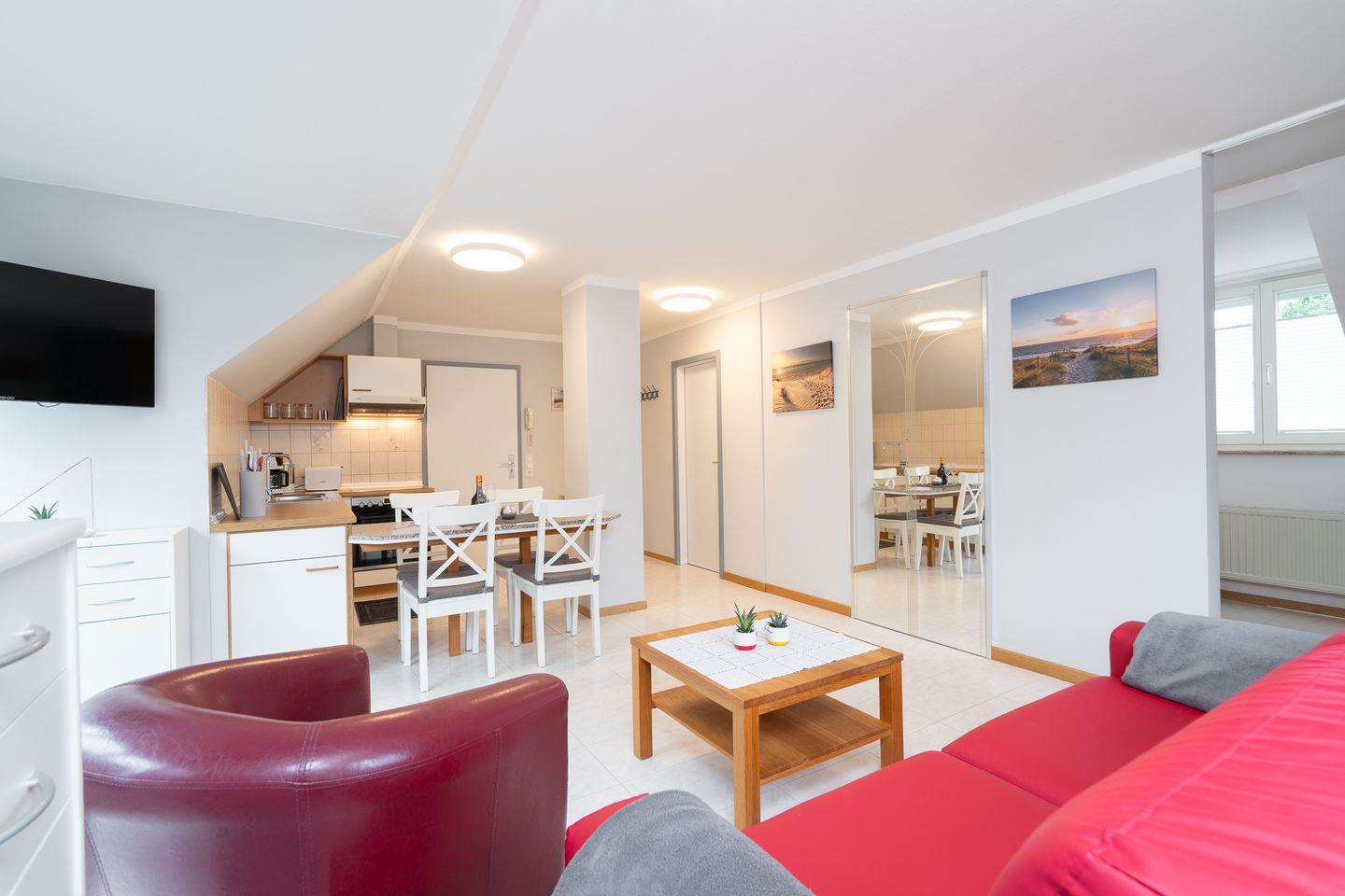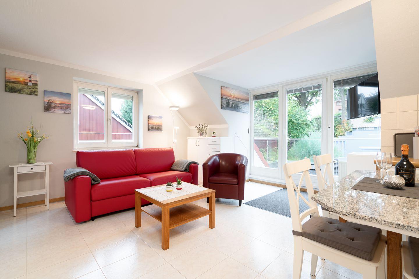 Das gemütliche Appartement Vittoria in Scharbeutz bietet auf ca. 45 m² Platz für bis zu 3 Personen und liegt nur rund 300 Meter vom Ostseestrand entfernt. Die Wohnung befindet sich im 1. Obergeschoss eines gepflegten Hauses und überzeugt durch ihre helle, freundliche Atmosphäre, klare Strukturen und den Zugang zu einer großen Dachterrasse (ca. 30 m²) mit wunderschönem Gartenblick – perfekt für entspannte Stunden an der frischen Ostseeluft.