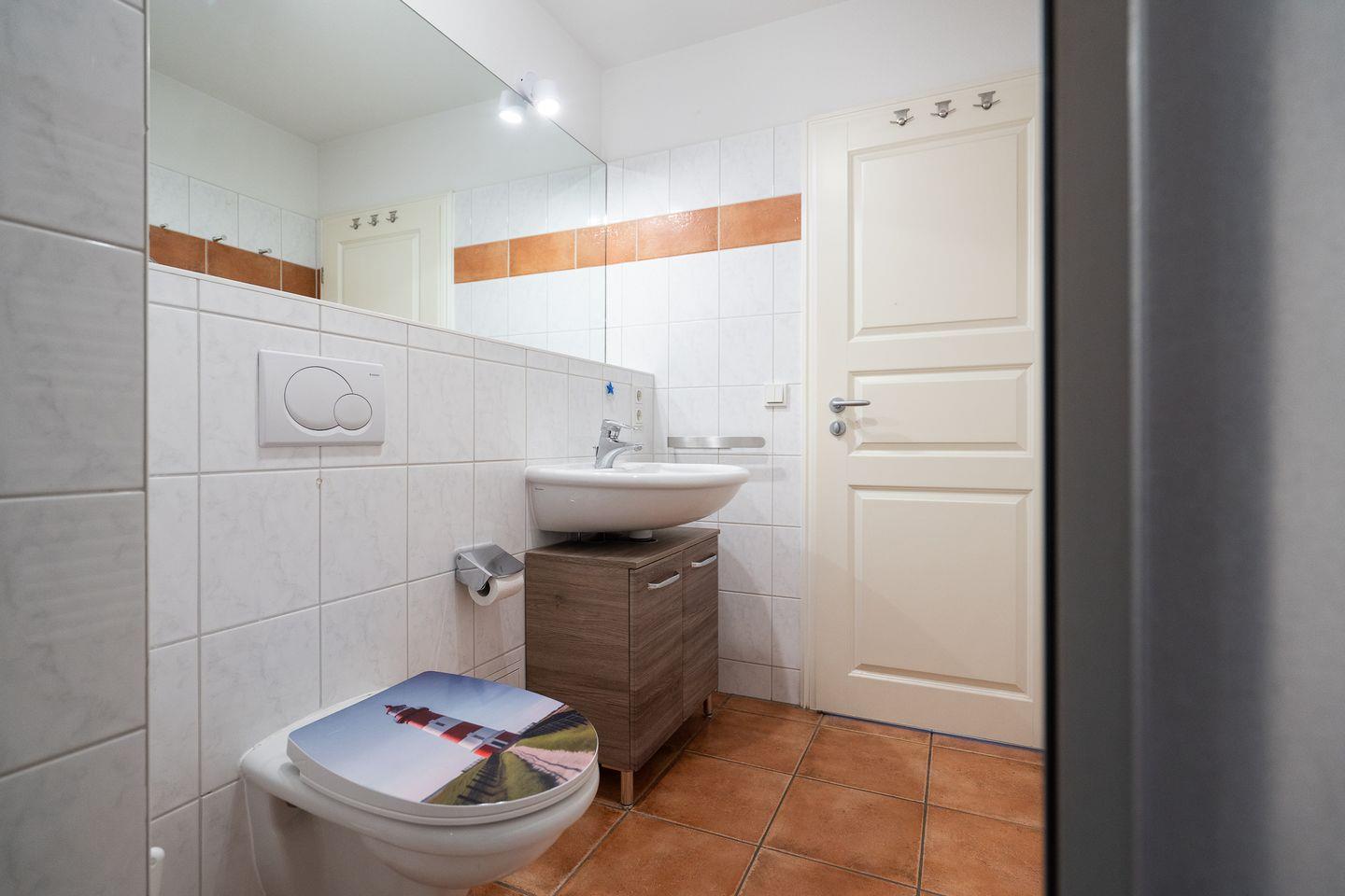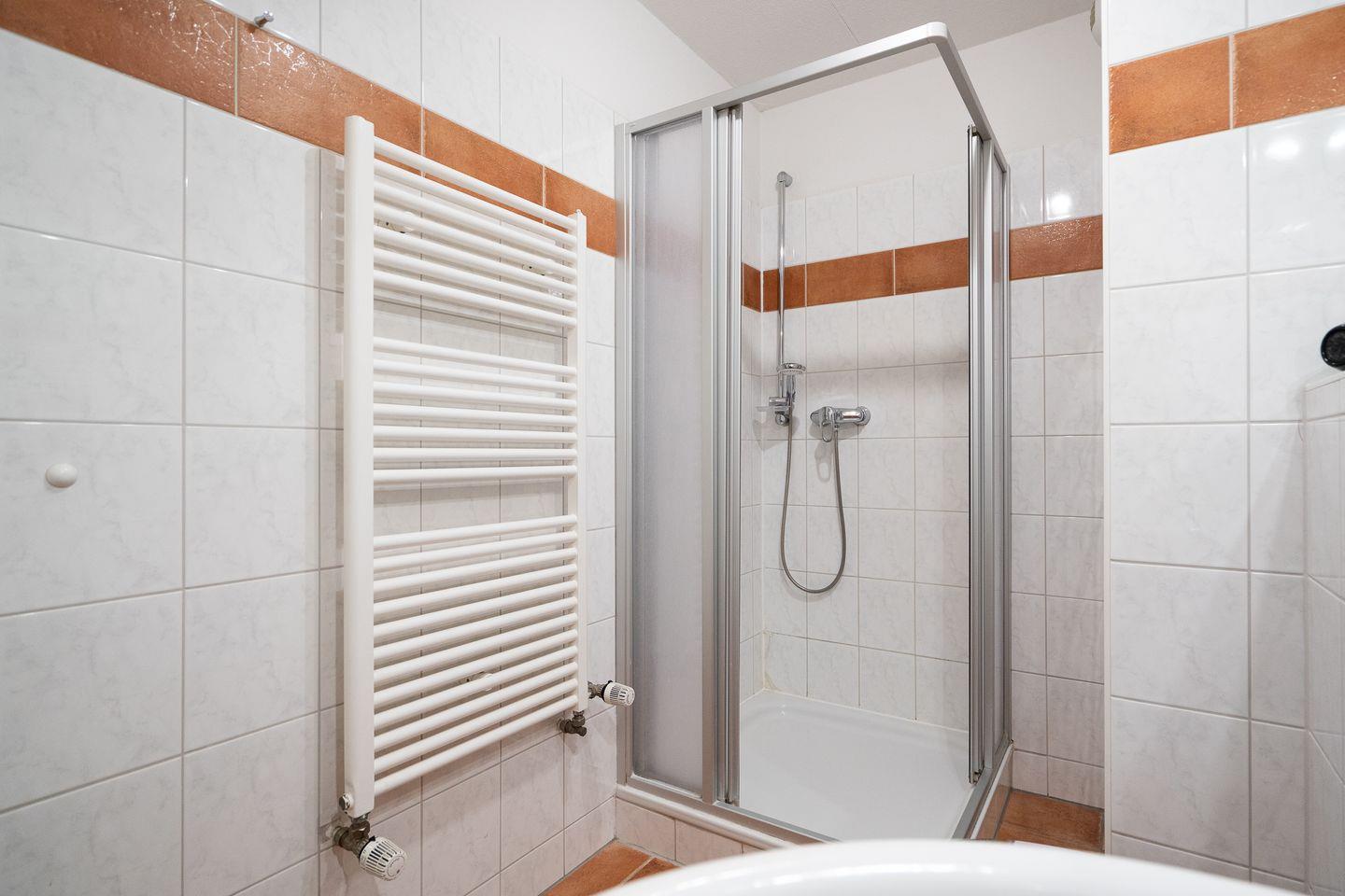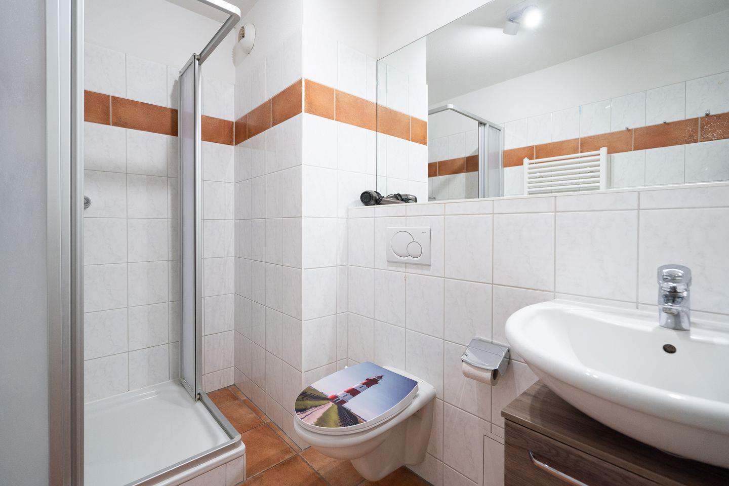Das Badezimmer ist mit einer Dusche ausgestattet. Ein Waschtisch mit Spiegel, Warmwasser, WC und Haartrockner vervollständigen die hochwertige Sanitärausstattung. Alle Fenster der Unterkunft verfügen über Sichtschutz, um Privatsphäre zu gewährleisten. Ein weiteres Highlight ist der schöne Balkon, zu dem Sie vom Wohnbereich aus Zugang haben. Hier können Sie die Sonne genießen oder in entspannter Atmosphäre den Tag ausklingen lassen.