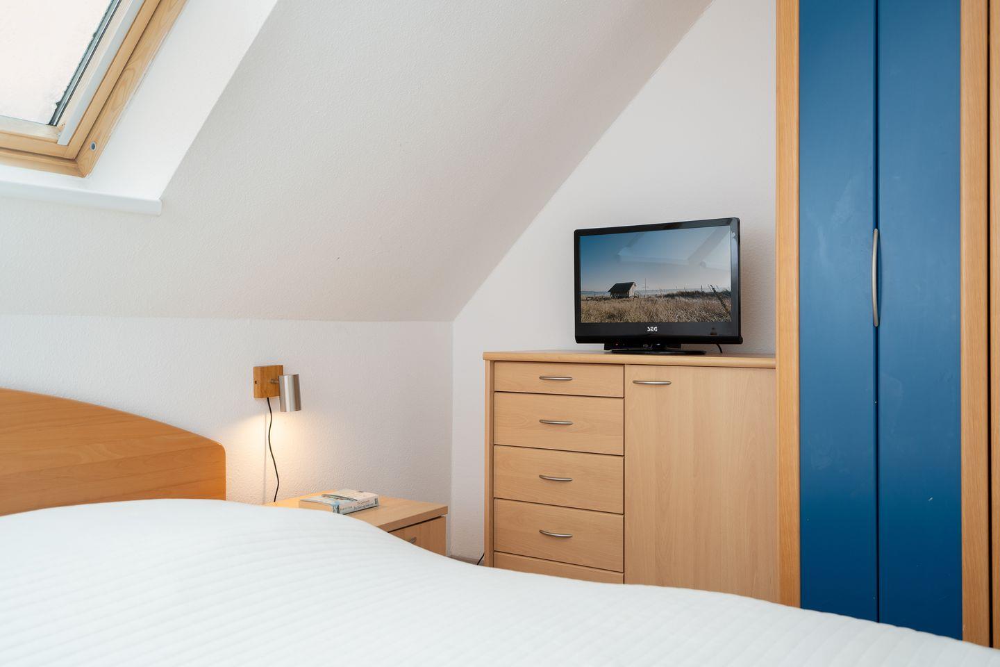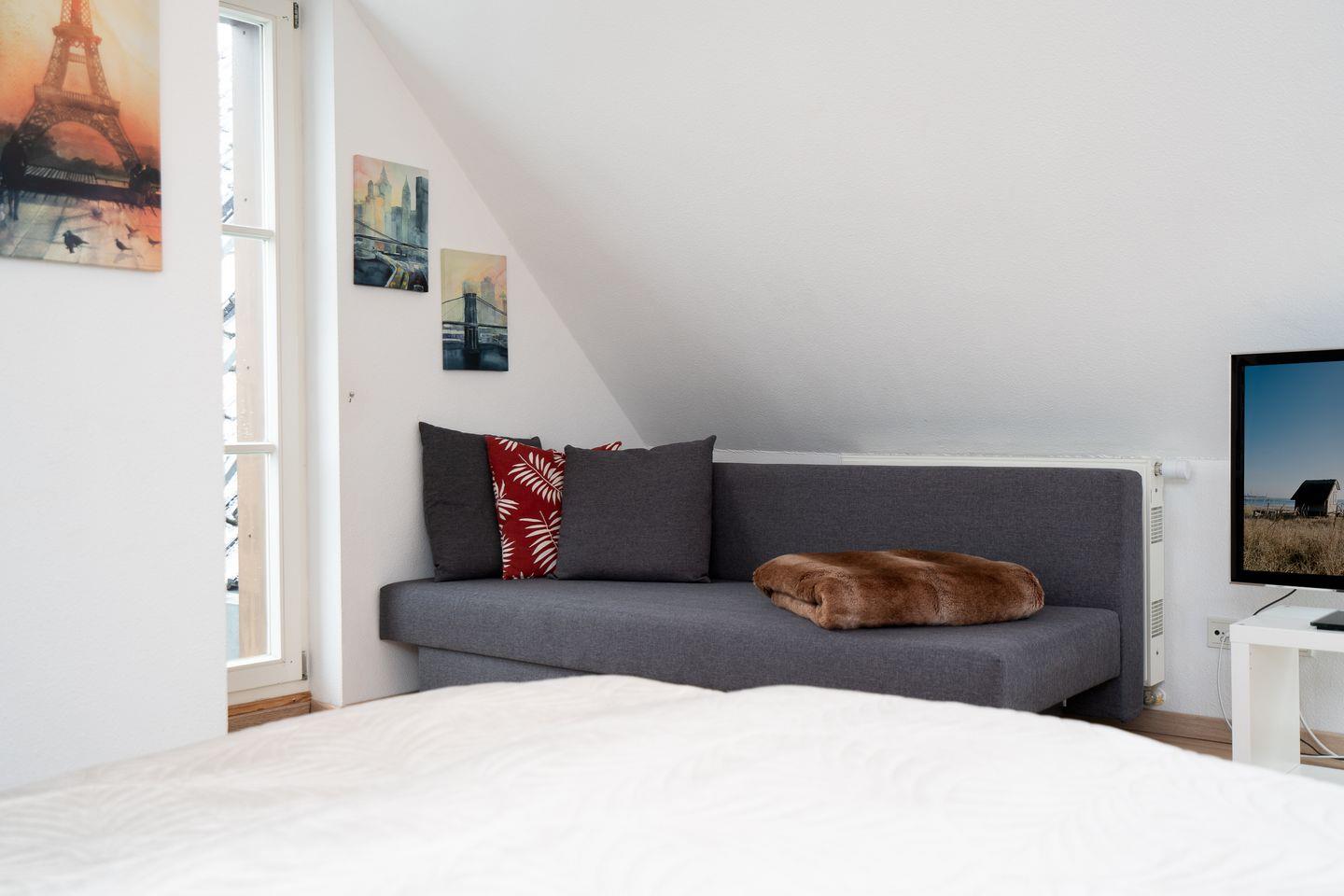 Der geräumige Wohn- und Schlafbereich in der 1. Etage verfügt über ein komfortables Doppelbett (140 x 200 cm), sowie ein Schlafsofa (130 cm x 185 cm). Auch dieser Bereich verfügt über ein TV-Gerät und einen kleinen Balkon.