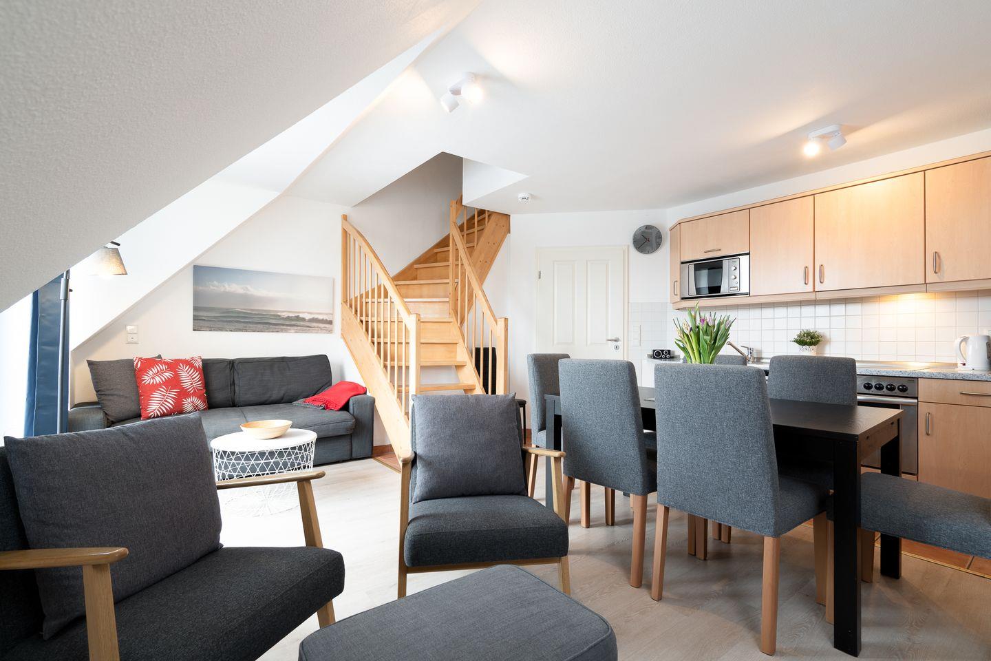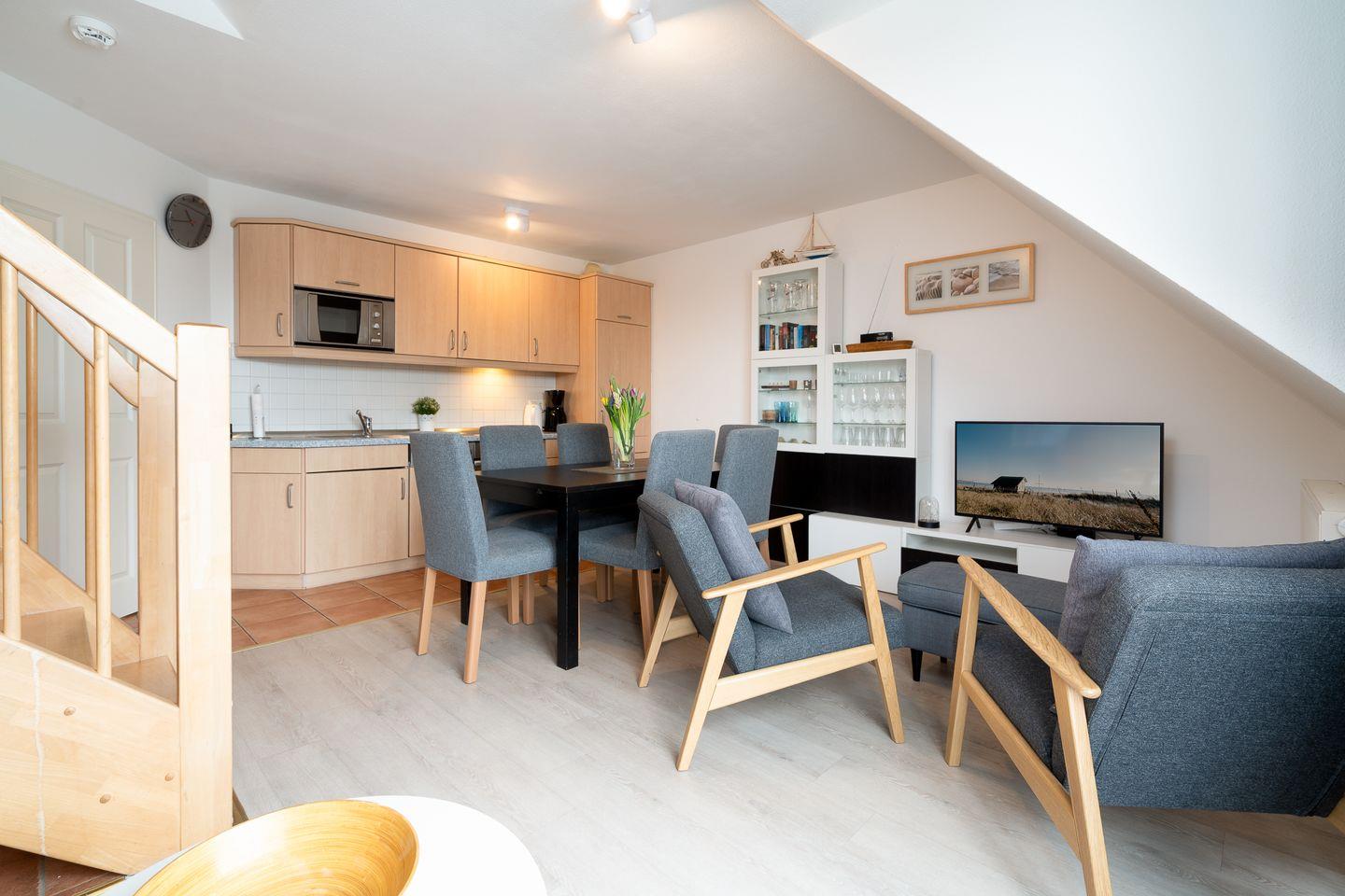 Das Wohnzimmer mit TV-Gerät und DVD-Spieler ist hell und einladend gestaltet und besticht durch eine gemütliche Sofaecke mit Sessel für entspannte Stunden. Der offene Wohnbereich integriert eine moderne Küche, die zum Wohnzimmer hin ausgerichtet ist. Die Ausstattung der Küche umfasst einen Ceranherd, Backofen, Mikrowelle, Kühlschrank mit Gefrierfach, Spülmaschine, Kaffeemaschine, Toaster, Küchenutensilien, sowie Geschirr und Besteck und ermöglicht komfortables Kochen – ob für kleine Snacks oder ausgedehnte Mahlzeiten. Am großzügigen Esstisch können Sie gemeinsam speisen. Das Schlafzimmer verfügt über ein bequemes Doppelbett (2x 90 cm x 200 cm), sowie ein TV-Gerät.