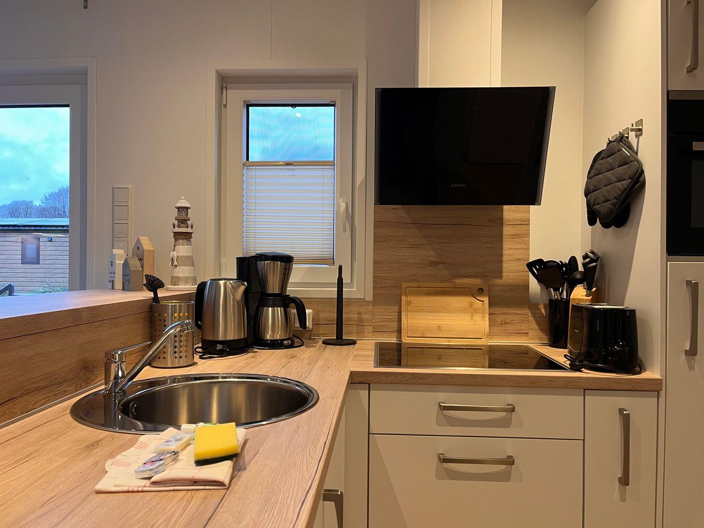Das Wohn- und Esszimmer ist mit gemütlicher Sofaecke, Esstisch und einem modernen Vinylboden ausgestattet. Ein Flachbild-TV mit Satellitenempfang sorgt ebenso wie kostenloses WLAN für Unterhaltung und Mediennutzung nach Ihren Wünschen. Die offen gehaltene Küche fügt sich nahtlos in den Wohnbereich ein und ist umfassend ausgestattet: Ceranherd, Backofen, Mikrowelle, Spülmaschine, Kühlschrank mit integriertem Gefrierfach, Kaffeemaschine, Wasserkocher, Toaster sowie vielfältige Küchenutensilien und eine Küchenmaschine lassen Ihnen bei der Zubereitung Ihrer Mahlzeiten alle Freiheiten. Für die gemeinsame Zeit bieten sich verschiedene Spiele an, die innerhalb des Hauses bereitgestellt werden.