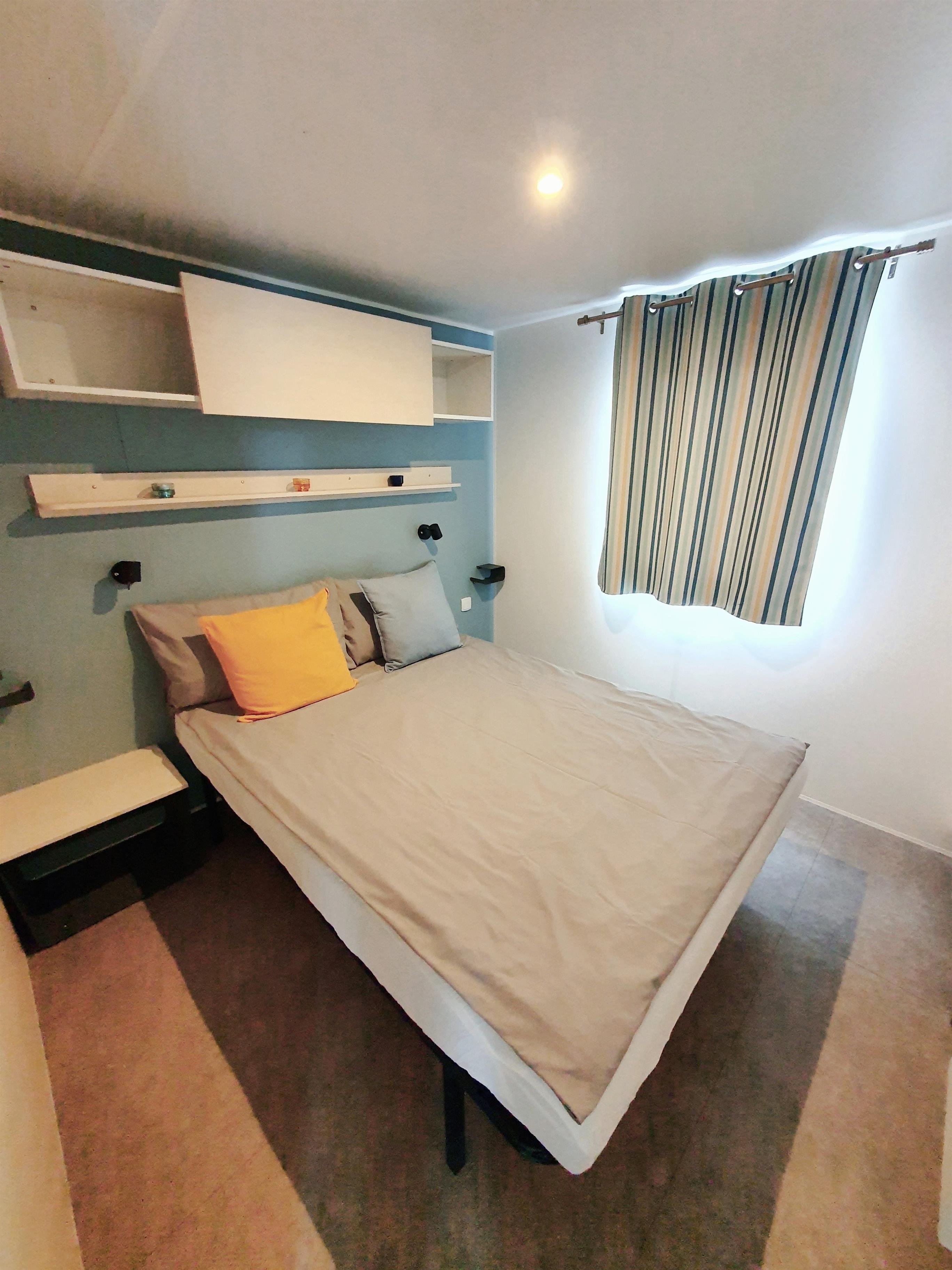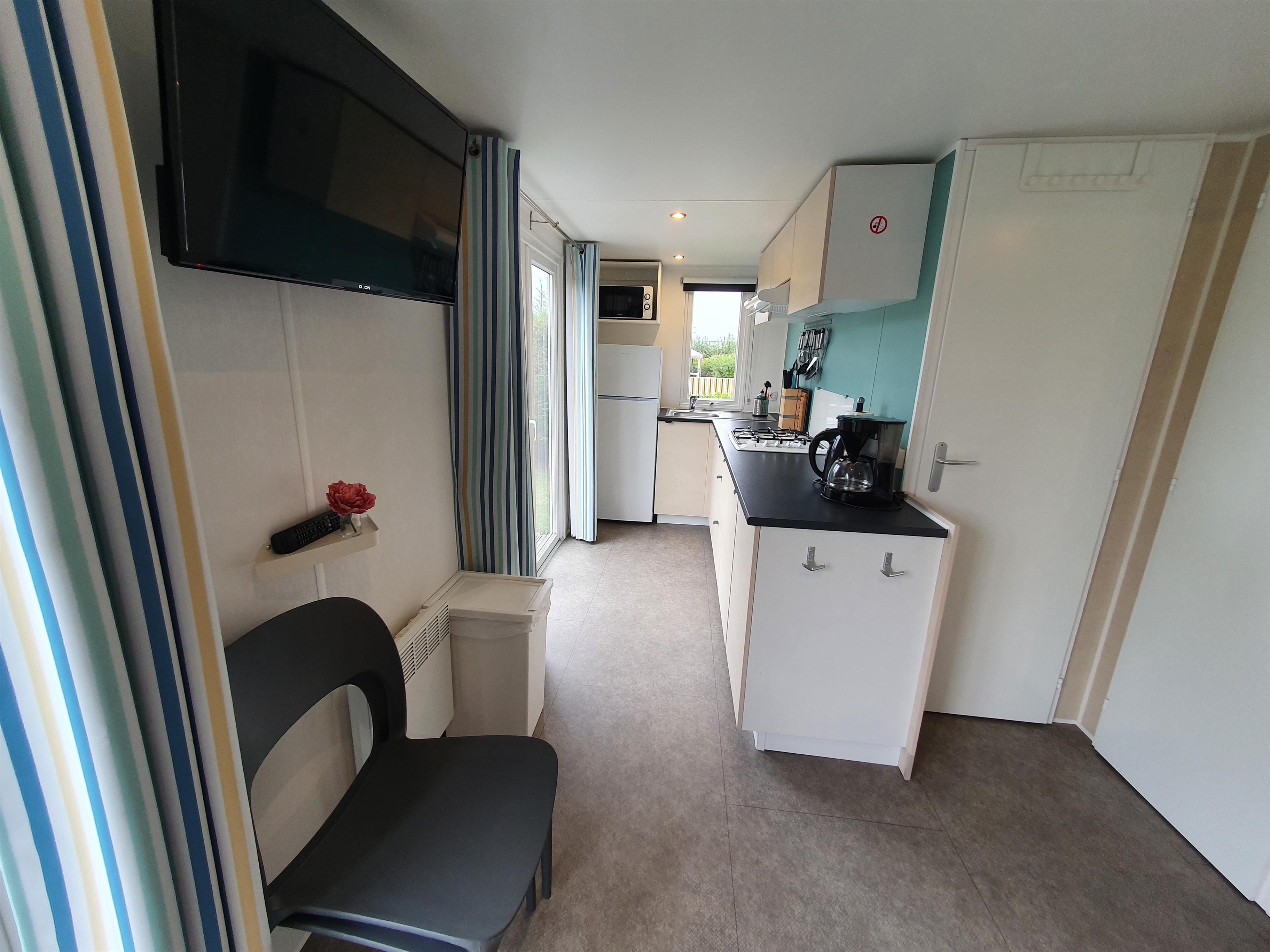 Unsere Mobilheime sind hell und modern ausgestattet und verfügen jeweils über einen kombinierten Wohn-/Essbereich mit integrierter Küchenzeile, 2-3 Schlafzimmern, 1-2 Bädern mit Dusche sowie 1-2 separaten WC. Eines der Bäder ist jeweils direkt von einem der Schlafzimmer aus zugänglich (en-suite). Auf der Terrasse stehen Ihnen ein eigener Strandkorb, ein Tisch mit Bänken und Sonnenschirm sowie ein Grill zur Verfügung. Ein kleiner Gartenbereich sorgt für weitere Entspannungsmöglichkeiten. Ihr Auto parken Sie direkt am Mobilheim.