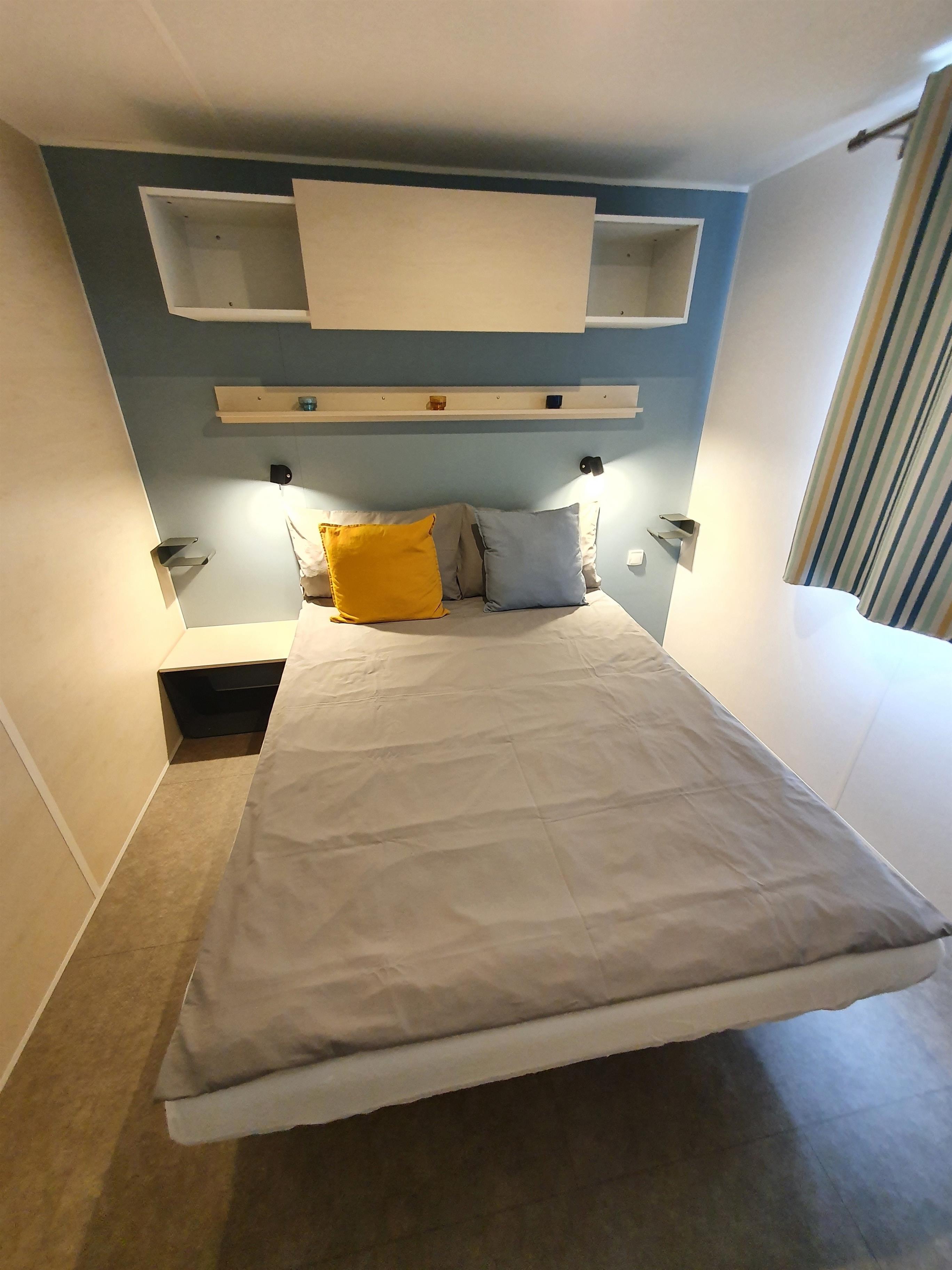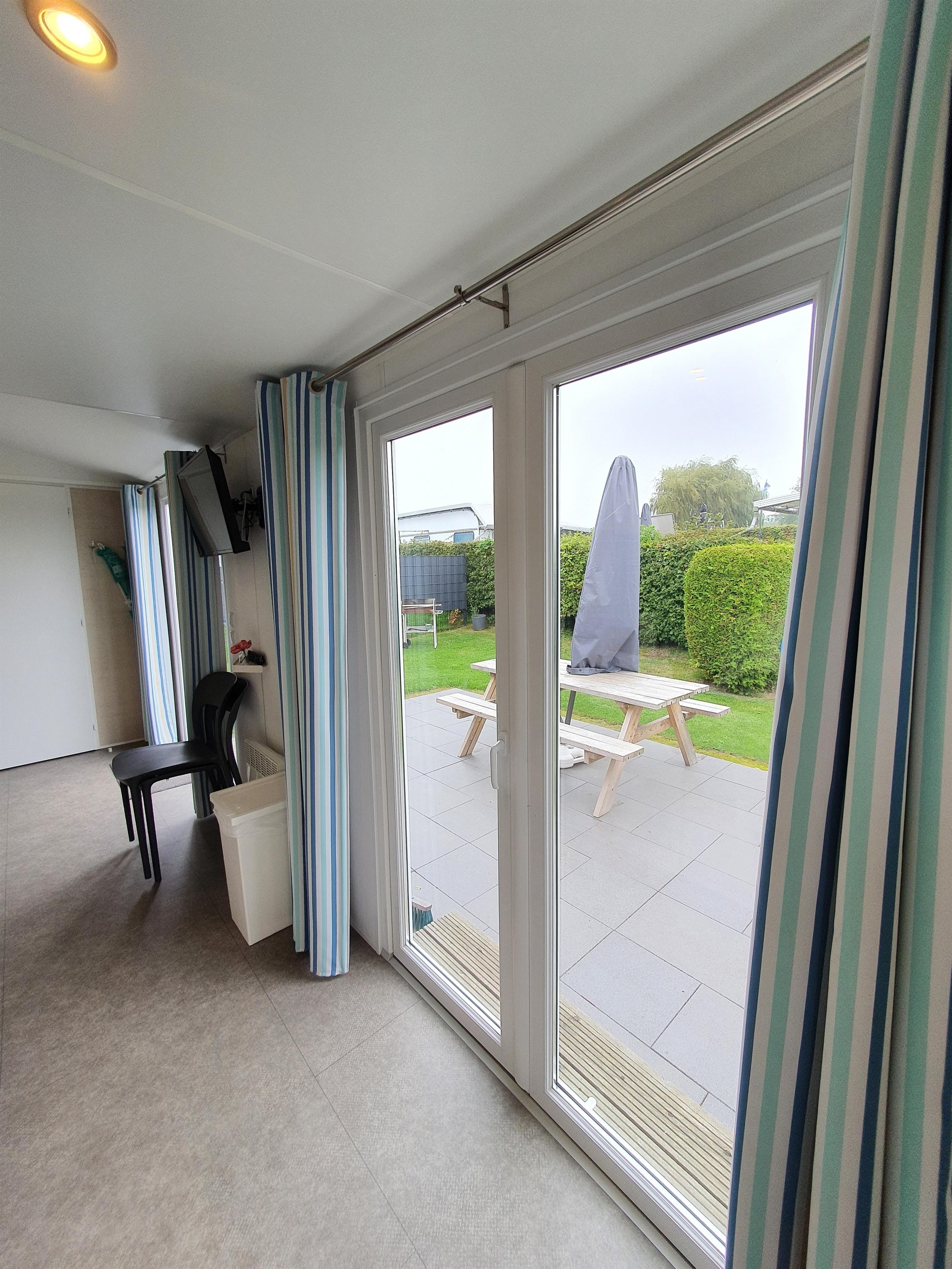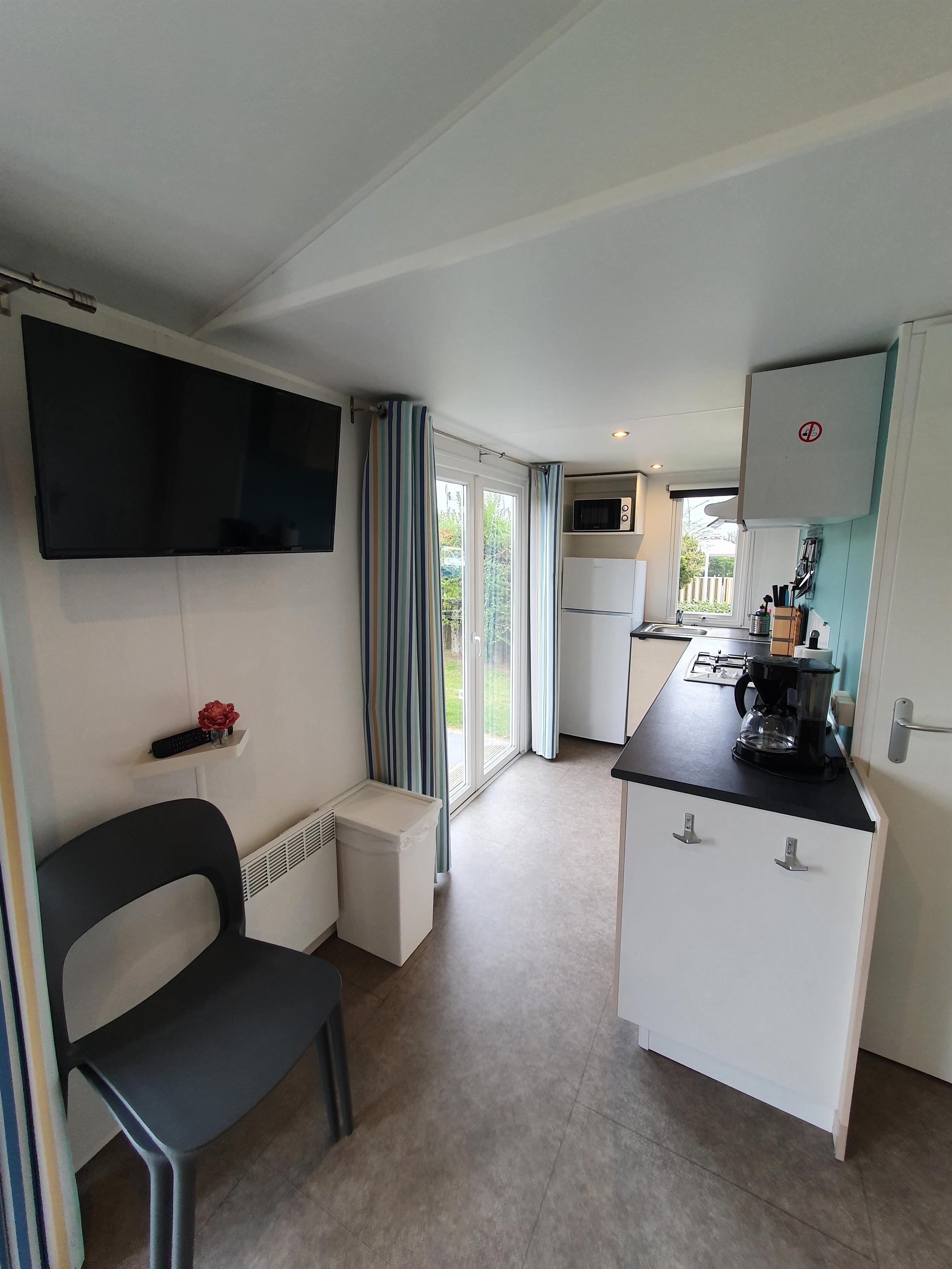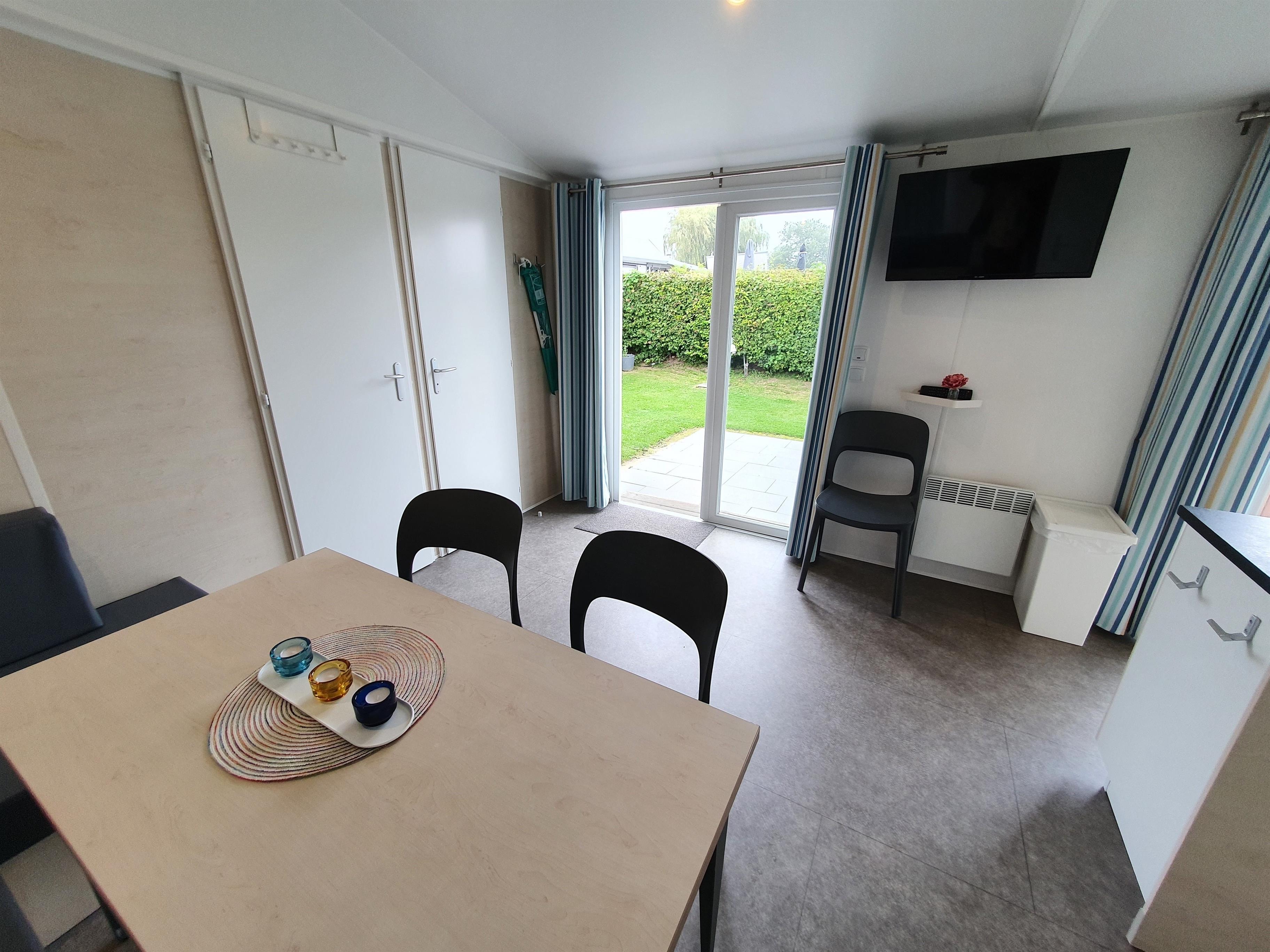 Unsere Mobilheime sind hell und modern ausgestattet und verfügen jeweils über einen kombinierten Wohn-/Essbereich mit integrierter Küchenzeile, 2-3 Schlafzimmern, 1-2 Bädern mit Dusche sowie 1-2 separaten WC. Eines der Bäder ist jeweils direkt von einem der Schlafzimmer aus zugänglich (en-suite). Auf der Terrasse stehen Ihnen ein eigener Strandkorb, ein Tisch mit Bänken und Sonnenschirm sowie ein Grill zur Verfügung. Ein kleiner Gartenbereich sorgt für weitere Entspannungsmöglichkeiten. Ihr Auto parken Sie direkt am Mobilheim.