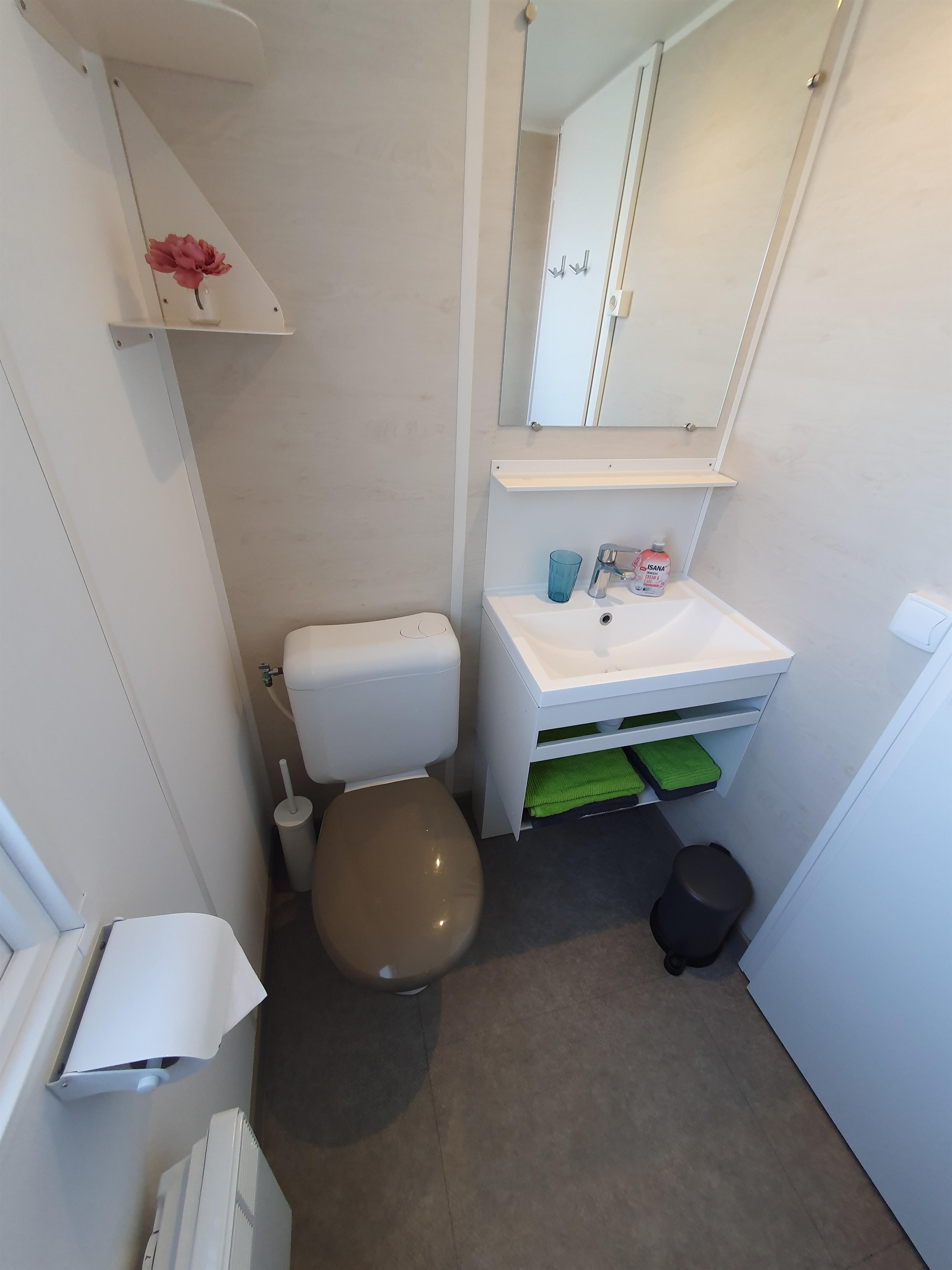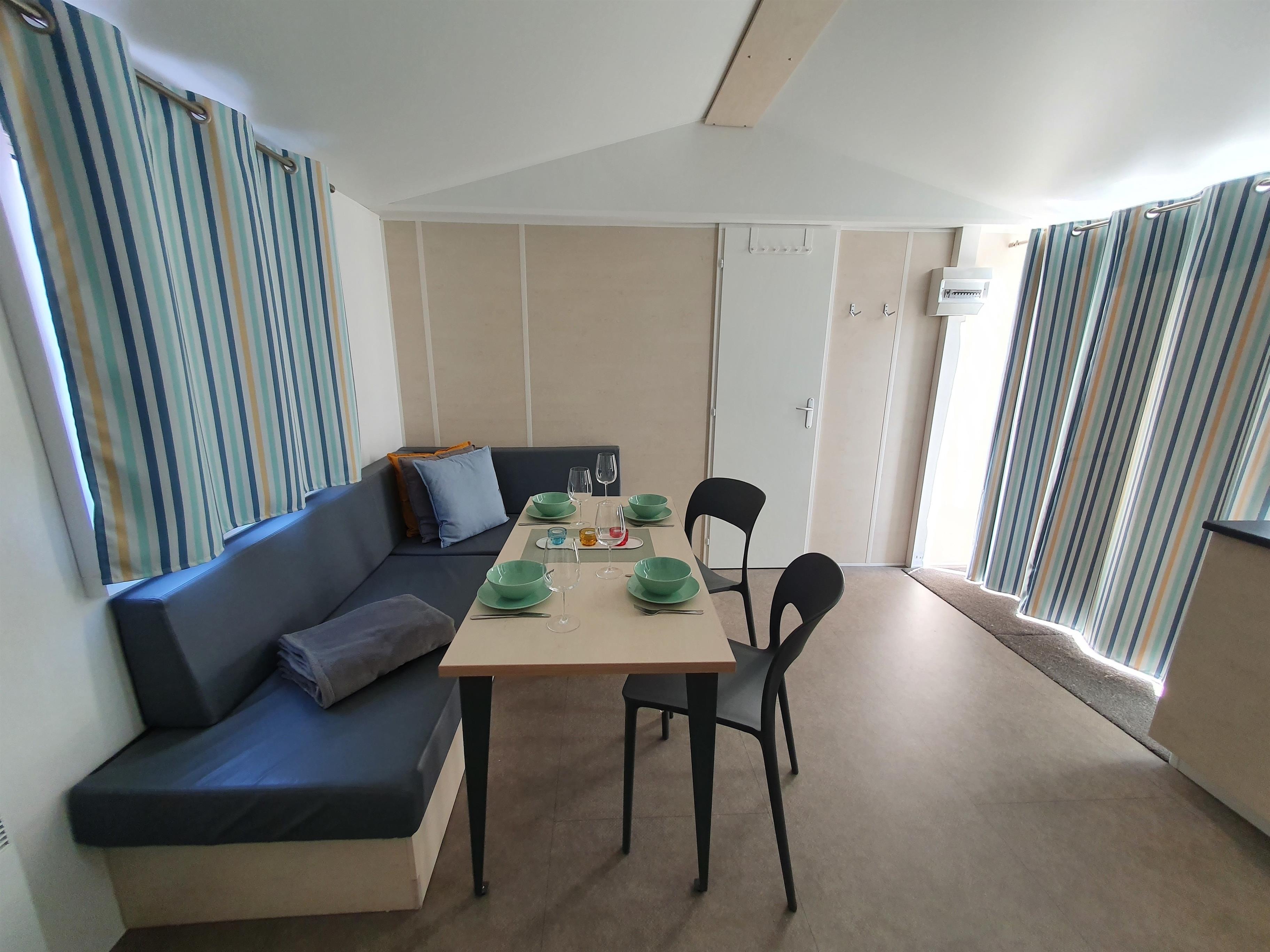 Unsere Mobilheime sind hell und modern ausgestattet und verfügen jeweils über einen kombinierten Wohn-/Essbereich mit integrierter Küchenzeile, 2-3 Schlafzimmern, 1-2 Bädern mit Dusche sowie 1-2 separaten WC. Eines der Bäder ist jeweils direkt von einem der Schlafzimmer aus zugänglich (en-suite). Auf der Terrasse stehen Ihnen ein eigener Strandkorb, ein Tisch mit Bänken und Sonnenschirm sowie ein Grill zur Verfügung. Ein kleiner Gartenbereich sorgt für weitere Entspannungsmöglichkeiten. Ihr Auto parken Sie direkt am Mobilheim.