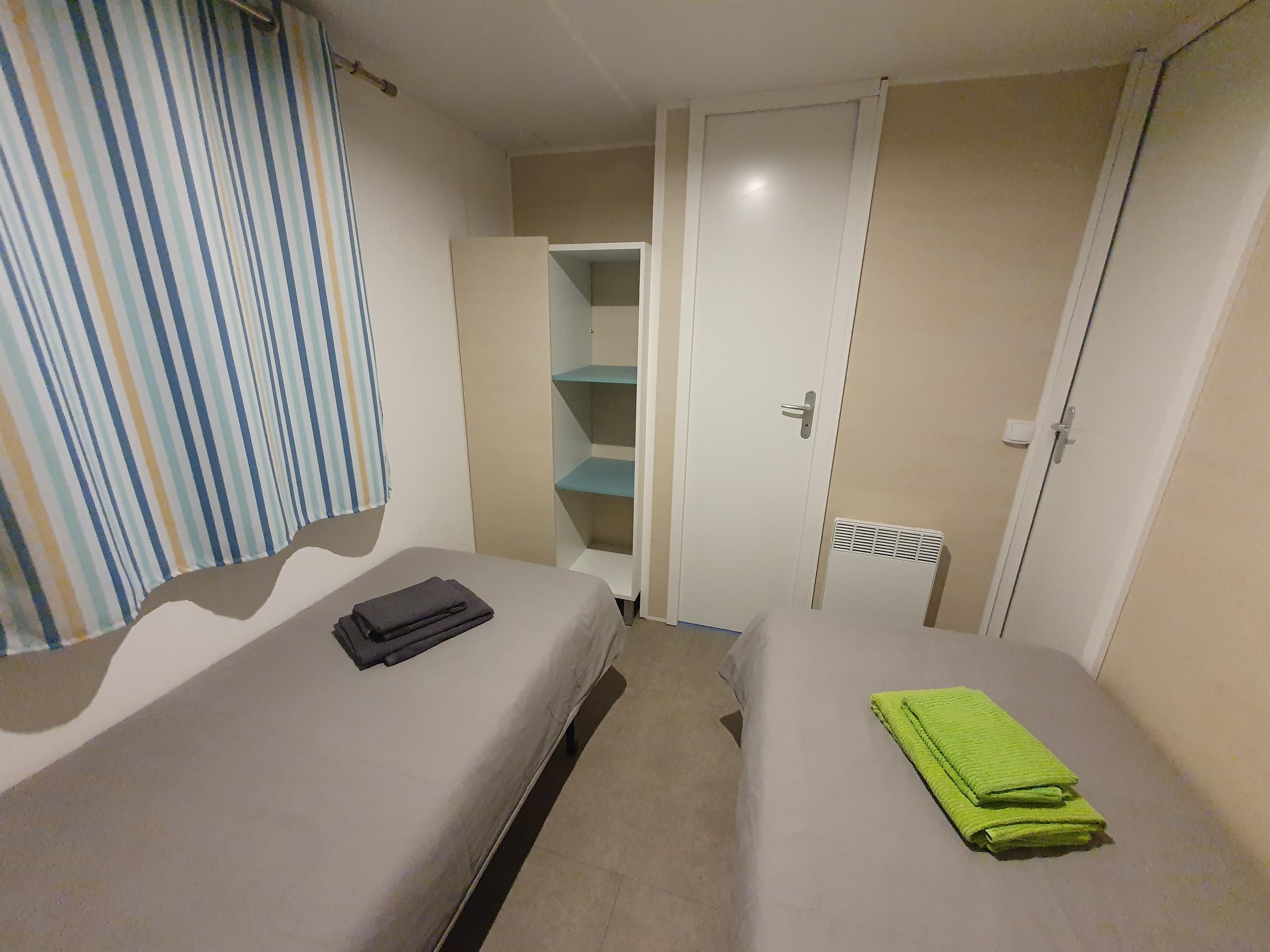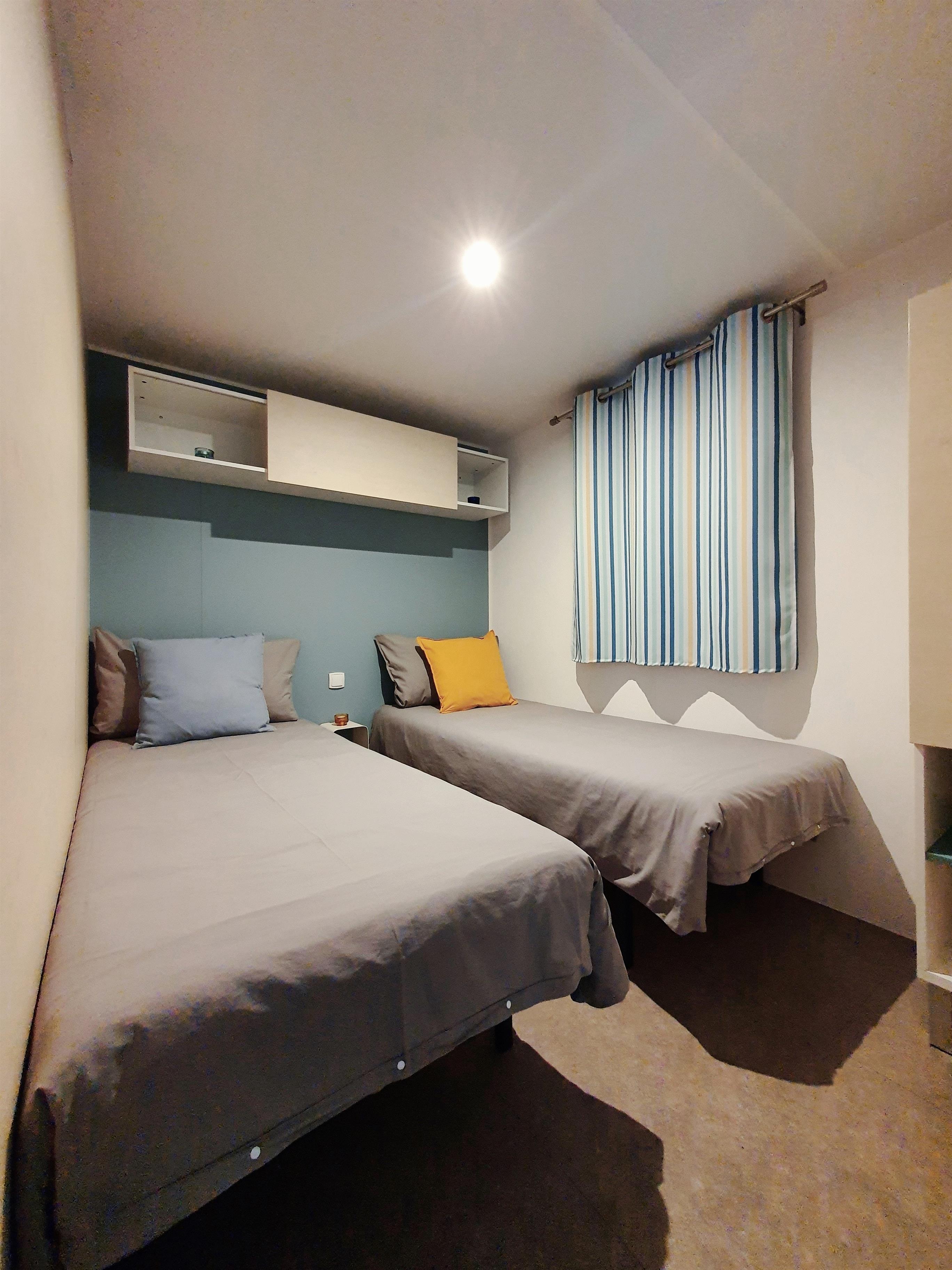 Unsere Mobilheime sind hell und modern ausgestattet und verfügen jeweils über einen kombinierten Wohn-/Essbereich mit integrierter Küchenzeile, 2-3 Schlafzimmern, 1-2 Bädern mit Dusche sowie 1-2 separaten WC. Eines der Bäder ist jeweils direkt von einem der Schlafzimmer aus zugänglich (en-suite). Auf der Terrasse stehen Ihnen ein eigener Strandkorb, ein Tisch mit Bänken und Sonnenschirm sowie ein Grill zur Verfügung. Ein kleiner Gartenbereich sorgt für weitere Entspannungsmöglichkeiten. Ihr Auto parken Sie direkt am Mobilheim.