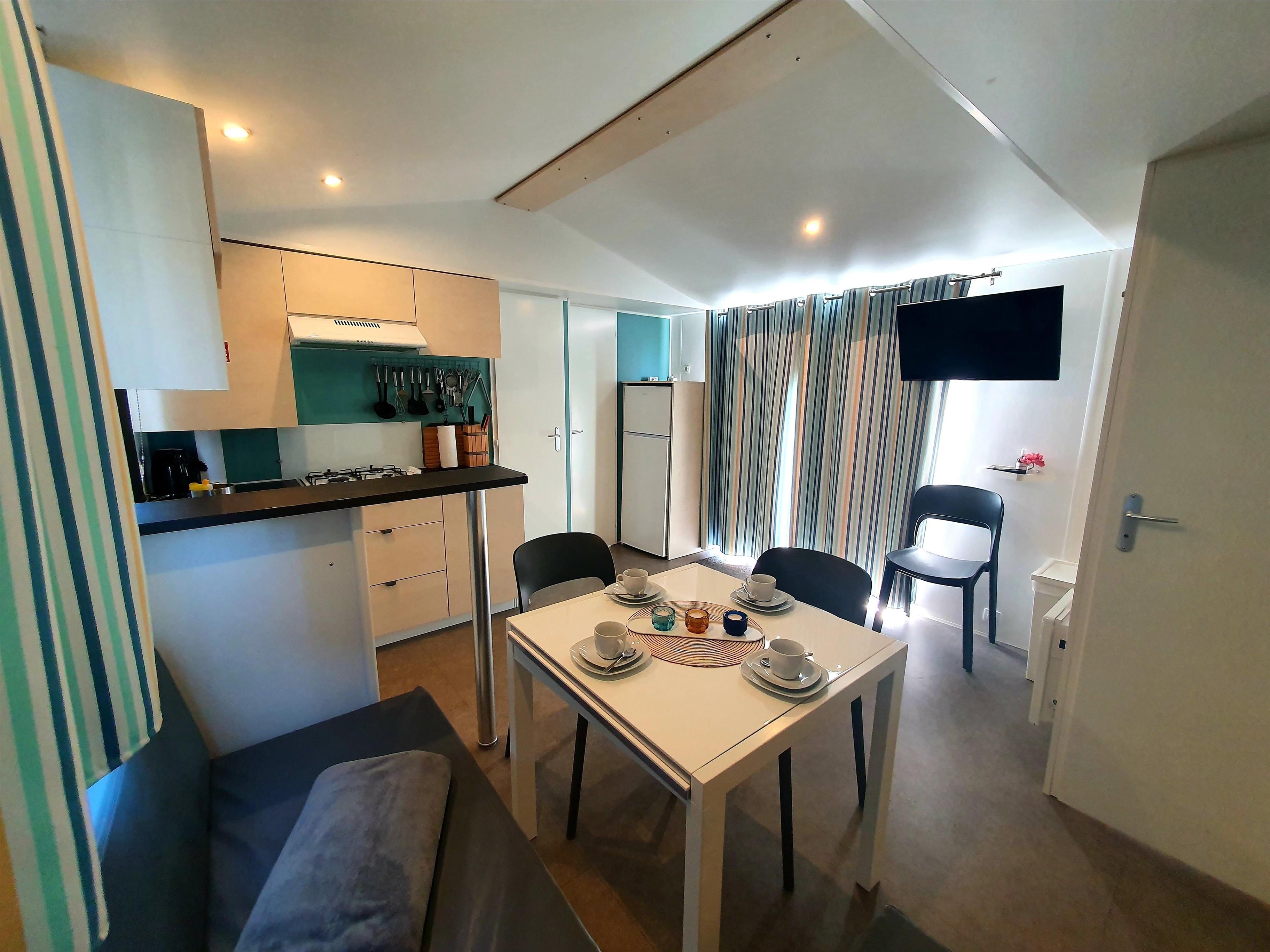 Unsere Mobilheime sind hell und modern ausgestattet und verfügen jeweils über einen kombinierten Wohn-/Essbereich mit integrierter Küchenzeile, 2-3 Schlafzimmern, 1-2 Bädern mit Dusche sowie 1-2 separaten WC. Eines der Bäder ist jeweils direkt von einem der Schlafzimmer aus zugänglich (en-suite). Auf der Terrasse stehen Ihnen ein eigener Strandkorb, ein Tisch mit Bänken und Sonnenschirm sowie ein Grill zur Verfügung. Ein kleiner Gartenbereich sorgt für weitere Entspannungsmöglichkeiten. Ihr Auto parken Sie direkt am Mobilheim.