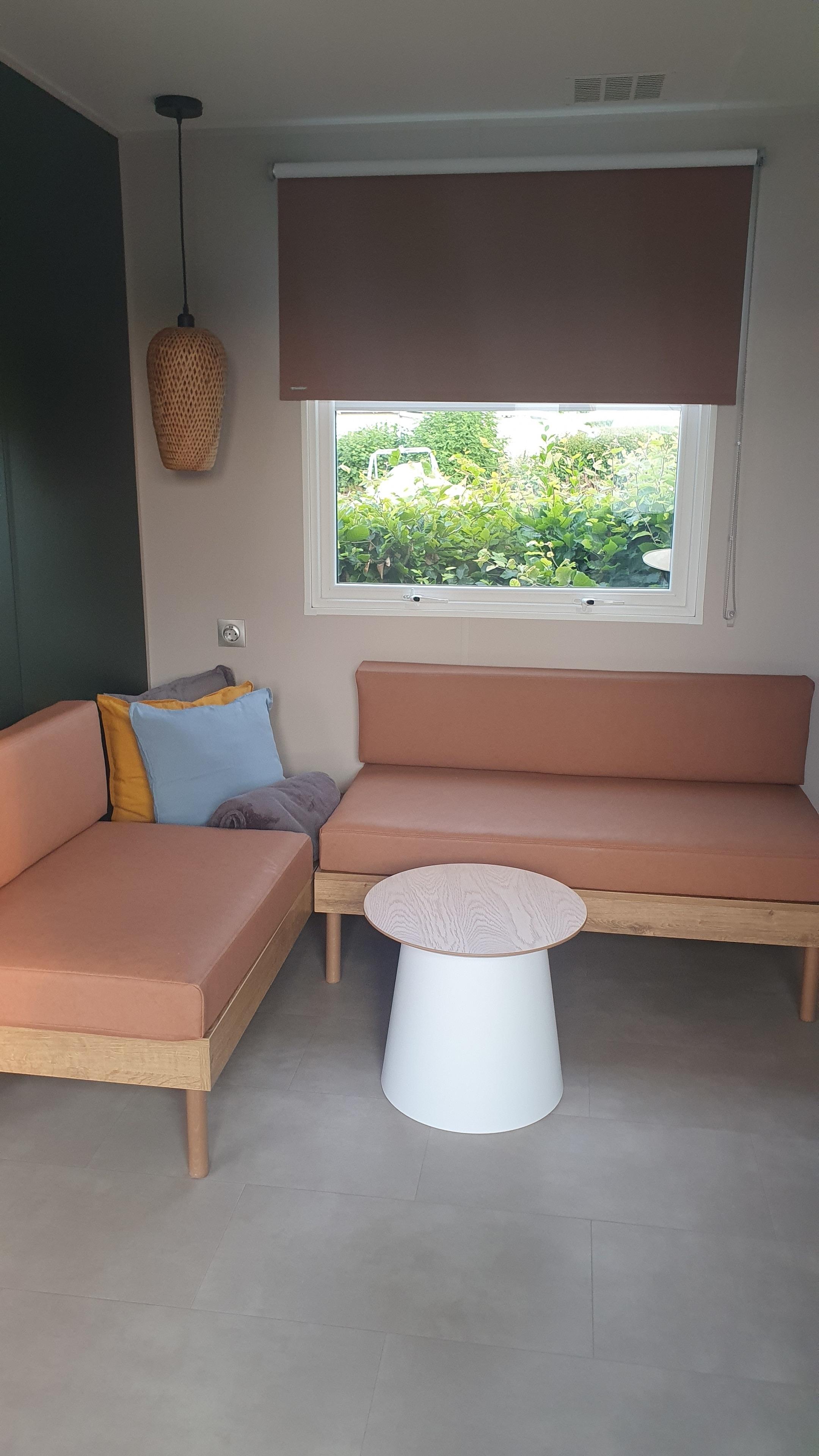 Unsere Mobilheime sind hell und modern ausgestattet und verfügen jeweils über einen kombinierten Wohn-/Essbereich mit integrierter Küchenzeile, 2-3 Schlafzimmern, 1-2 Bädern mit Dusche sowie 1-2 separaten WC. Eines der Bäder ist jeweils direkt von einem der Schlafzimmer aus zugänglich (en-suite). Auf der Terrasse stehen Ihnen ein eigener Strandkorb, ein Tisch mit Bänken und Sonnenschirm sowie ein Grill zur Verfügung. Ein kleiner Gartenbereich sorgt für weitere Entspannungsmöglichkeiten. Ihr Auto parken Sie direkt am Mobilheim.