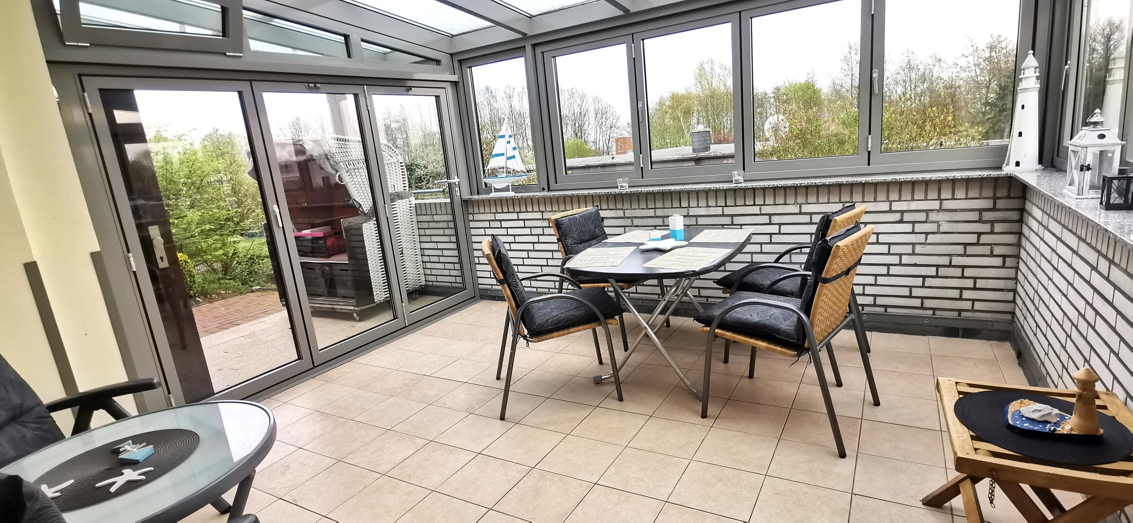 Hervorzuheben ist der wunderschöne Wintergarten, in dem Sie wirklich bei jedem Wetter die Aussicht und die frische Meerluft genießen können. Da er mit einer außen liegenden Markise beschattet wird und rundherum eine Faltschiebeanlage hat, macht er auch bei voller Sonne Freude.
