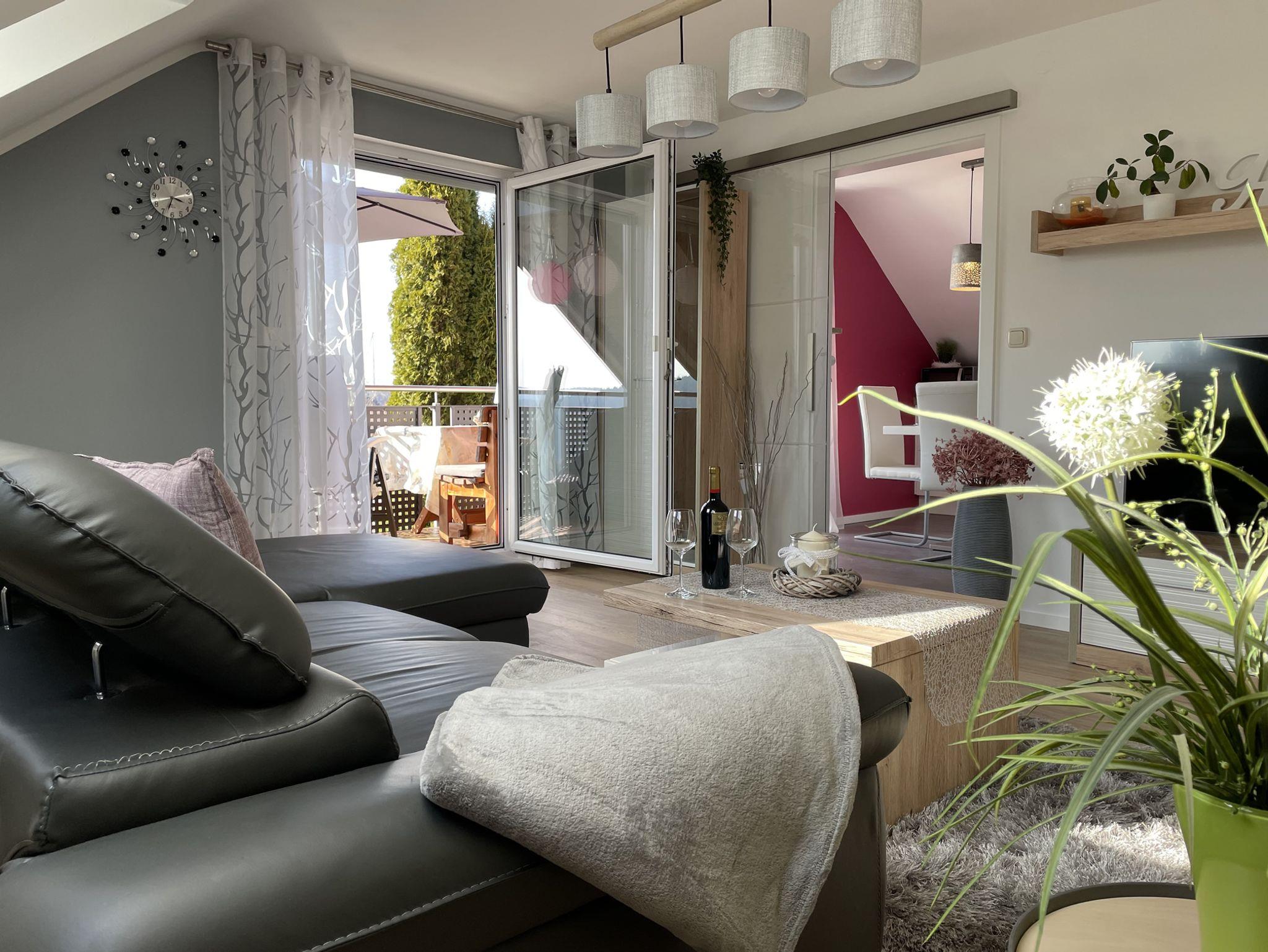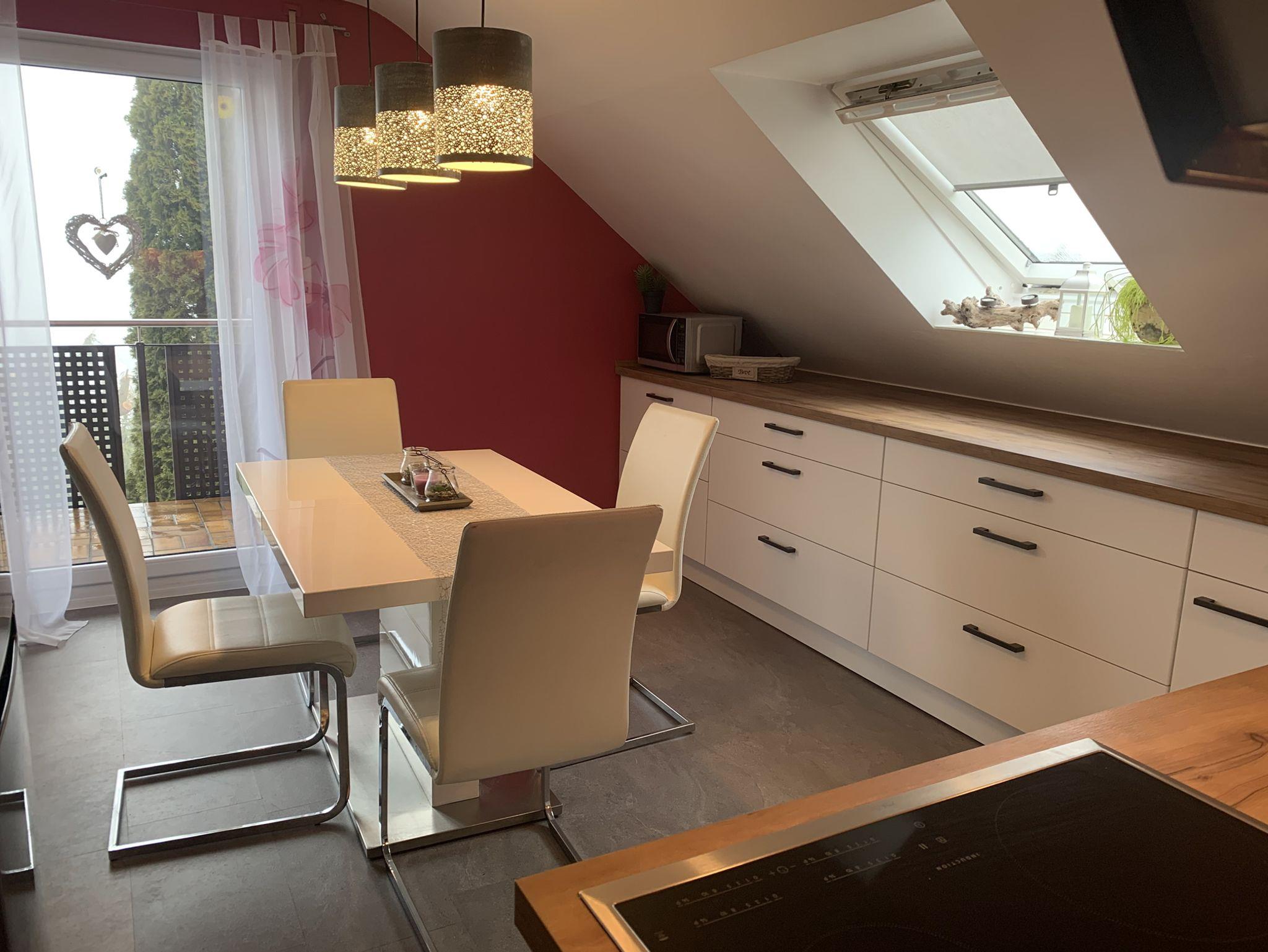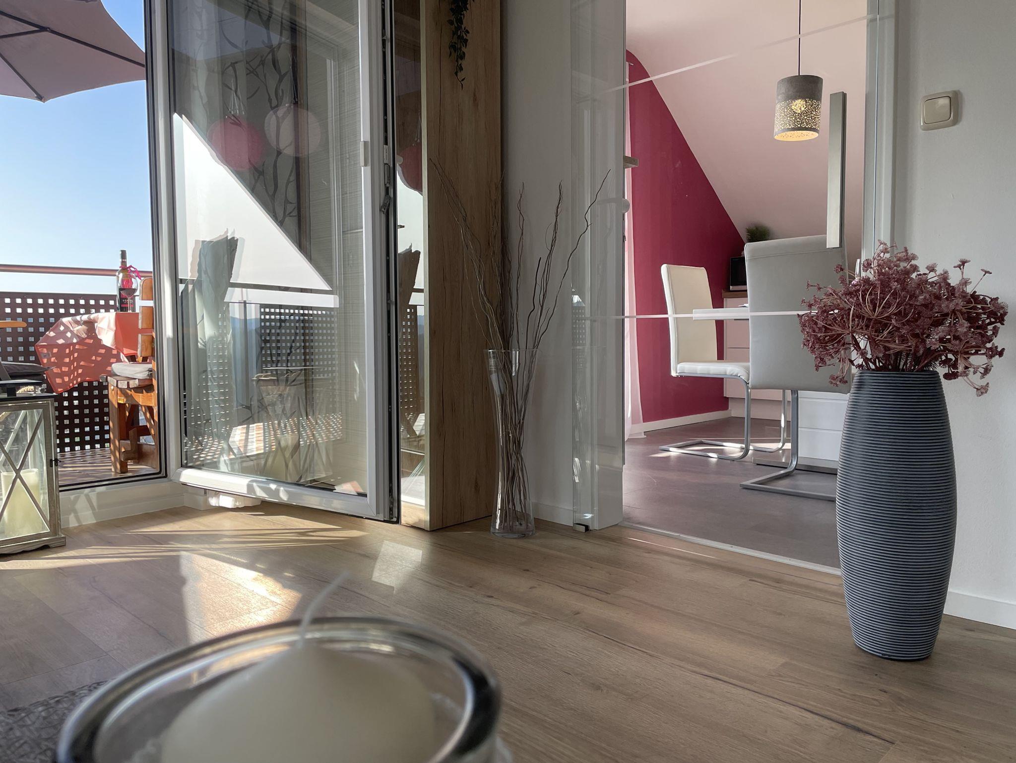Diese 4 Sterne Ferienwohnung liegt im 1. Stock mit gemütlichen Dachschrägen. Egal, ob Sie auf dem Balkon zur Ostseite frühstücken wollen, oder doch lieber auf der überdachten Loggia (Süd-West), dass ist Ihre Entscheidung. Da in dieser Ferienwohnung keine Terrasse zur Verfügung steht, können Sie unseren 1200qm großen Garten mitbenutzen. Zwei Holzliegen stehen Ihnen zur Verfügung. Weiterhin befindet sich auf der Loggia ein Elektrogrill.