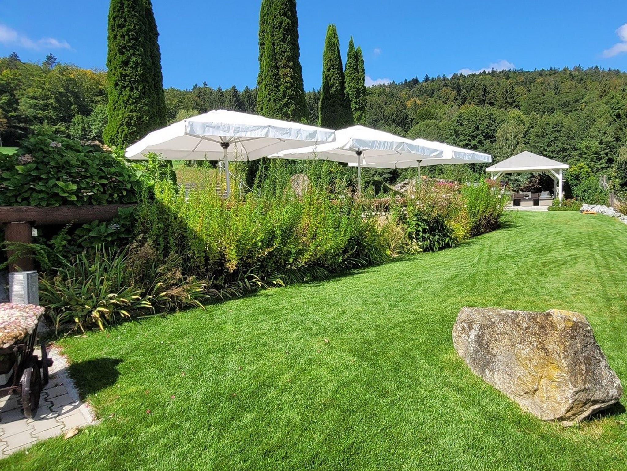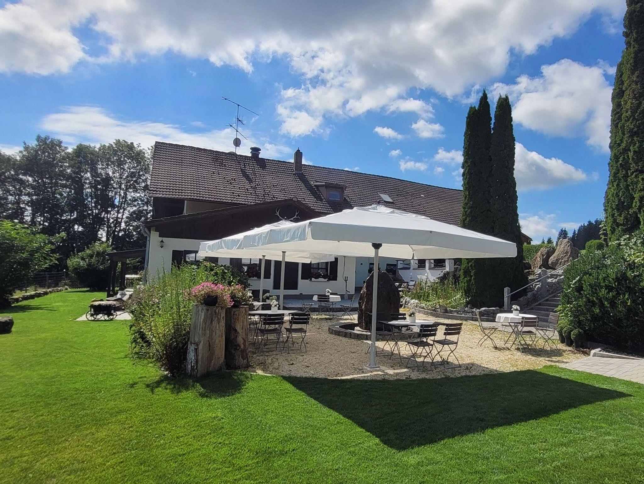 Unser idyllisches Landhaus (Pension Garni) liegt oberhalb der Nebelgrenze, in traumhafter Alleinlage auf dem Berg und ist umgeben von Wald, Wiesen und dem hauseigenen Rothirschgehege. Im Herbst ist der Mischwald besonders traumhaft. Mediterane Atmosphäre im Feng-Shui Garten.