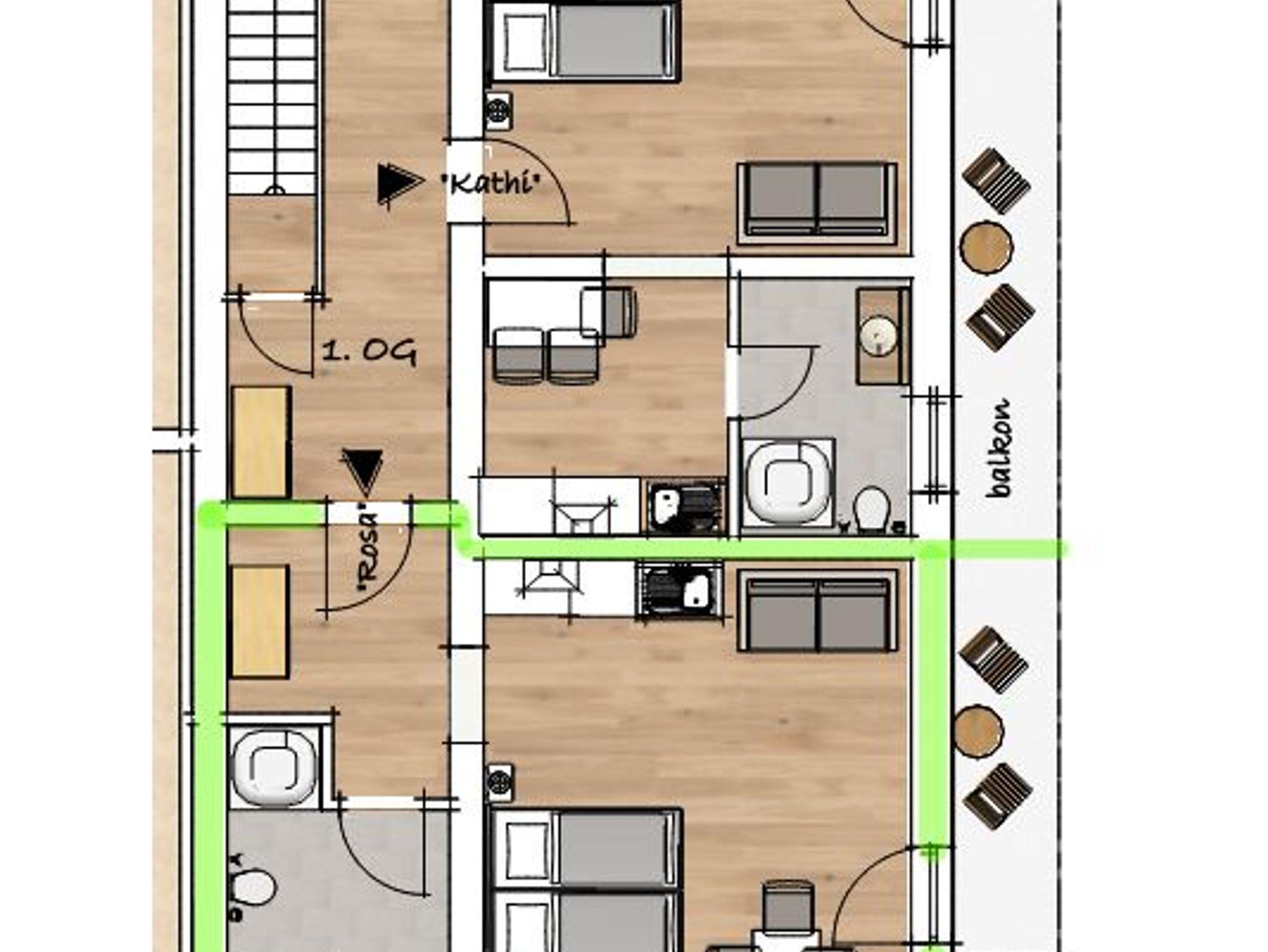 Unser Apartment Rosa mit einer Größe von ca. 35qm und Balkon befindet sich im 1.Obergeschoss.