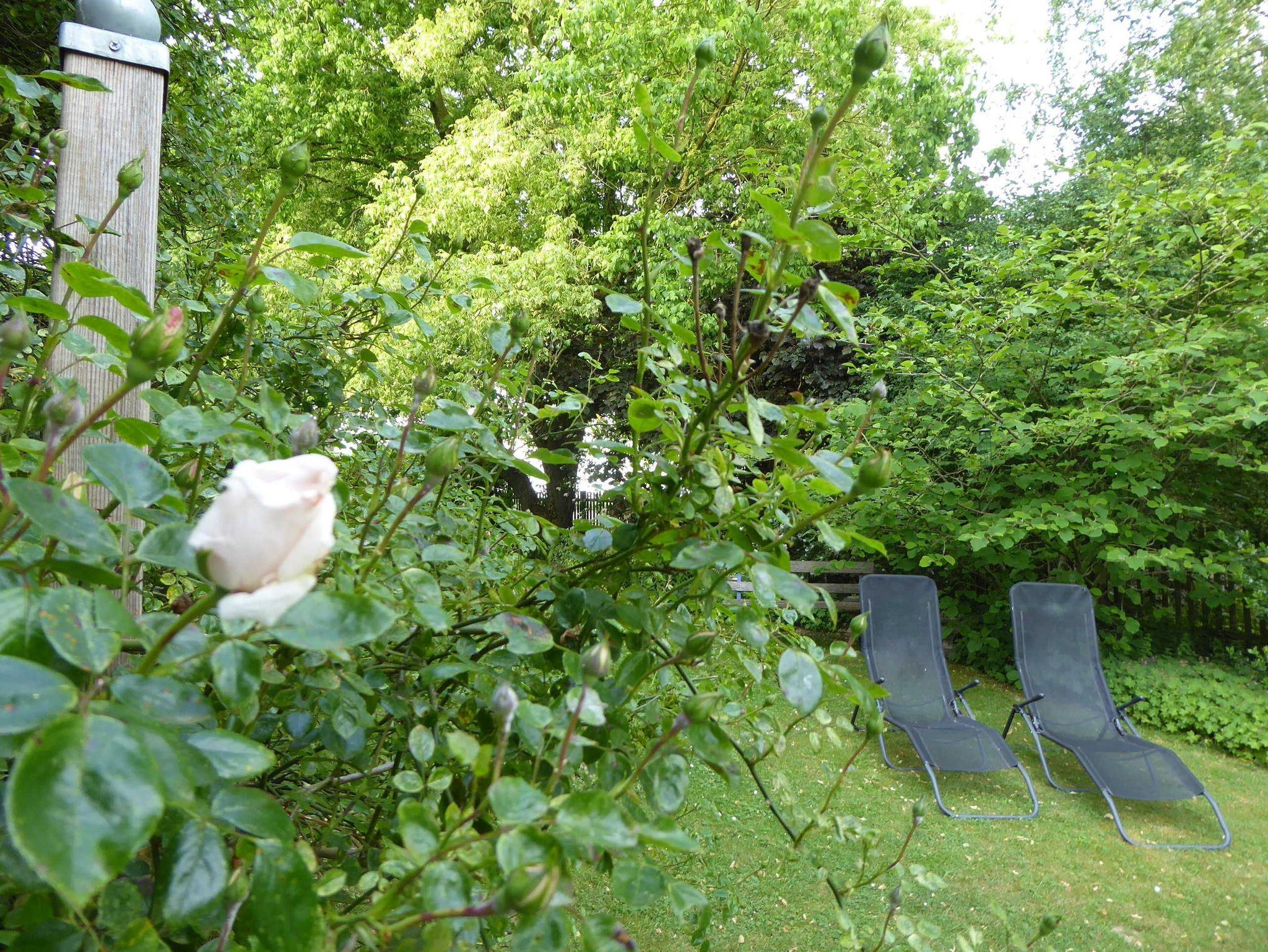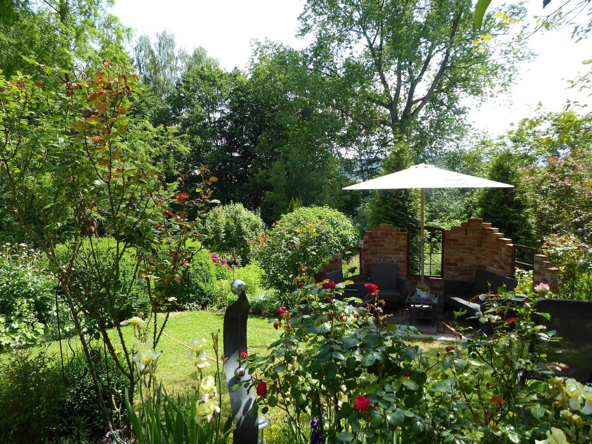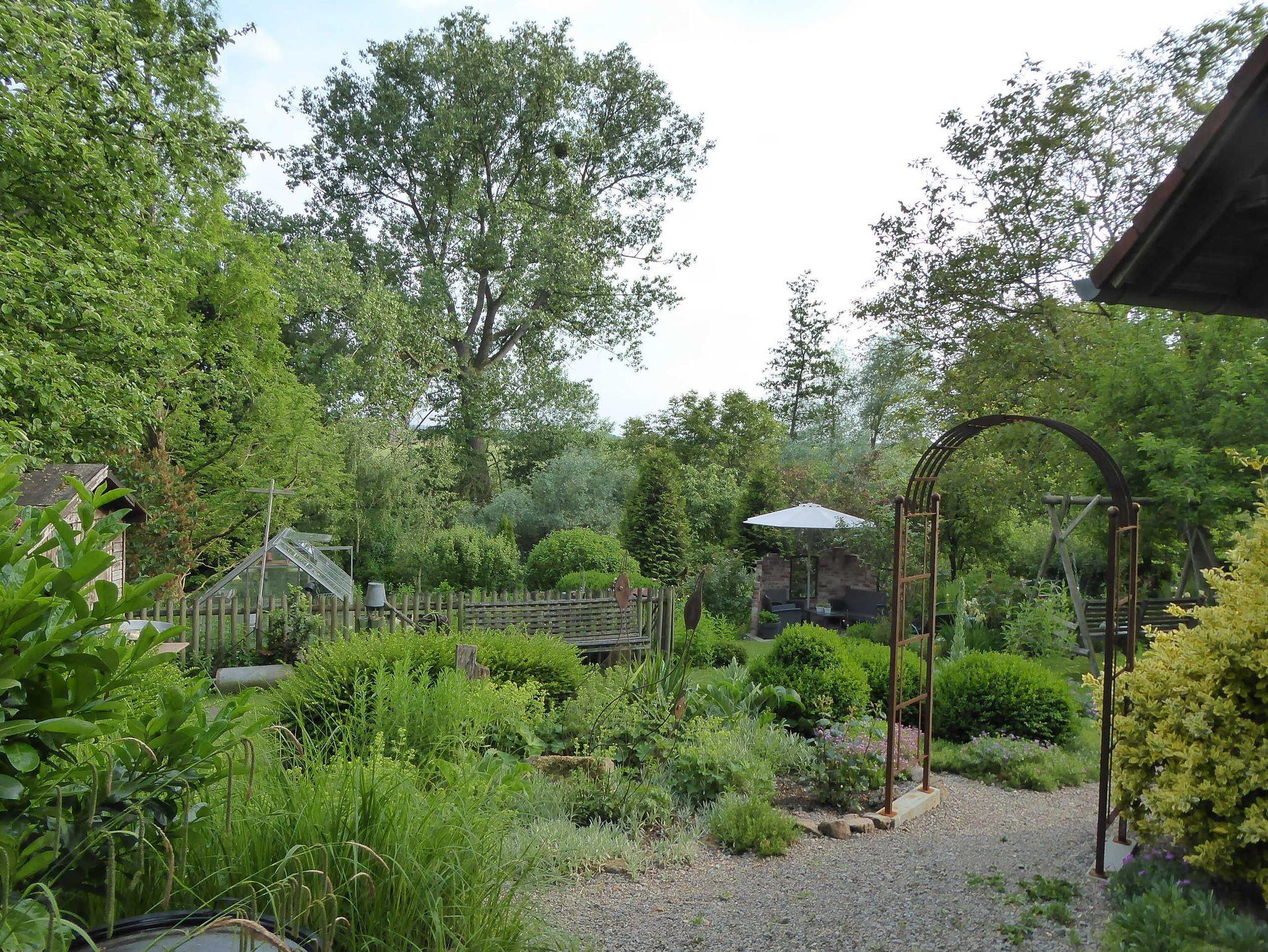 Wenige Meter hinter dem Haus der Ferienwohnungen befindet sich ein großer sehr gepflegter Garten, der mit seinem alten Baumbestand, den liebevoll gestalteten Blumenbeeten und Sitzgelegenheiten genug Möglichkeiten bietet, einen ereignisreichen Tag ausklingen zu lassen