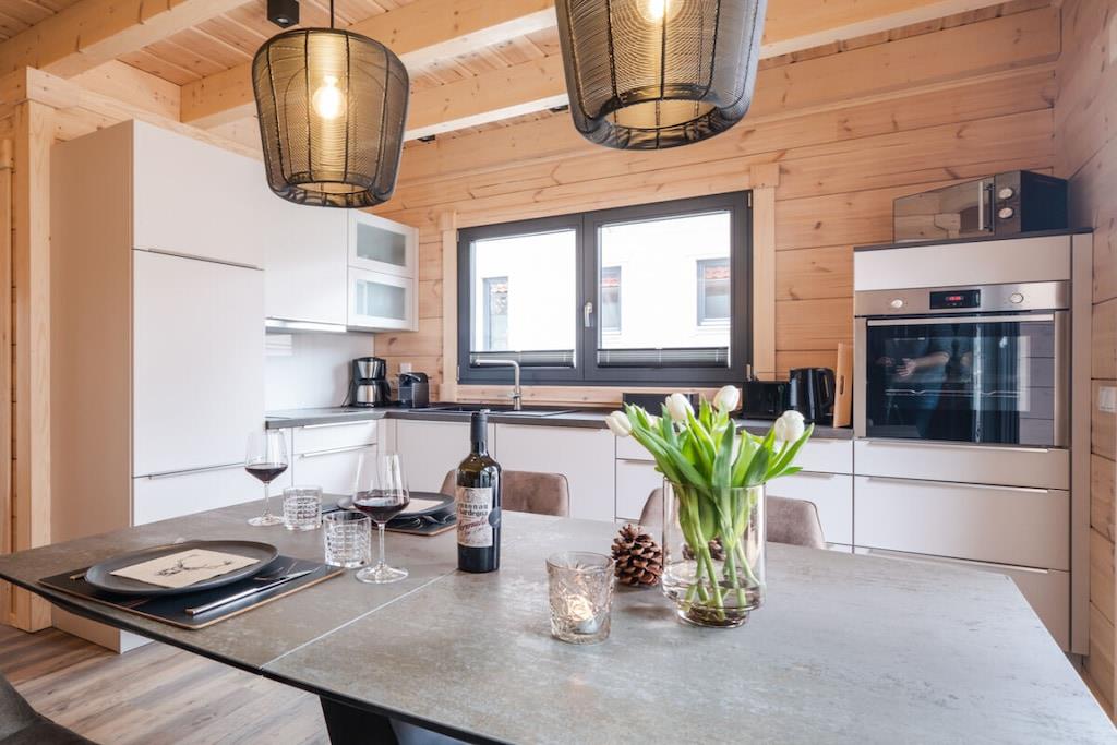 Vores to Bergwald Chalets Comfort tilbyder masser af plads til op til fem personer. Fra gangen fører en bred massiv trætrappe til øverste etage. I stueetagen finder du opholds-/spisestuen med pejs, et rummeligt, fuldt udstyret L-formet køkken og et brusebad med integreret finsk bjælkesauna. Ovenpå er der to soveværelser med superkomfortable boxmadrassenge, store skydedørsgarderober, et Smart TV og soundbar, et stort brusebad med en stor Glade-bruser og et galleri med en sovesofa. Hver chalet har sin egen elektriske ladestation/Walbox.