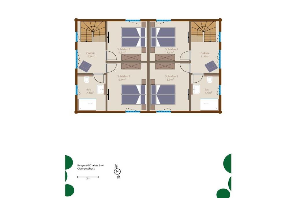 Vores fire Bergwald Wellness Chalets tilbyder masser af plads til op til fem personer. Fra gangen fører en bred massiv trætrappe til øverste etage. I stueetagen finder du opholds-/spisestuen med pejs, et rummeligt, fuldt udstyret køkkenø og et brusebad. Ovenpå finder du to soveværelser med superkomfortable boxmadrassenge, store skydedørsgarderober, et Smart TV og soundbar, et stort brusebad med bruseniche og et galleri med en sovesofa. Nedenfor terrasserne finder du et wellness-område med et afslapningsrum, endnu et brusebad, et køleskab, et Bose-lydsystem og endnu en møbleret terrasse. Hver chalet har sin egen elektriske ladestation/Walbox.