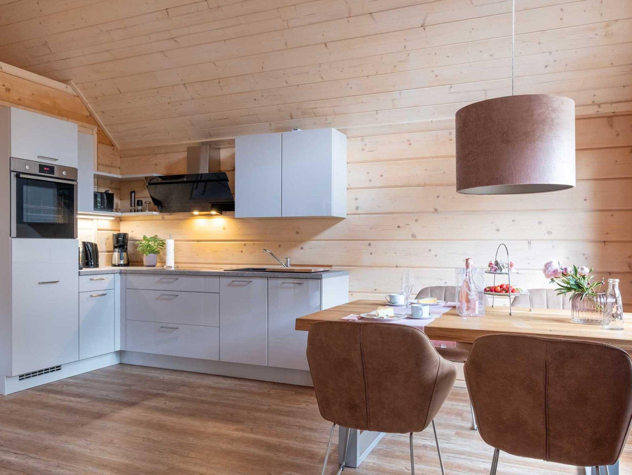 Hell und offen bis ins Dach präsentieren sich die 4 Suiten im Obergeschoss. Beim Betreten steigt der Holzduft in die Nase und vermittelt ein Gefühl von Wohnlichkeit. Das Ambiente ist im angesagten Stilmix gehalten. Alle Suiten verfügen über einen Wohn-/ Ess-  /Schlafraum mit einer hochwertigen sehr gut ausgestatteten Lack-Einbauküche, ein Schlafzimmer mit Boxspringbett, geräumigem Schrank und einem Smart-TV sowie ein Badezimmer mit Glas- / Regendusche und Waschtisch. Die Fußbodenheizung in allen Räumen sorgt für wohlige Wärme. Über eine Stiege gelangen insbesondere die Kinder auf den geräumigen und gegen Absturz geschützten Spiel-/ und Schlafboden, denn dort befinden sich auch 2 Schlafgelegenheiten, entweder auf 1,40 m breite oder zwei mal 80 cm. Alle Suiten im Obergeschoss verfügen über einen großen Balkon, auf dem sich je nach Ausrichtung die Morgen-/ Mittags- oder Abendsonne genießen lässt. (Weitere Ausstattungsmerkmale weiter unten)