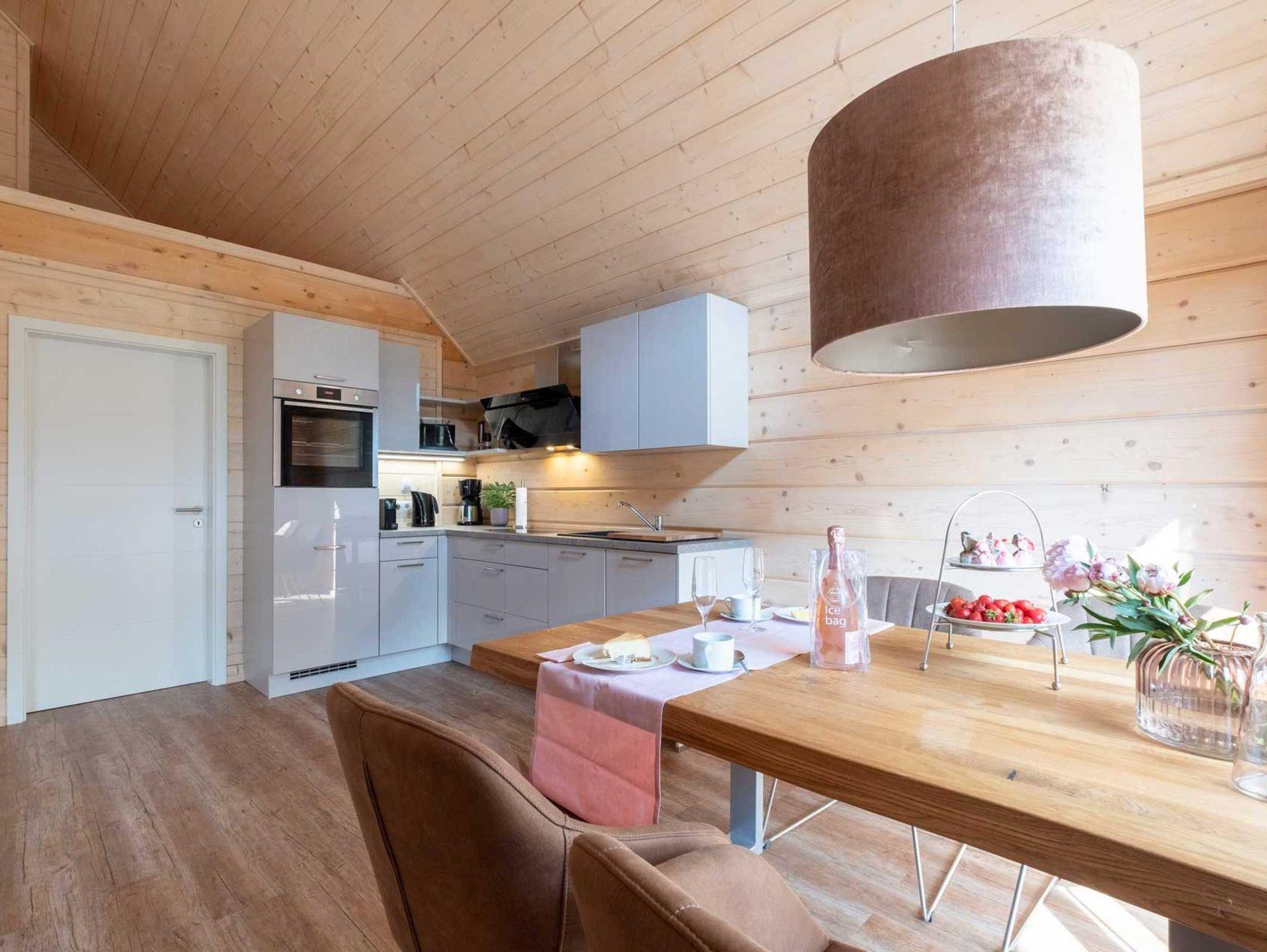 Hell und offen bis ins Dach präsentieren sich die 4 Suiten im Obergeschoss. Beim Betreten steigt der Holzduft in die Nase und vermittelt ein Gefühl von Wohnlichkeit. Das Ambiente ist im angesagten Stilmix gehalten. Alle Suiten verfügen über einen Wohn-/ Ess-  /Schlafraum mit einer hochwertigen sehr gut ausgestatteten Lack-Einbauküche, ein Schlafzimmer mit Boxspringbett, geräumigem Schrank und einem Smart-TV sowie ein Badezimmer mit Glas- / Regendusche und Waschtisch. Die Fußbodenheizung in allen Räumen sorgt für wohlige Wärme. Über eine Stiege gelangen insbesondere die Kinder auf den geräumigen und gegen Absturz geschützten Spiel-/ und Schlafboden, denn dort befinden sich auch 2 Schlafgelegenheiten, entweder auf 1,40 m breite oder zwei mal 80 cm. Alle Suiten im Obergeschoss verfügen über einen großen Balkon, auf dem sich je nach Ausrichtung die Morgen-/ Mittags- oder Abendsonne genießen lässt. (Weitere Ausstattungsmerkmale weiter unten)