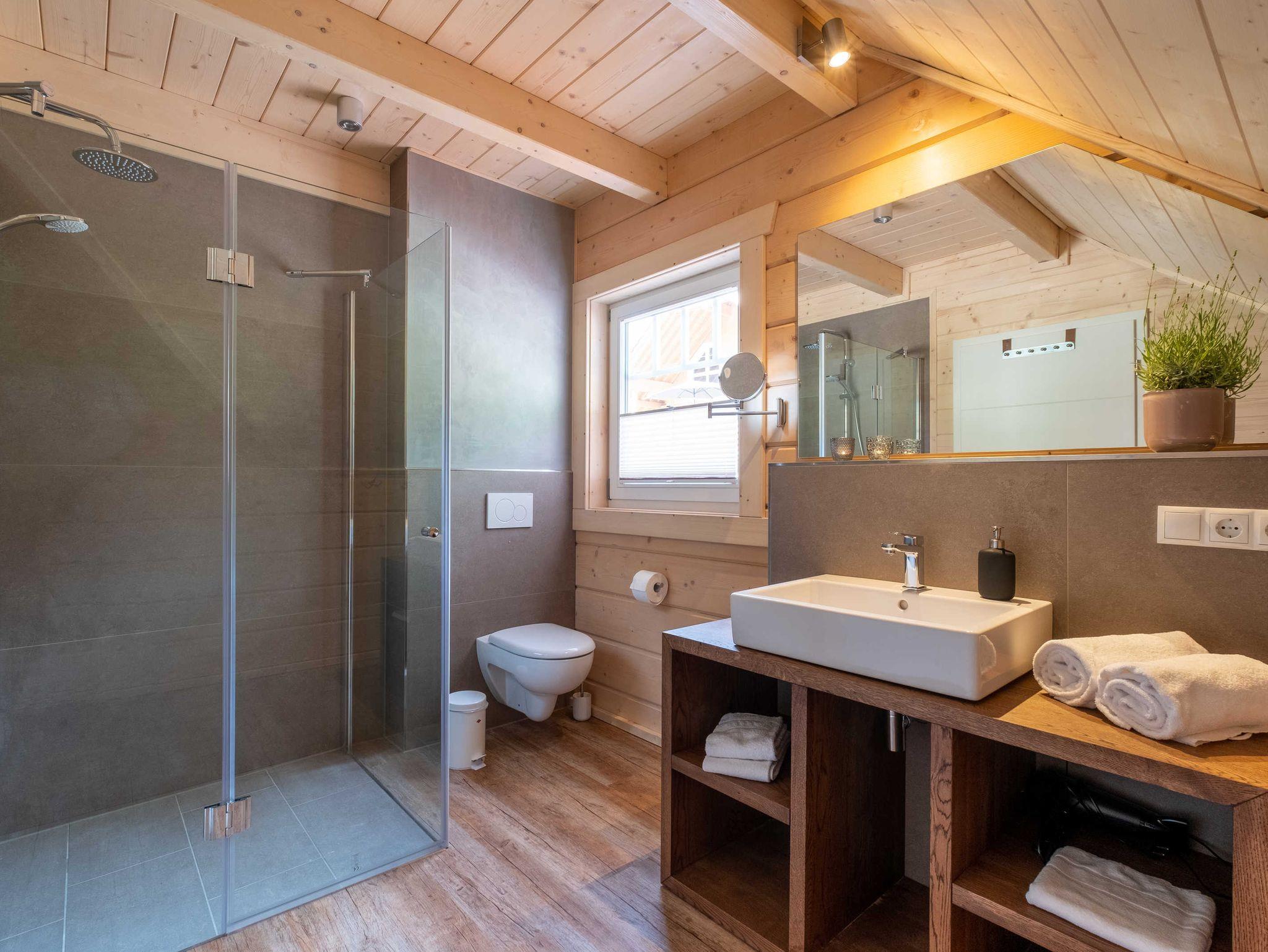 Hell und offen bis ins Dach präsentieren sich die 4 Suiten im Obergeschoss. Beim Betreten steigt der Holzduft in die Nase und vermittelt ein Gefühl von Wohnlichkeit. Das Ambiente ist im angesagten Stilmix gehalten. Alle Suiten verfügen über einen Wohn-/ Ess-  /Schlafraum mit einer hochwertigen sehr gut ausgestatteten Lack-Einbauküche, ein Schlafzimmer mit Boxspringbett, geräumigem Schrank und einem Smart-TV sowie ein Badezimmer mit Glas- / Regendusche und Waschtisch. Die Fußbodenheizung in allen Räumen sorgt für wohlige Wärme. Über eine Stiege gelangen insbesondere die Kinder auf den geräumigen und gegen Absturz geschützten Spiel-/ und Schlafboden, denn dort befinden sich auch 2 Schlafgelegenheiten, entweder auf 1,40 m breite oder zwei mal 80 cm. Alle Suiten im Obergeschoss verfügen über einen großen Balkon, auf dem sich je nach Ausrichtung die Morgen-/ Mittags- oder Abendsonne genießen lässt. (Weitere Ausstattungsmerkmale weiter unten)