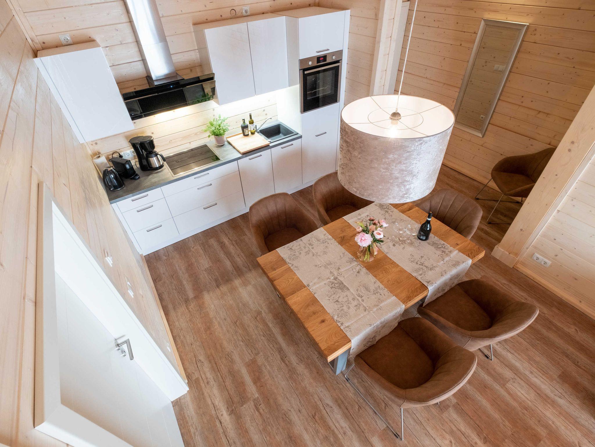 Hell und offen bis ins Dach präsentieren sich die 4 Suiten im Obergeschoss. Beim Betreten steigt der Holzduft in die Nase und vermittelt ein Gefühl von Wohnlichkeit. Das Ambiente ist im angesagten Stilmix gehalten. Alle Suiten verfügen über einen Wohn-/ Ess-  /Schlafraum mit einer hochwertigen sehr gut ausgestatteten Lack-Einbauküche, ein Schlafzimmer mit Boxspringbett, geräumigem Schrank und einem Smart-TV sowie ein Badezimmer mit Glas- / Regendusche und Waschtisch. Die Fußbodenheizung in allen Räumen sorgt für wohlige Wärme. Über eine Stiege gelangen insbesondere die Kinder auf den geräumigen und gegen Absturz geschützten Spiel-/ und Schlafboden, denn dort befinden sich auch 2 Schlafgelegenheiten, entweder auf 1,40 m breite oder zwei mal 80 cm. Alle Suiten im Obergeschoss verfügen über einen großen Balkon, auf dem sich je nach Ausrichtung die Morgen-/ Mittags- oder Abendsonne genießen lässt. (Weitere Ausstattungsmerkmale weiter unten)