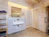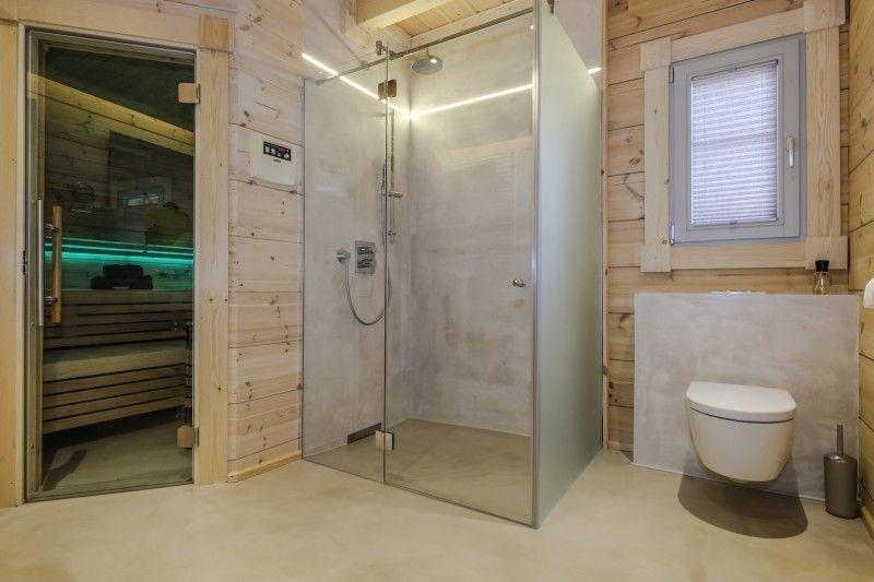Das großzügige Badezimmer mit Glas-Regendusche, finnischer Blockhaus-Sauna (elektronisch steuerbar bis 100 °C) mit LED-Ambientebeleuchtung und einem großen Waschtisch ist der ideale Ort der Entspannung nach einem ereignisreichen Urlaubstag. Eine Tür führt aus dem Badezimmer direkt auf die Holz-Terrasse, die nach jedem Sauna-Gang angenehm luftige Abkühlung bietet. Wem diese Abkühlung nicht ausreicht, bedient sich an dem Außenwasserhahn mit eiskaltem Wasser.