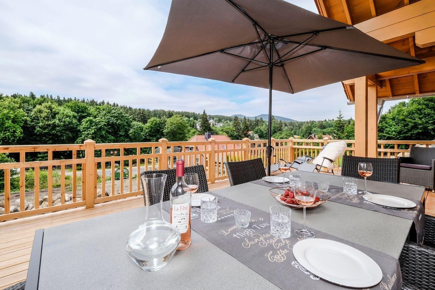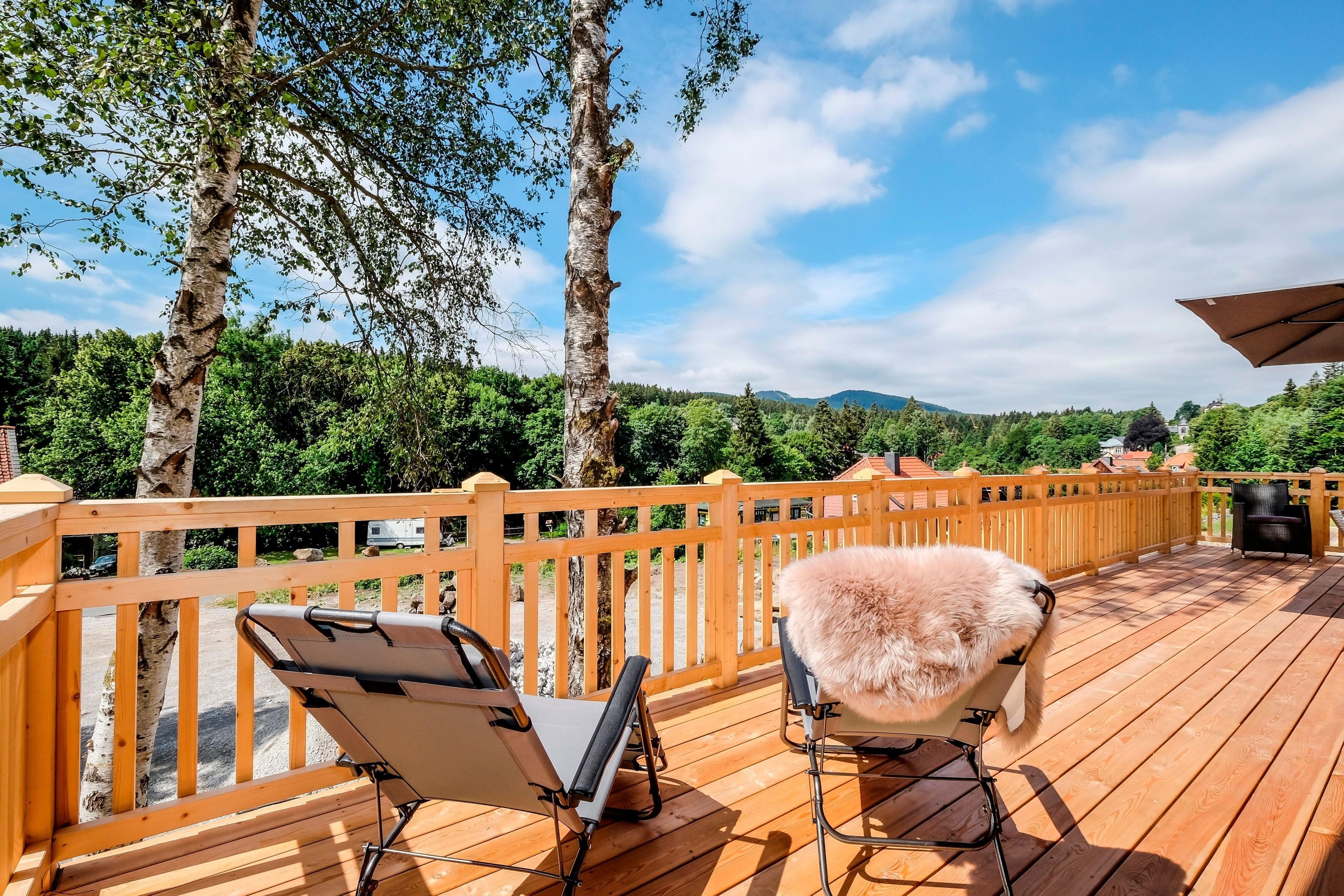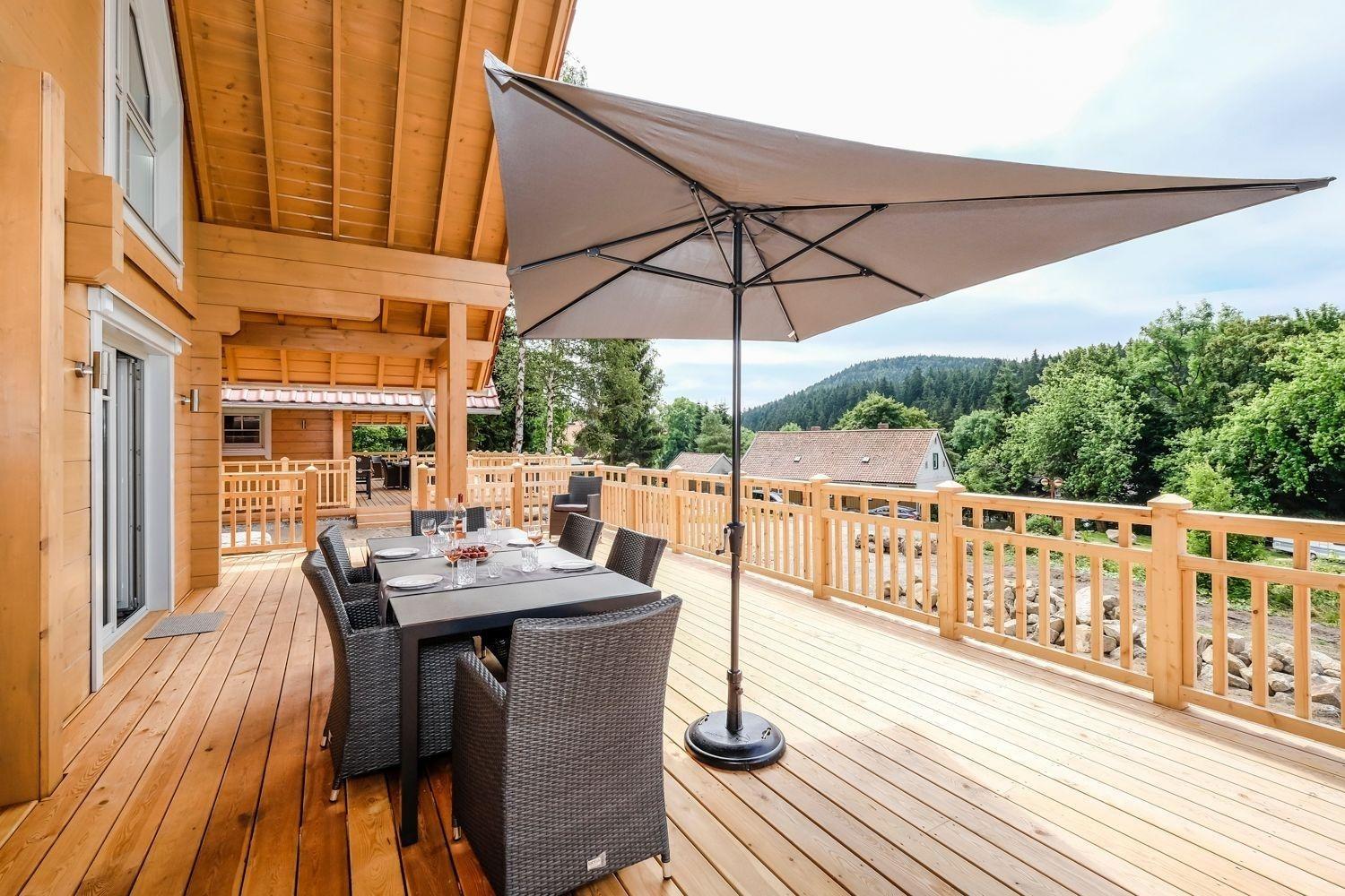 Die 60 qm große teilüberdachte nach Süd-West ausgerichtete Panorama-Terrasse mit 3 Meter-Dachüberstand bietet einen einzigartigen Blick auf die Schierker Bergwelt. Im Herbst erinnert die Aussicht mit ihrem Blätter-Farbspiel an den "Indian Summer".