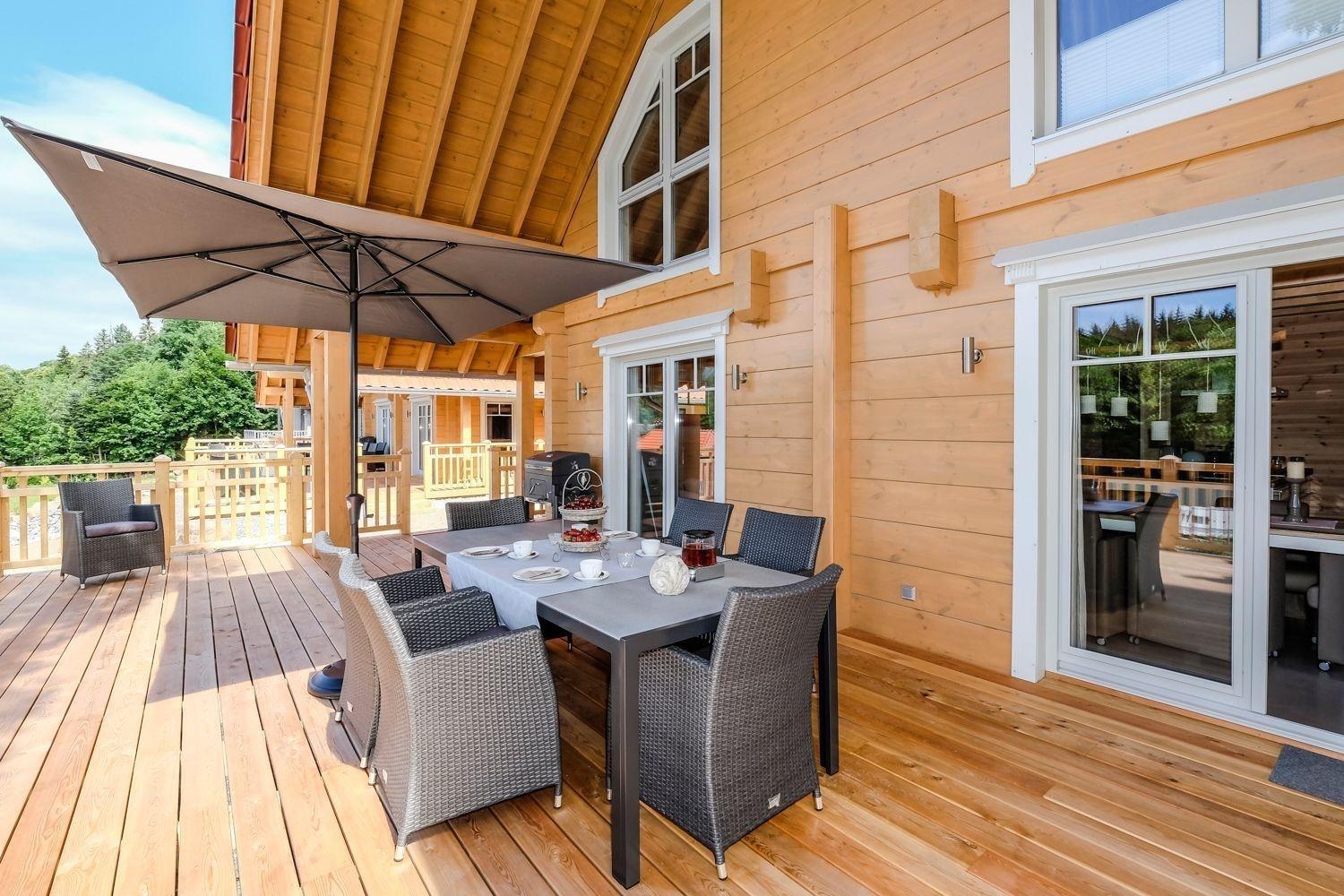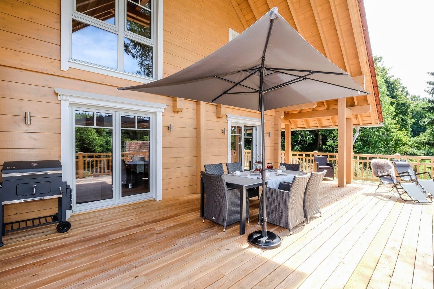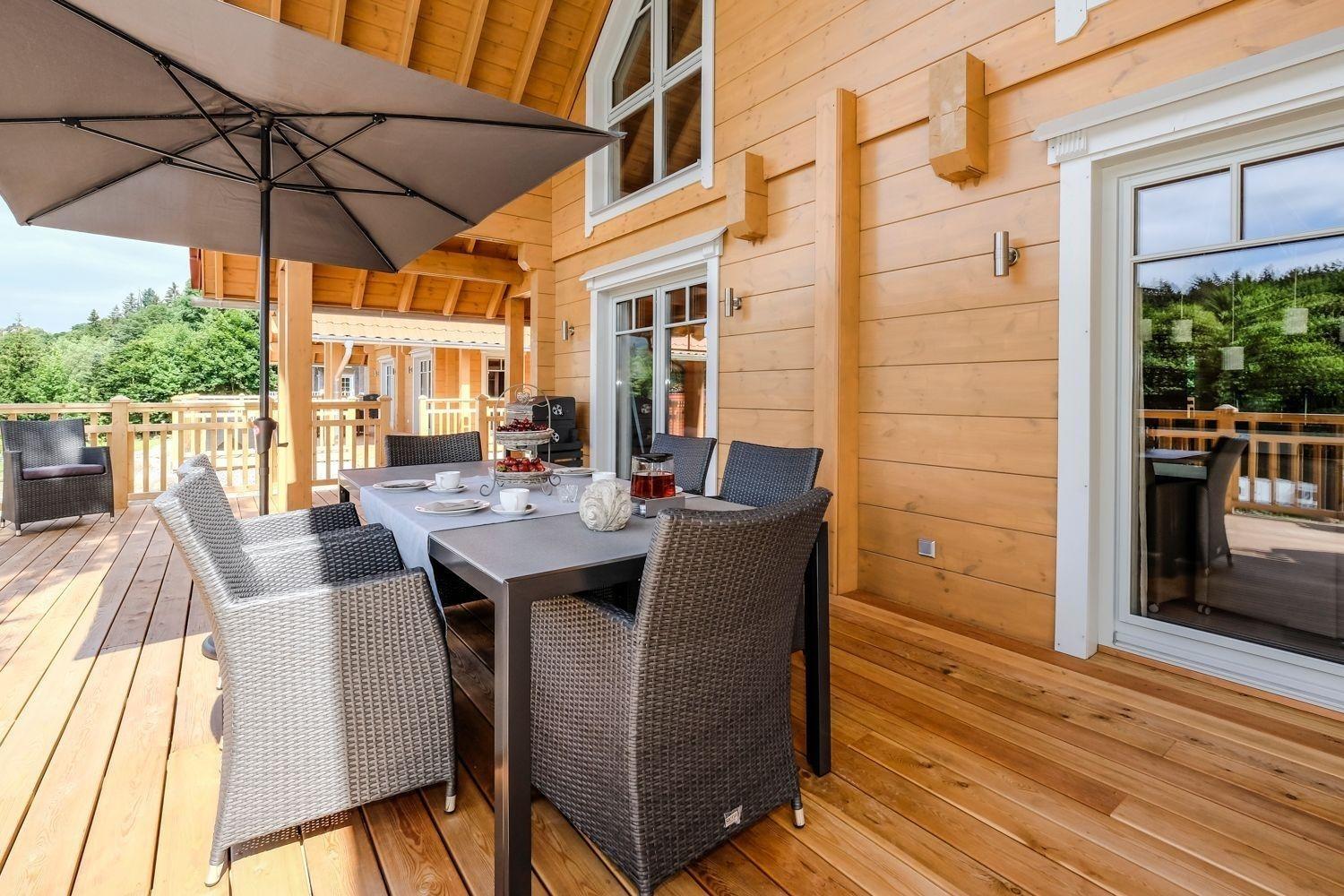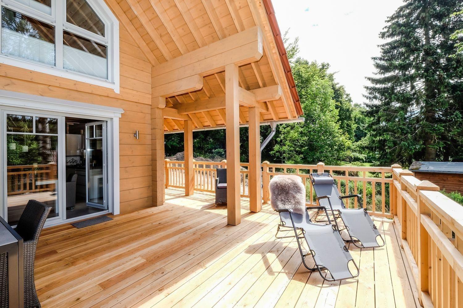 5-STERNE-Blockhaus in traumhafter Hanglage besticht durch eine luxuriöse Ausstattung im angesagten Stilmix. Höchster Komfort mit 2 Bädern, Sauna, Kamin, großer Terrasse, Fahrradgarage und Insel-Küche.