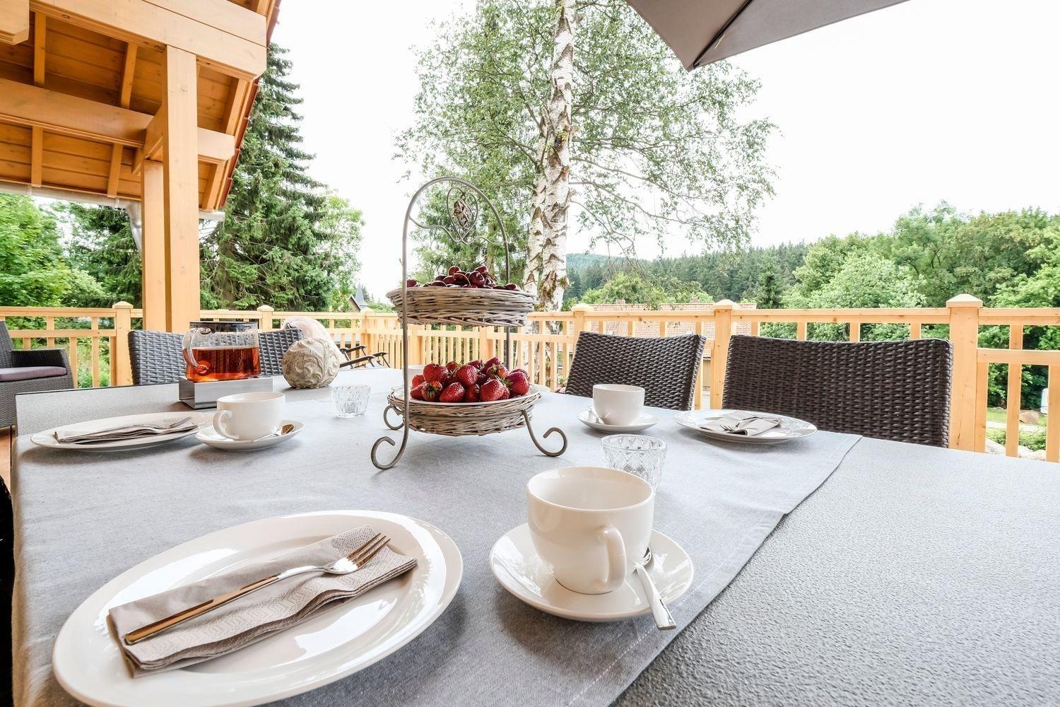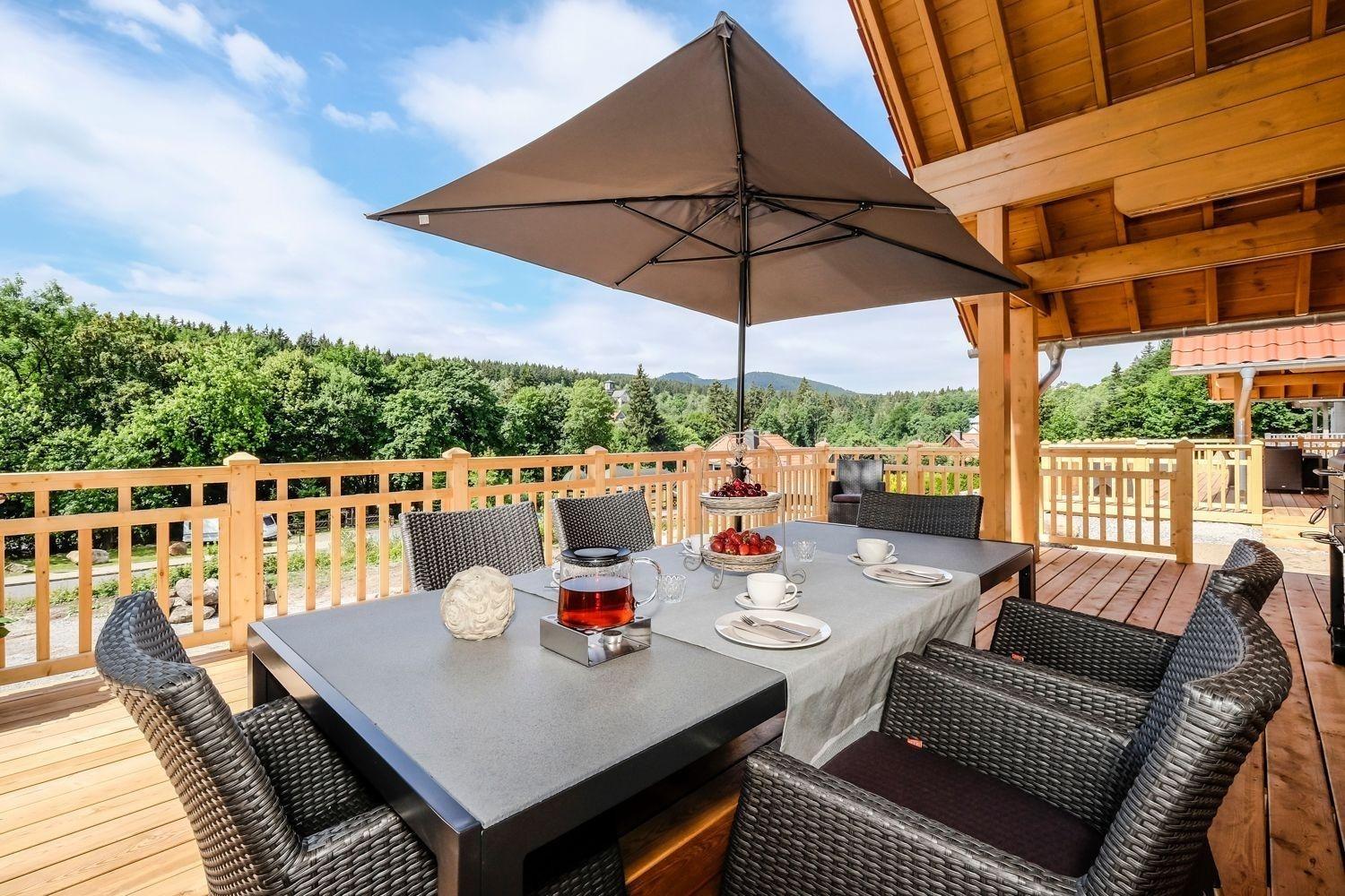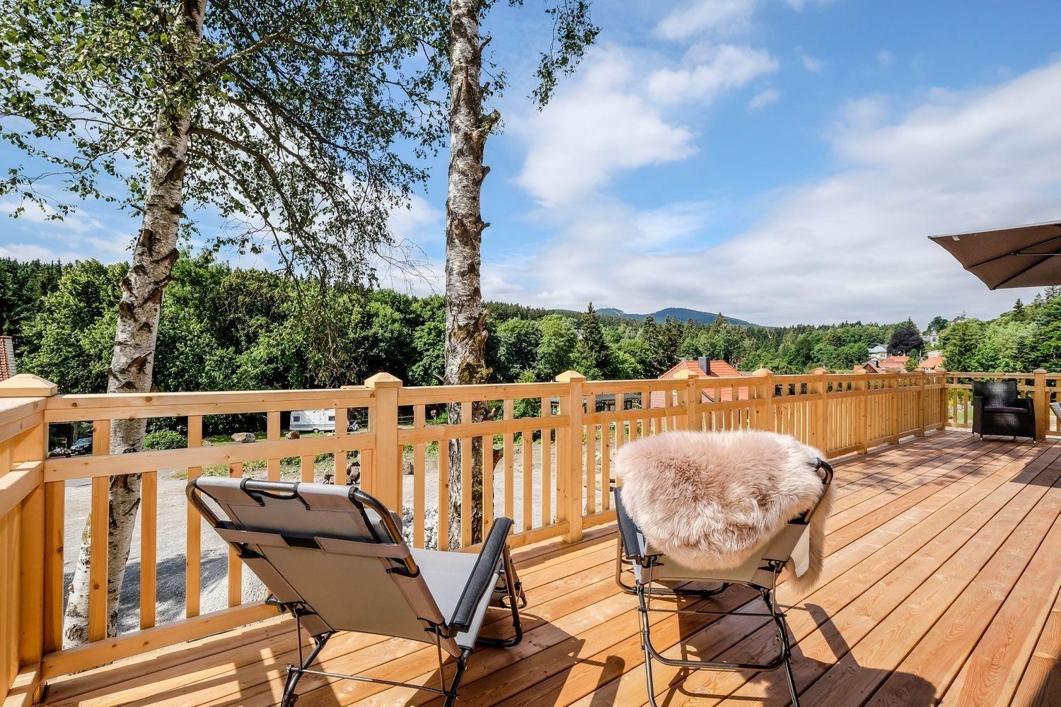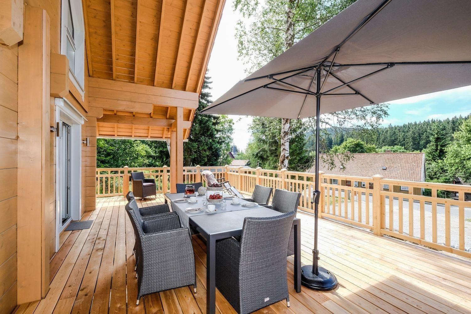 Die 60 qm große teilüberdachte nach Süd-West ausgerichtete Panorama-Terrasse mit 3 Meter-Dachüberstand bietet einen einzigartigen Blick auf die Schierker Bergwelt. Im Herbst erinnert die Aussicht mit ihrem Blätter-Farbspiel an den "Indian Summer".