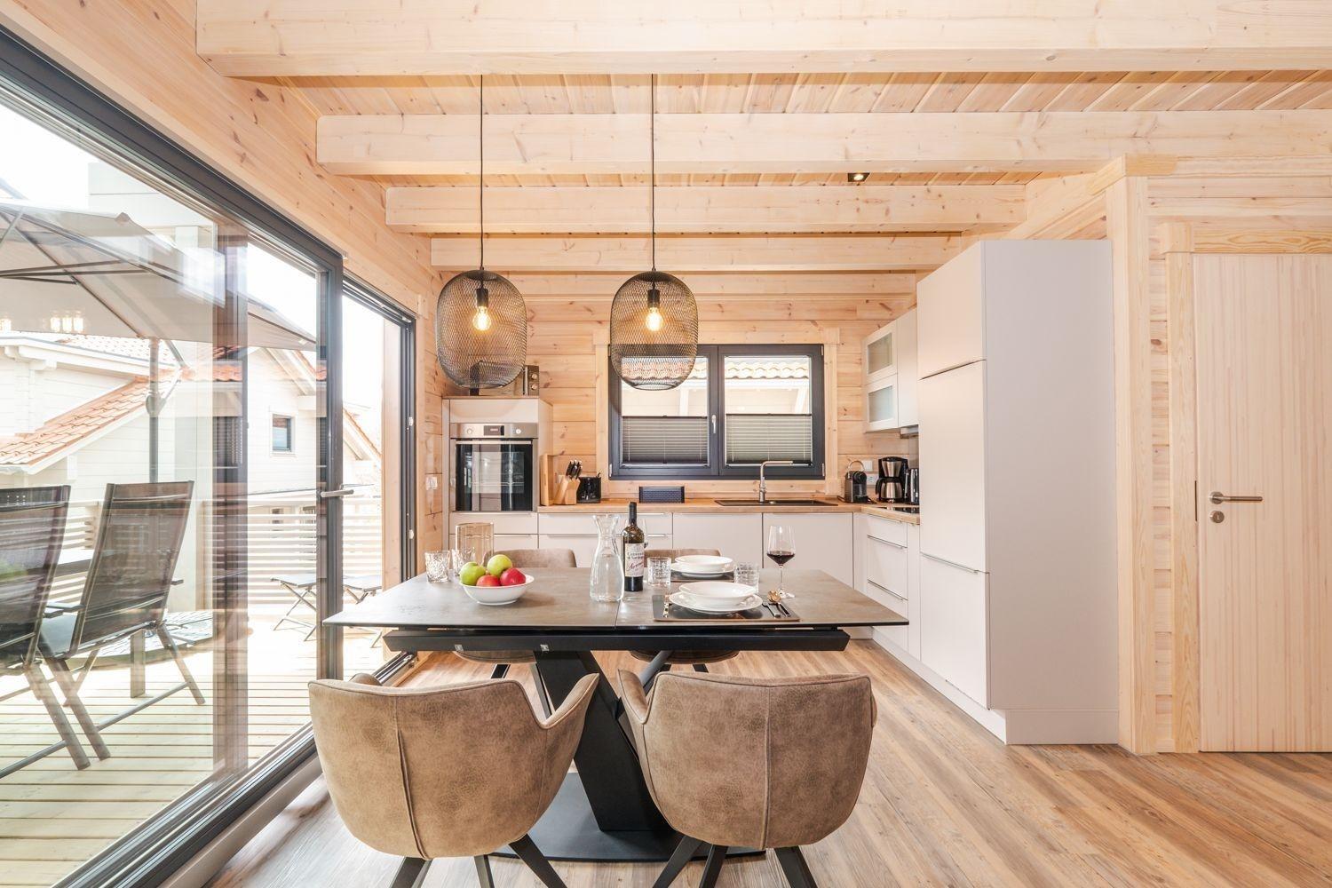 Im Erdgeschoss wartet die Sauna auf ihre Gäste. Dort ist auch das zweite kleinere Bad mit gleicher Ausstattung zu finden. Weiter den Flur entlang erreichen unsere Gäste den Wohnbereich mit top ausgestatteter moderner Küche und einem verlängerbaren Esstisch mit hochwertigen bequemen Sesseln mit Blick durch die breite Glasfront auf die Terrasse.