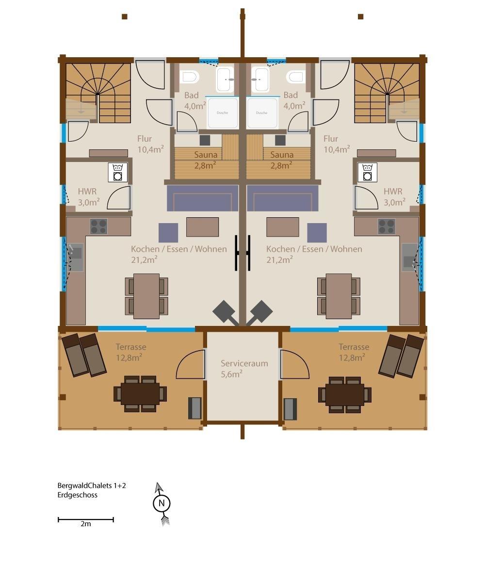 In einer ruhigen Sackgasse schmiegen sich das exklusive Bergwaldchalet "Komfort 1" an einen Hang mit Südwest-Ausrichtung. Das als Doppelhaus konzipierten Chalet ist von Natur umgeben. Rechts plätschert – wenn er Wasser führt – ein Bach und unterhalb des Chalets trifft sich gelegentlich das Rotwild zum „Abendessen“.