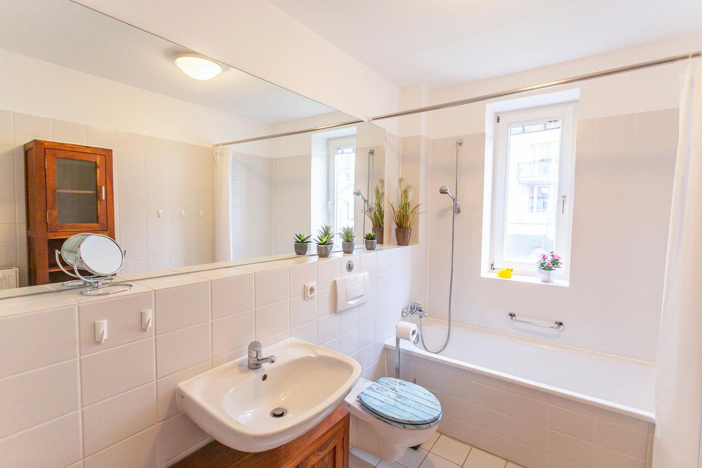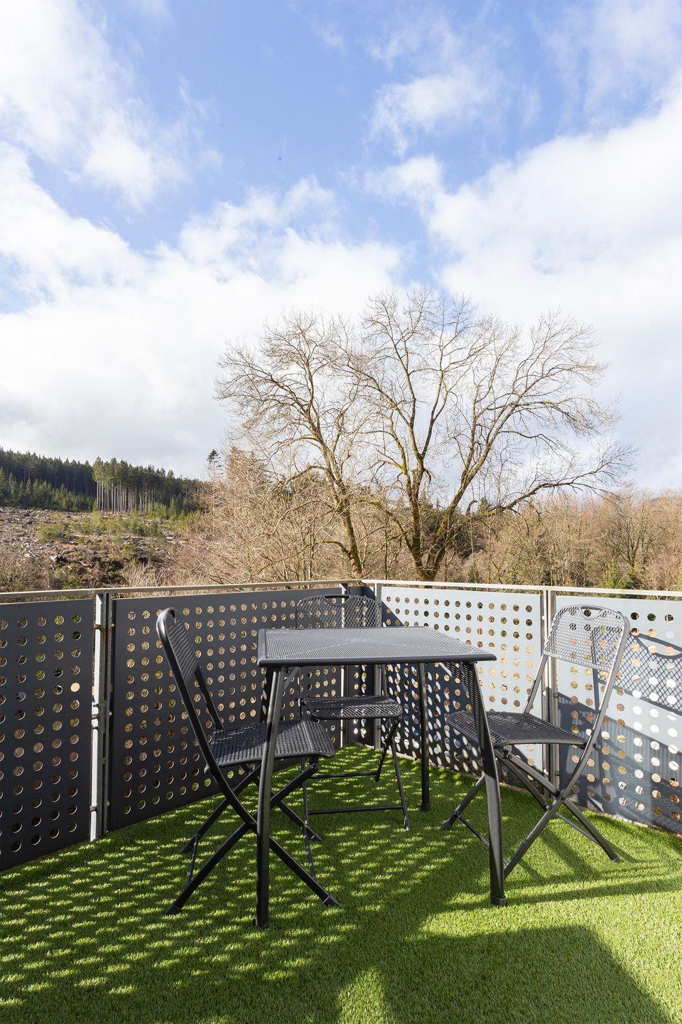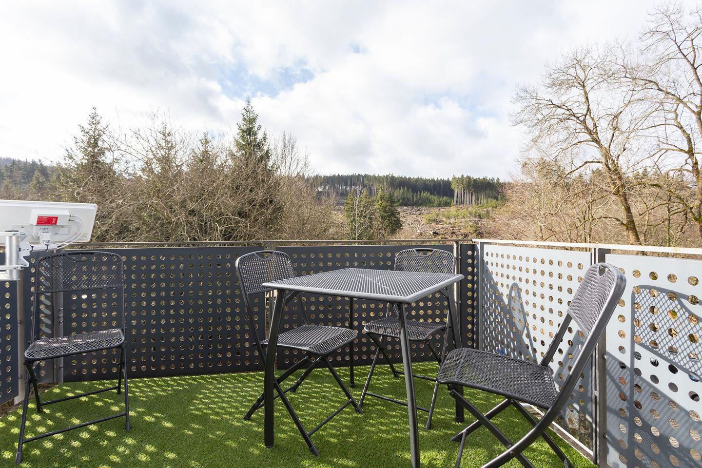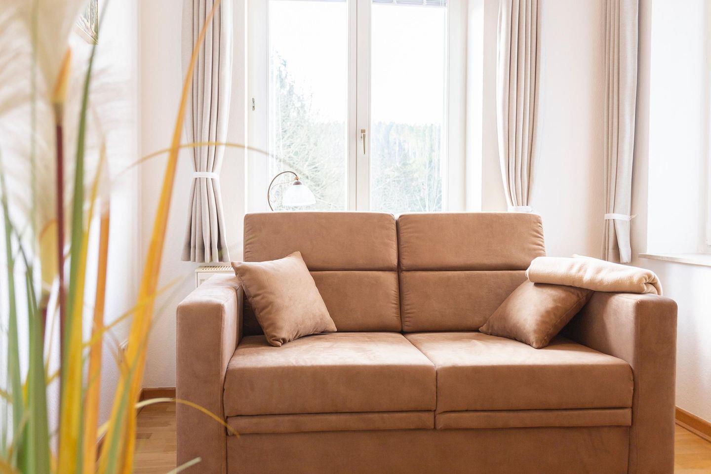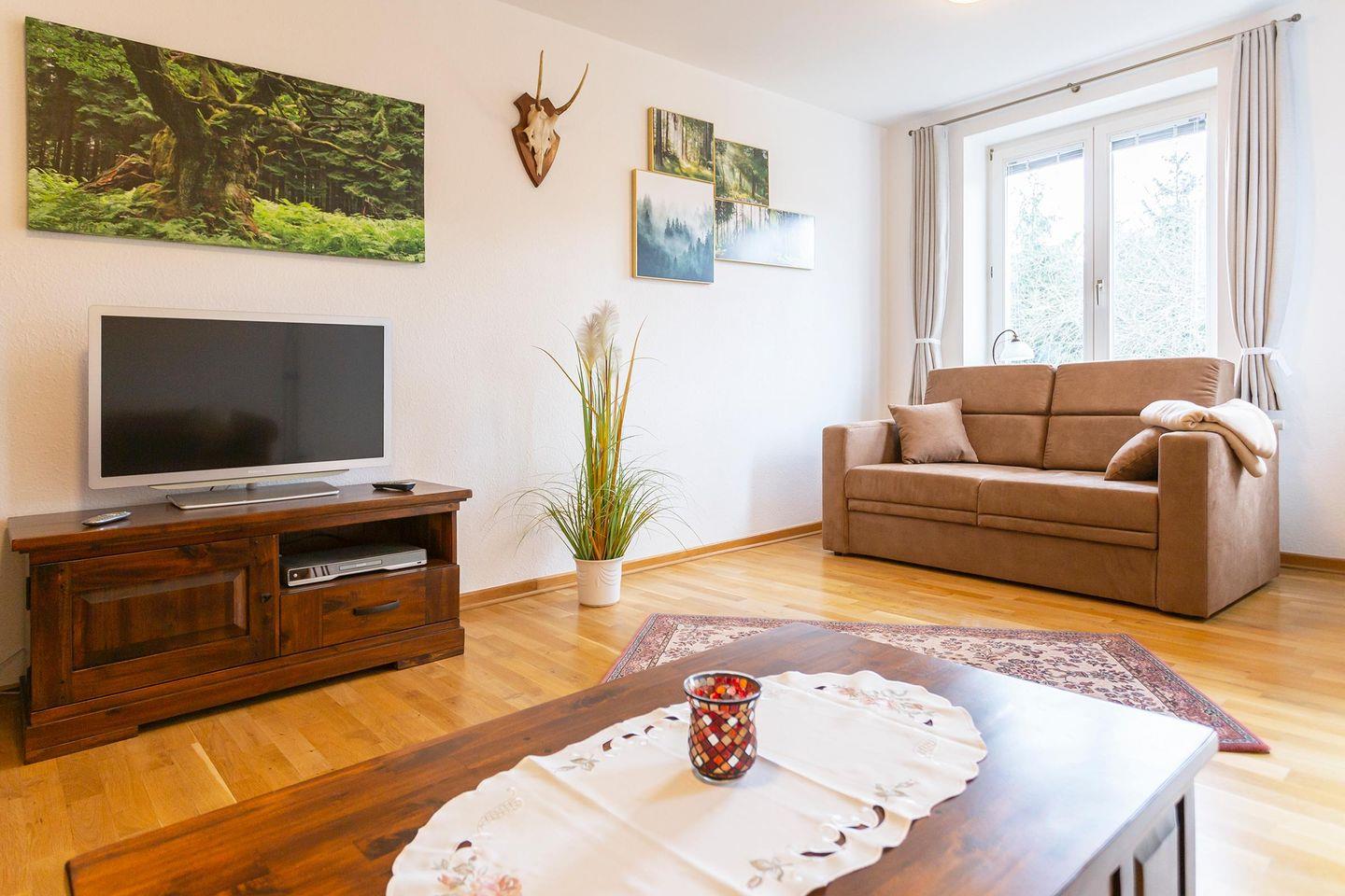 Der Wohnbereich mit gemütlichen Sofas und TV bietet viel Platz für gemeinsame Abende. Eine Couch ist ausziehbar und kann für zwei Personen aufgebettet werden. Vom Schlafzimmer und vom Wohnzimmer aus, können Sie direkt nach dem Aufstehen den Ausblick in die Natur vom Balkon aus genießen. Das Badezimmer ist mit einer Badewanne mit Duschvorhang ausgestattet.
