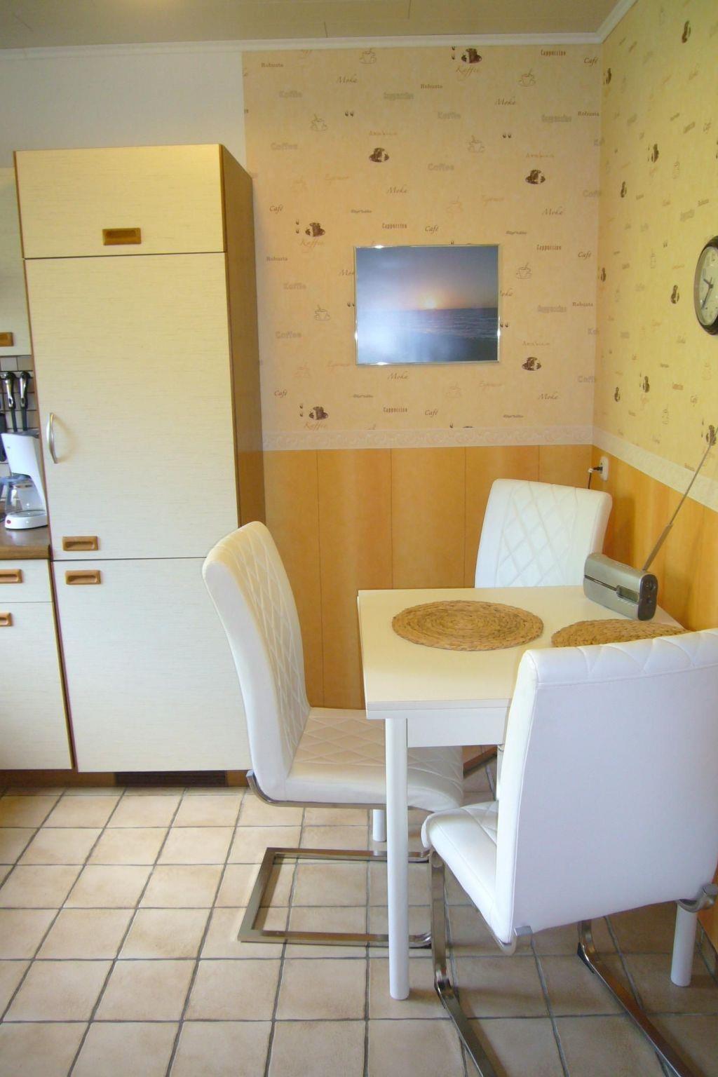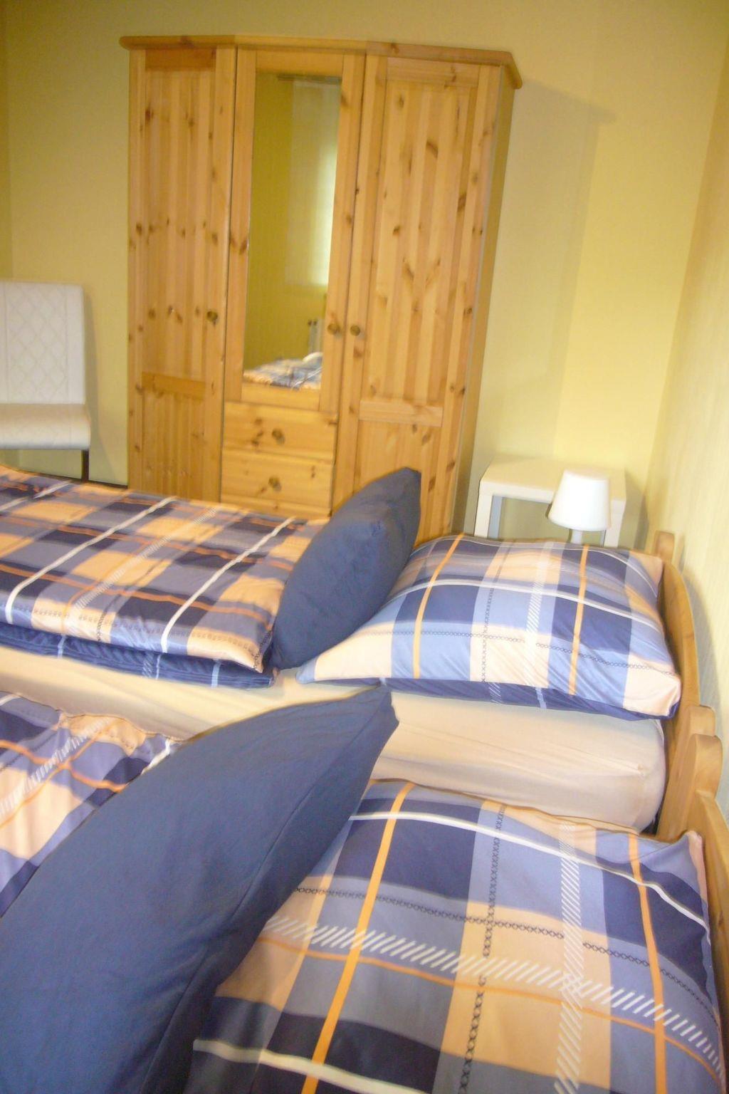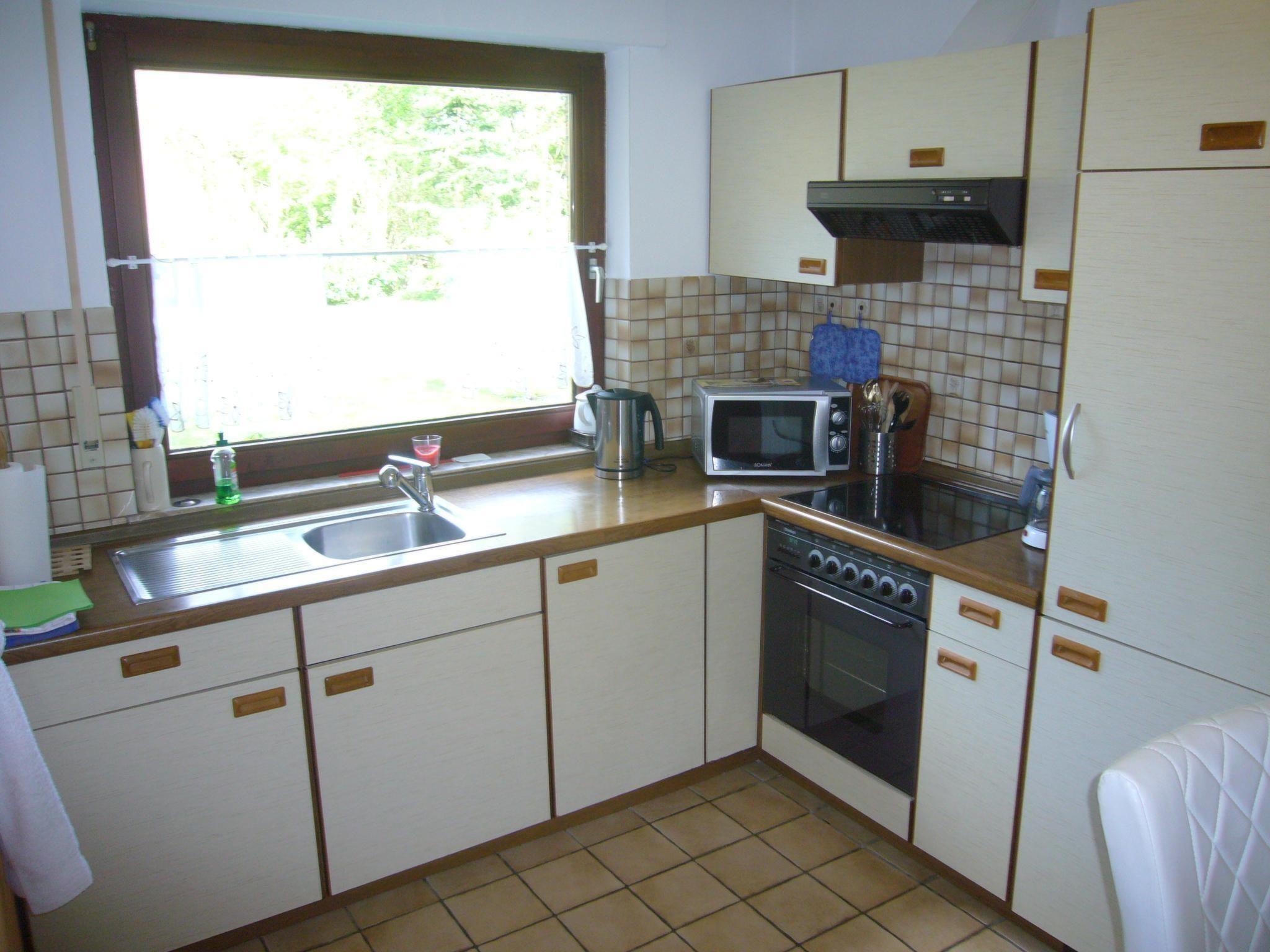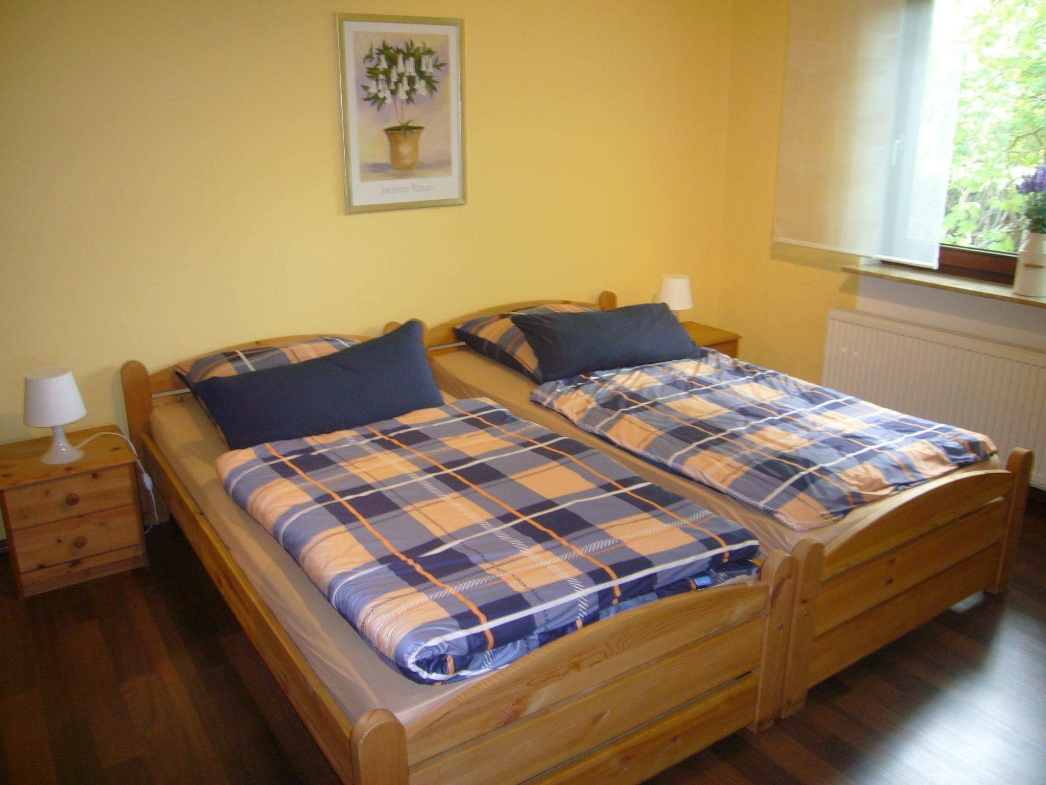 The apartment is in an annex to our single-family house. The apartment is at ground level with its own entrance. The fully-furnished and equipped apartment of around 55m² is ideal for a maximum of three adults or two adults with a maximum of two small children. Small dogs up to ca. 35cm height are allowed, but the site is not fully fenced. Smoking is prohibited in the apartment. It consists of a living room with a sofa bed and satellite TV, a bedroom with two single beds and a wardrobe, a fully-equipped kitchen with built-in furniture, an electric hob and oven, microwave, fridge etc. and a dining corner, along with a bathroom with a WC, washbasin and shower. There is a storage room with a freezer and a washing machine (payable). All the windows except in the bathroom and the terrace door are fitted with external binds. All the rooms have radiators connected to the central heating and the bathroom and kitchen have hot and cold water.