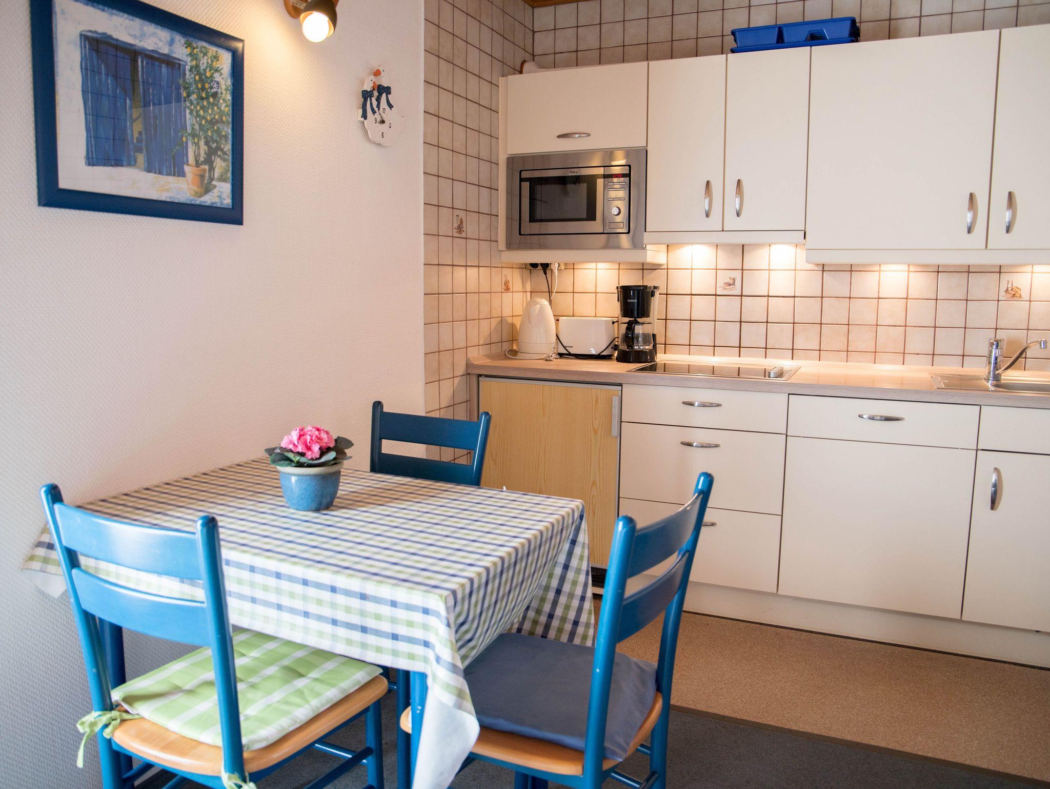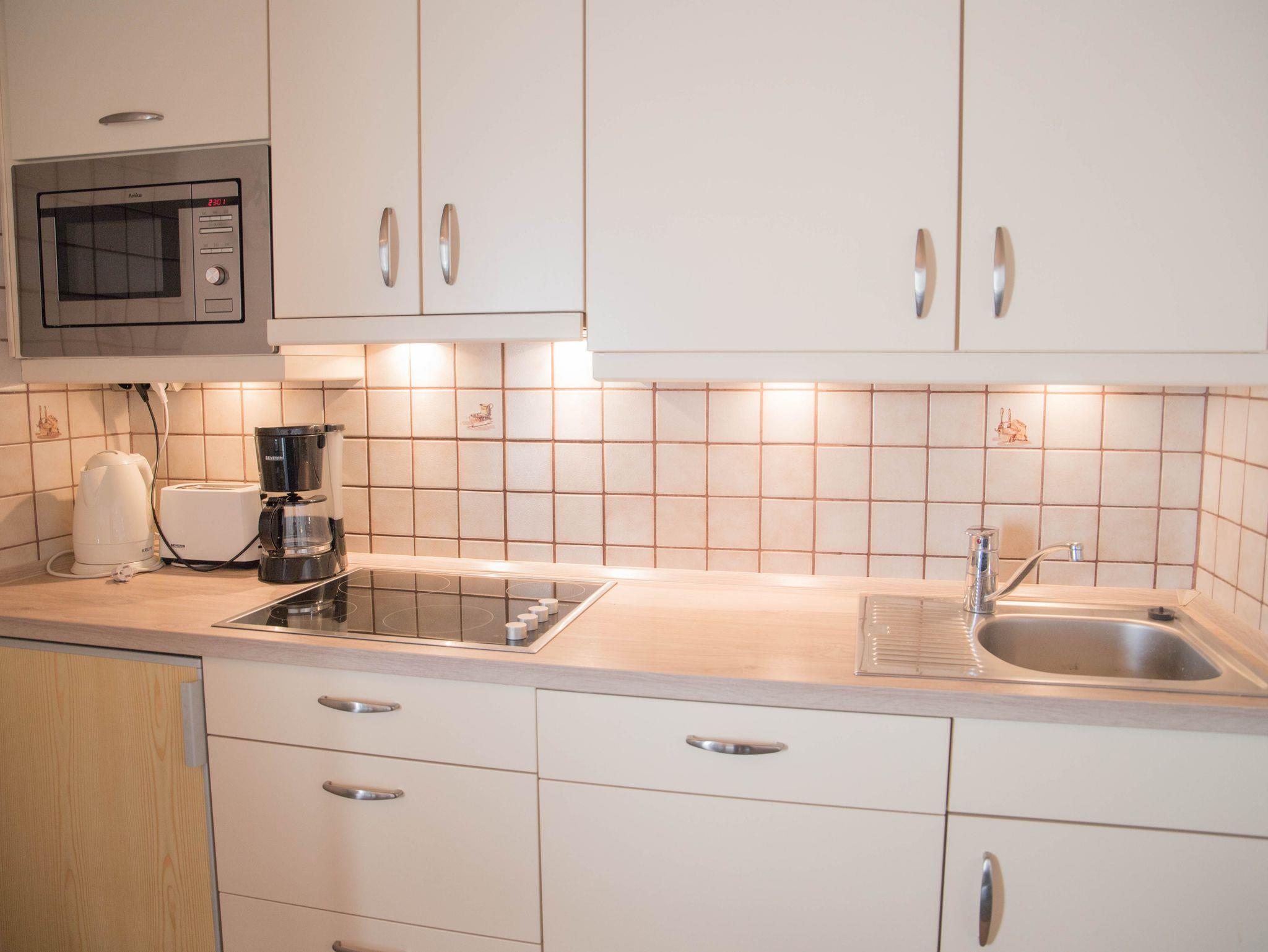 Der Wohnbereich ist mit einer funktionalen Küchenzeile ausgestattet. Bereiten Sie köstliche Mahlzeiten auf dem Cerankochfeld, und genießen Sie diese im kombinierten Wohn- und Essbereich. Die Küche verfügt über eine Geschirrspülmaschine, einen Kühlschrank mit Gefriermöglichkeit, eine Mikrowelle, Kaffeemaschine, Wasserkocher und Toaster.