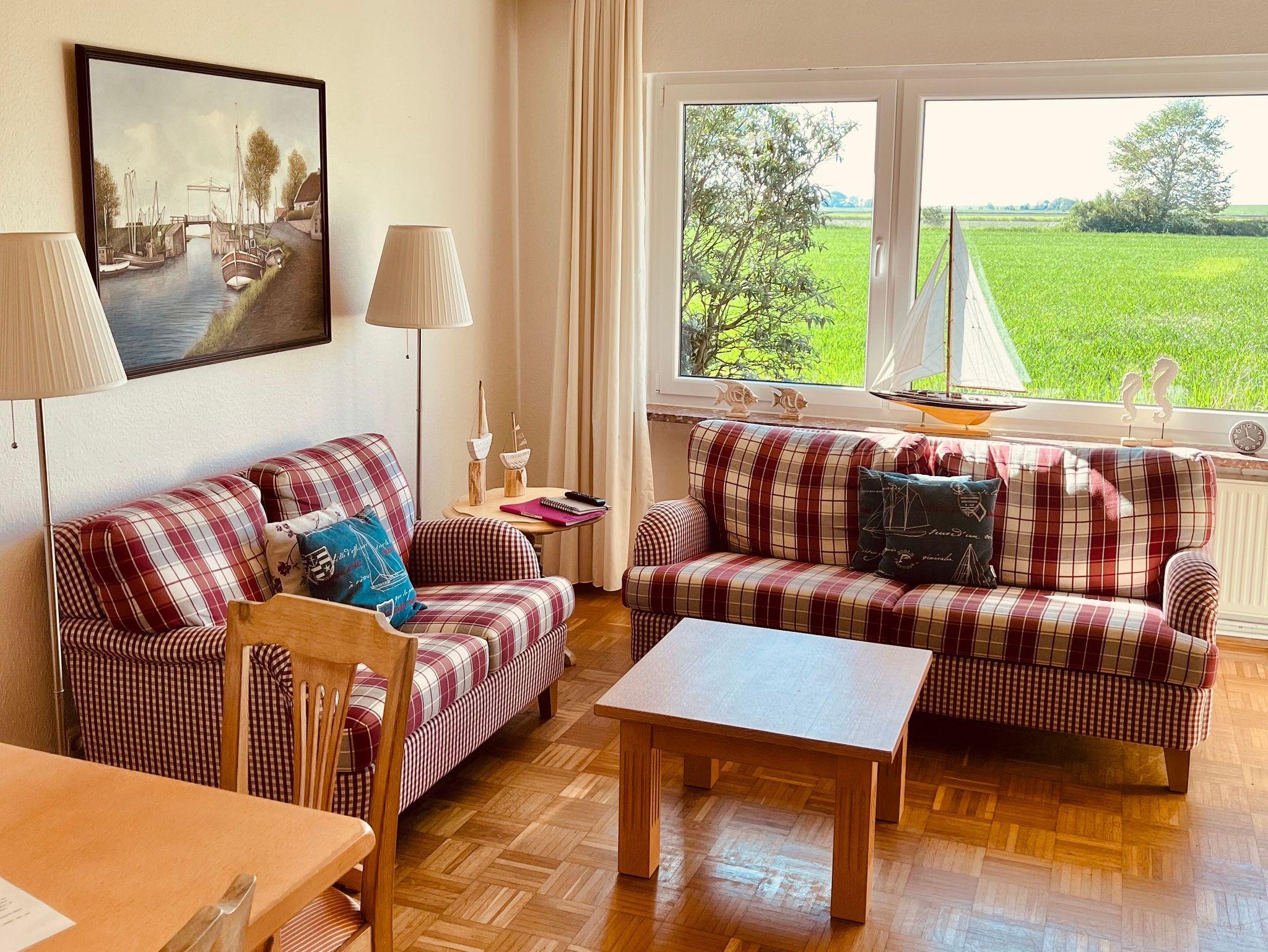 Im Wohnzimmer finden Sie einen weiteren Esstisch sowie einen Flachbildfernseher und zwei gemütliche Sofas. Durch die großen Fenster ist das Wohnzimmer sehr hell. Über das Wohnzimmer gelangen Sie auf die Terrasse, von der aus Sie ebenfalls einen atemberaubenden Blick über die Felder und den Deich genießen können ? der ideale Ort, um den Sonnenuntergang zu beobachten oder einfach nur die Natur zu genießen.