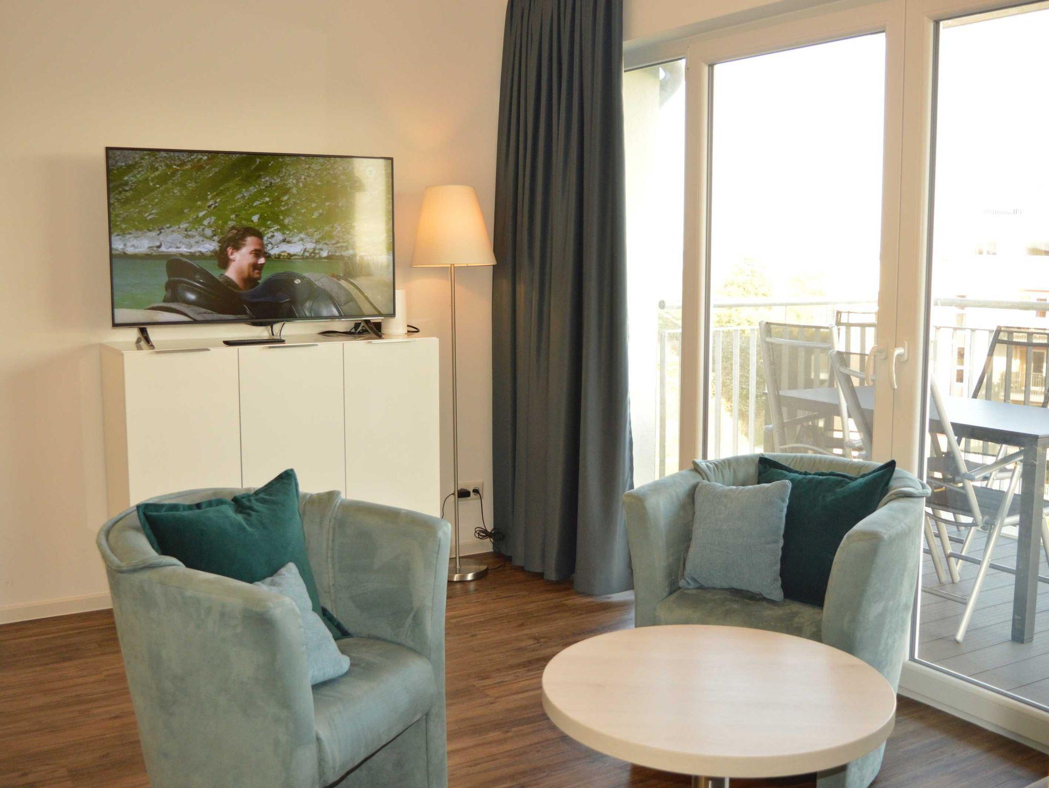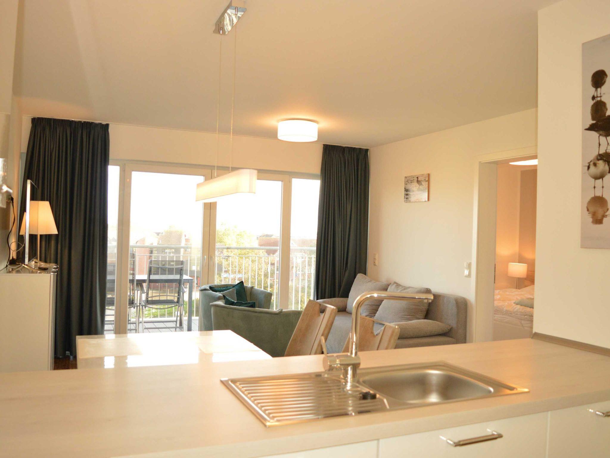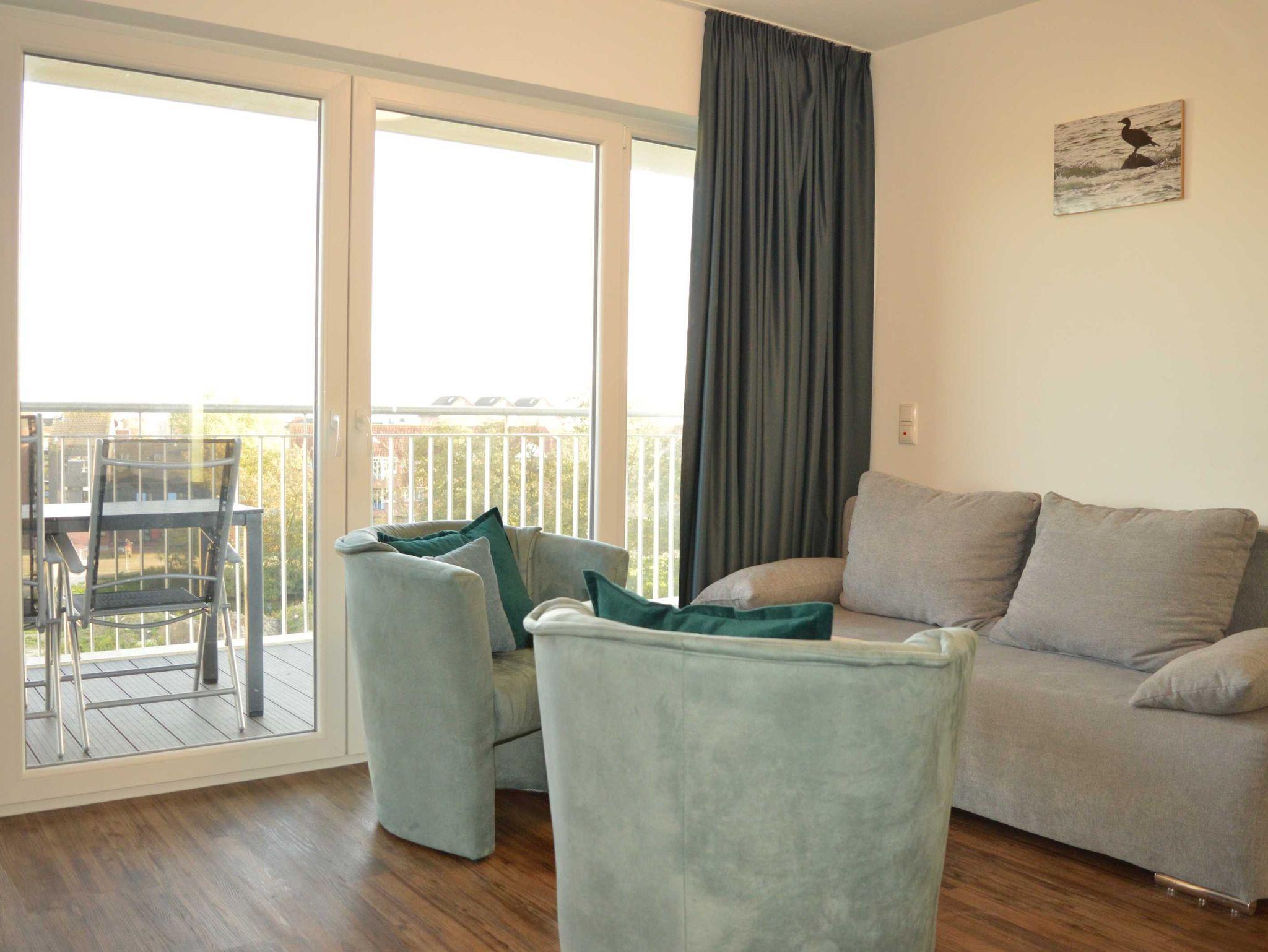 Der helle Wohnraum mit Schlafsofa, TV mit DVBT, WLAN und zwei Clubsesseln verfügt über große Panoramafenster mit Blick aufs Meer und einem direkten Zugang zum Balkon mit Gartenmöbeln, wo Sie die frische Nordseeluft einatmen können. Die moderne Küche ist offen im Wohnraum integriert und bietet neben einem Essplatz für 4 Personen einen Backofen, Geschirrspüler, Kühlschrank mit Tiefkühlfach, Wasserkocher, Kaffeemaschine und Toaster. Dem Wohnraum schließen sich das Schlafzimmer mit Doppelbett sowie das großzügige Tageslicht-Badezimmer mit Badewanne und WC sowie einem Fön an.