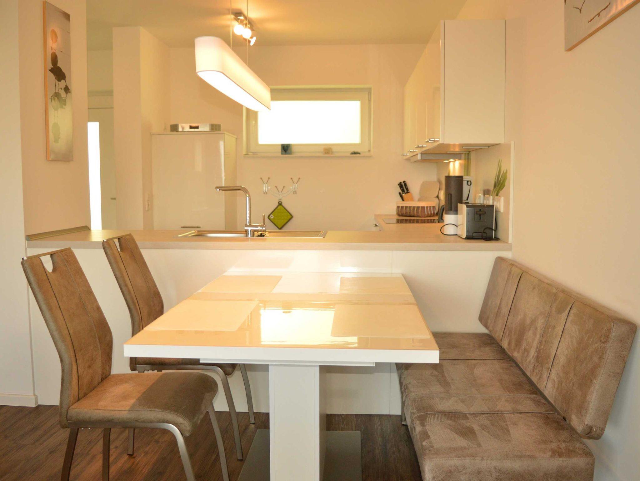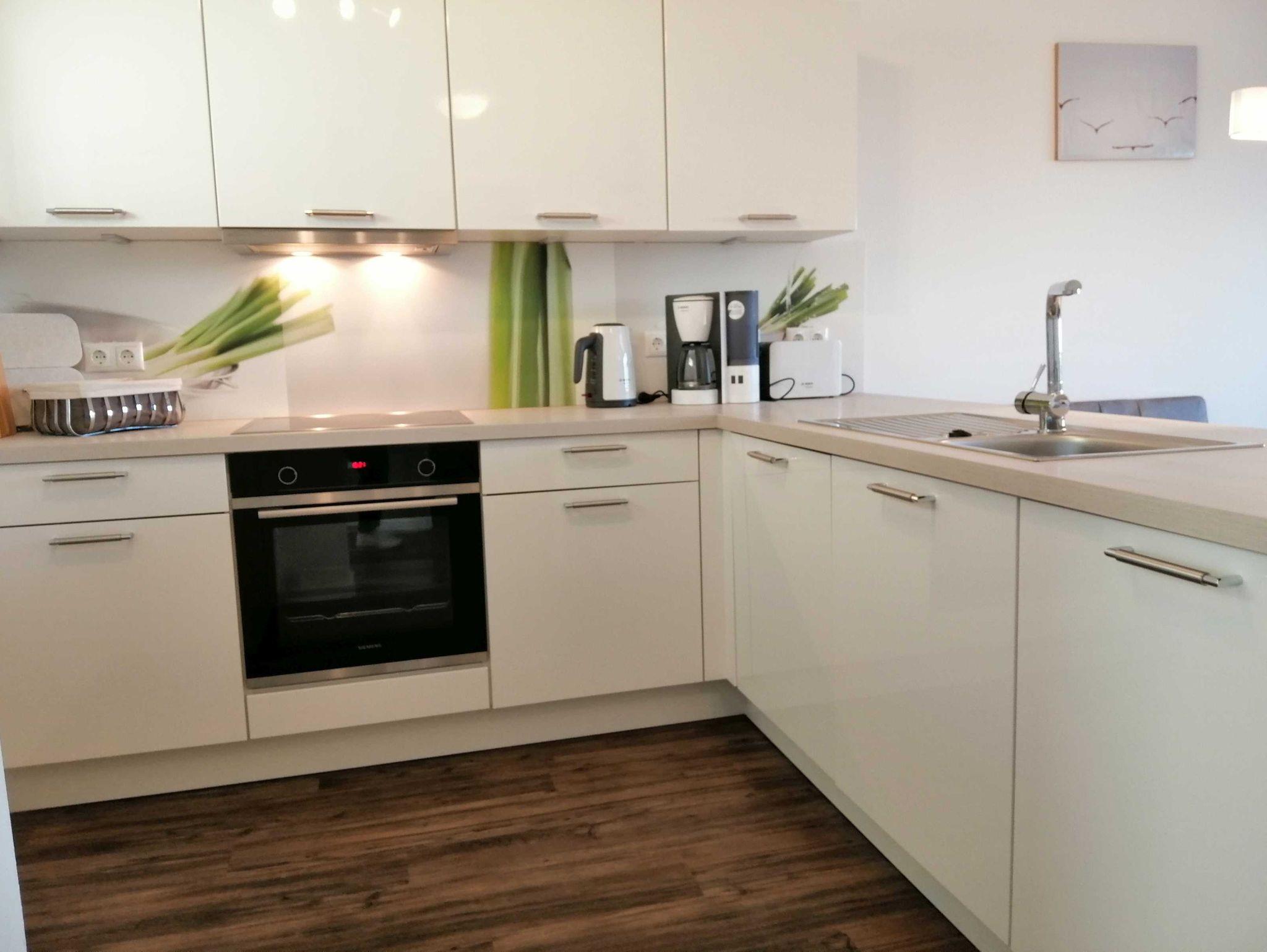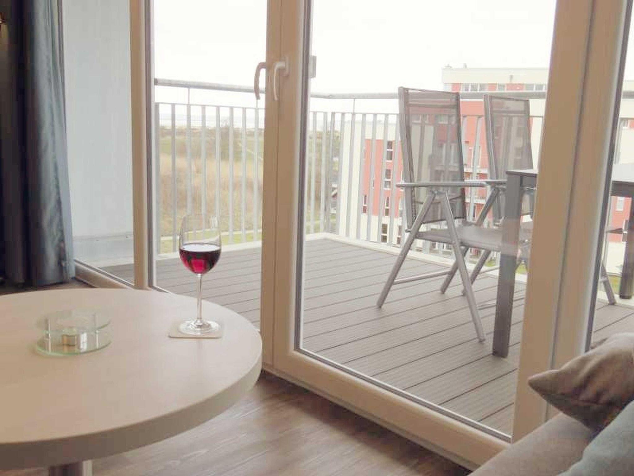 Der helle Wohnraum mit Schlafsofa, TV mit DVBT, WLAN und zwei Clubsesseln verfügt über große Panoramafenster mit Blick aufs Meer und einem direkten Zugang zum Balkon mit Gartenmöbeln, wo Sie die frische Nordseeluft einatmen können. Die moderne Küche ist offen im Wohnraum integriert und bietet neben einem Essplatz für 4 Personen einen Backofen, Geschirrspüler, Kühlschrank mit Tiefkühlfach, Wasserkocher, Kaffeemaschine und Toaster. Dem Wohnraum schließen sich das Schlafzimmer mit Doppelbett sowie das großzügige Tageslicht-Badezimmer mit Badewanne und WC sowie einem Fön an.