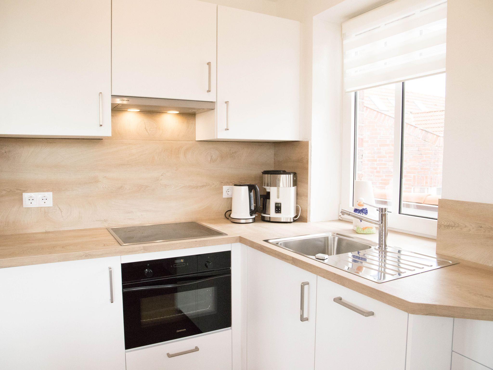In der unteren Etage gelangen Sie über den Flur in einen großen Wohnraum, mit gemütlichem Sofa, einer komplett ausgestatteten modernen Küche mit 4 Plattenkochfeld, Backofen, Geschirrspüler Kühlschrank mit zusätzlicher Gefriermöglichkeit, Toaster, Wasserkocher und Kaffeemaschine.
