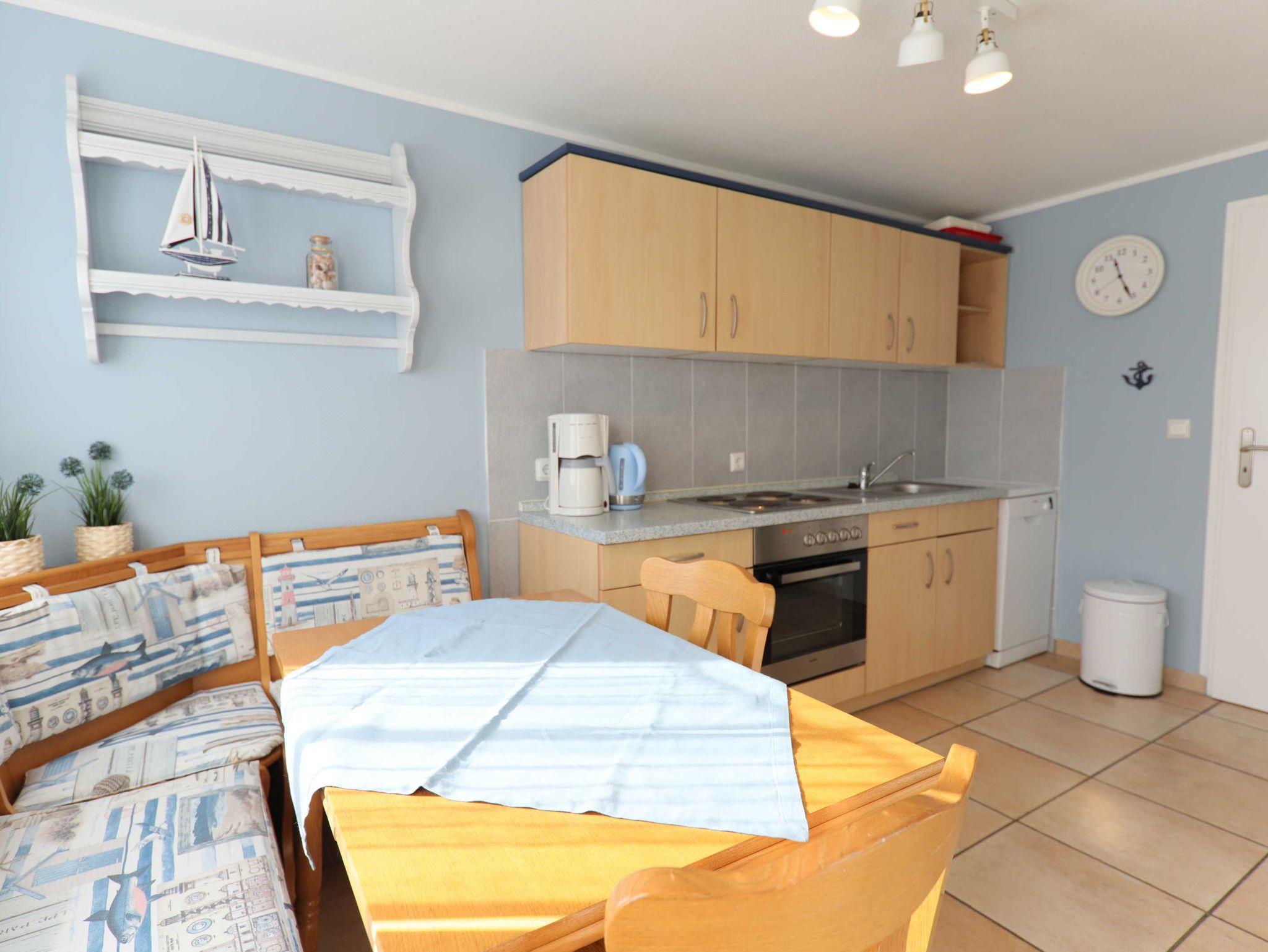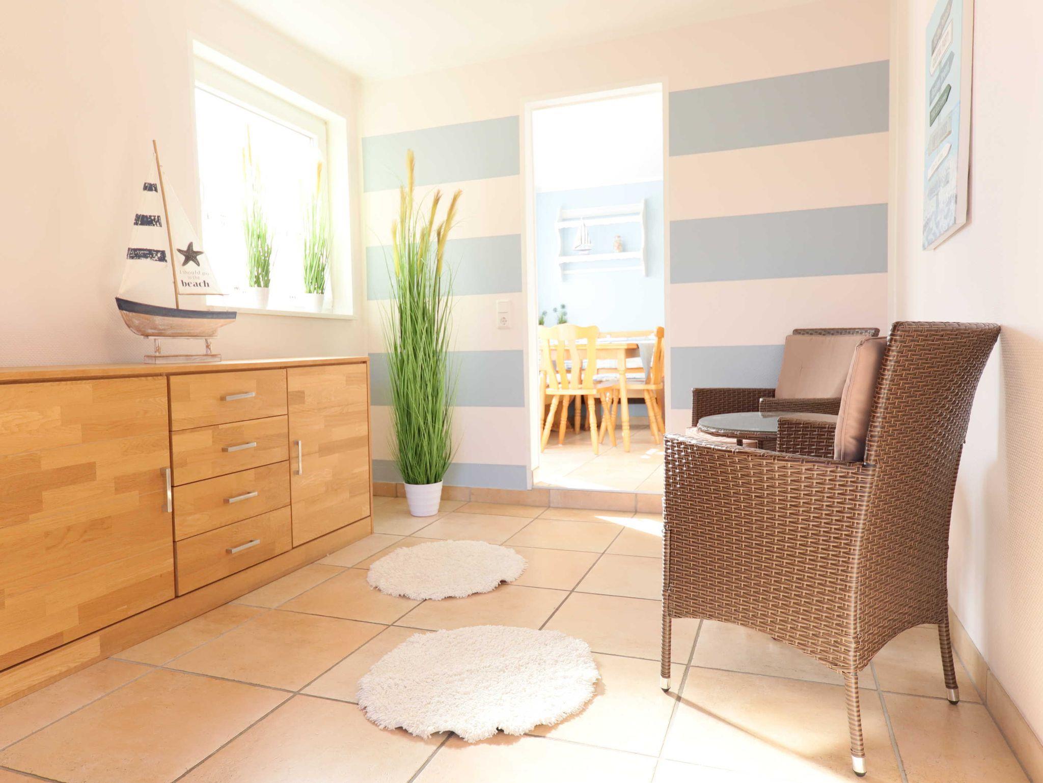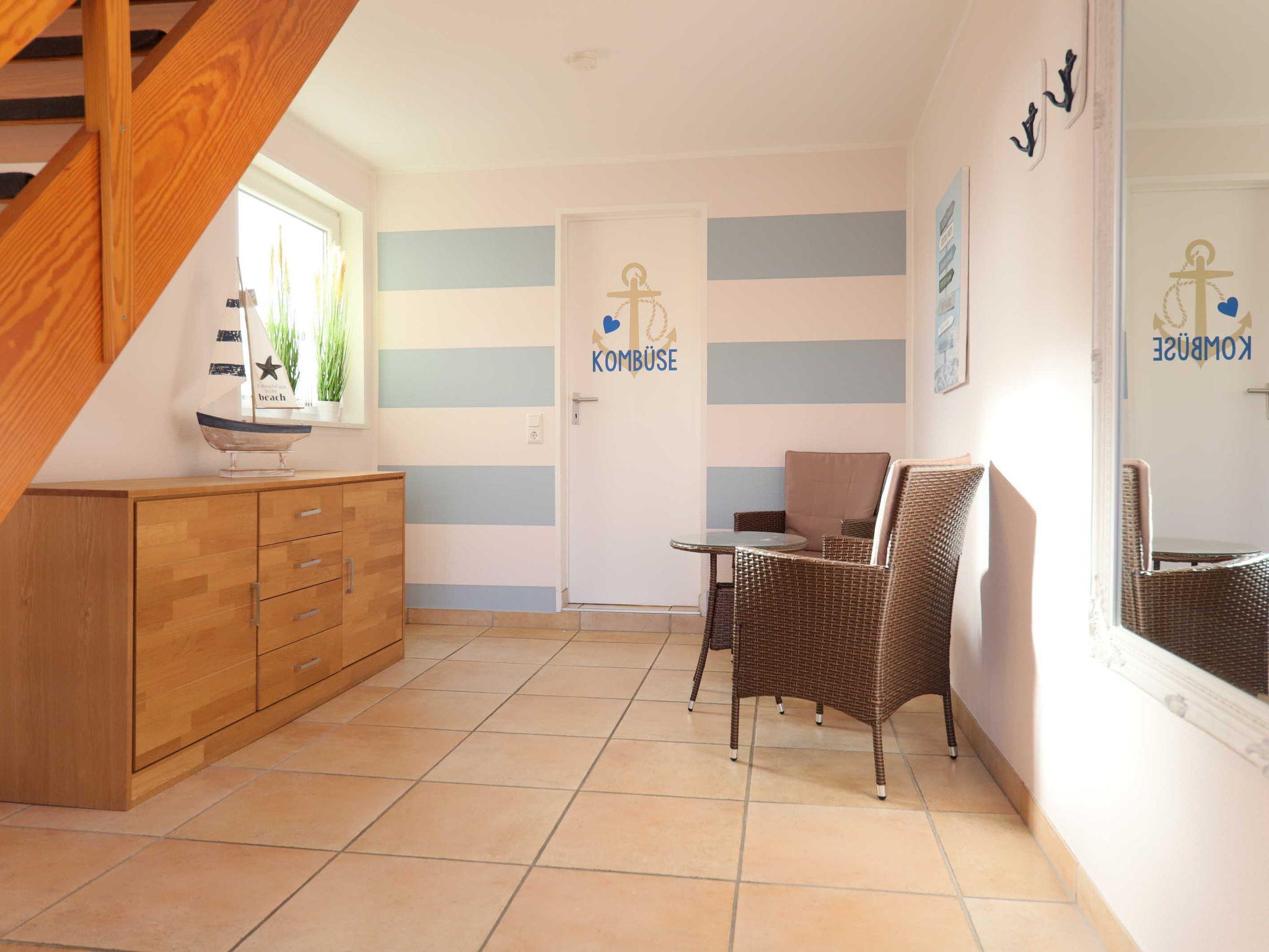 Das großzügige Apartment Meer ist 60 m² groß und befindet sich in ruhiger Sackgassenlag nur wenige Gehminuten vom Naturstrand von Schillig entfernt. Es bietet zwei Personen ausreichend Platz für einen erholsamen Urlaub. Das Apartment erstreckt sich über zwei Etagen. Im Erdgeschoss befindet sich die separate Küche mit Backofen und einem Kochfeld mit vier Herdplatten, einer Mikrowelle und einem Kühlschrank mit Gefrierfach, Kaffeemaschine, Toaster und Wasserkoche sowie einer Geschirrspüler. Das Badezimmer ist mit einer Dusche und WC ausgestattet und verfügt über ein Fenster. Von der Küche aus gelangen Sie auf die Südterrasse mit angrenzendem kleinen Gartenstück, dass mit der Nachbarwohnung geteilt wird und einem unverbauten Blick über die Felder. Die erste Etage verfügt über ein großes Wohnzimmer mit einem Fernsehapparat und Satellitenanschluss. Der Schlafbereich mit Boxspringbett (180x200) ist im Wohnzimmer integriert. Das Appartment befindet sich in Sackgassenlage nur wenige Gehminuten vom Sandstrand entfernt. Restaurants und Einkaufsmöglichkeiten sind in der Nähe. Ein eigener Parkplatz befindet sich direkt am Ferienobjekt. Die Wohnung verfügt über eine Gas- Zentralheizung, die Böden sind z. T. gefliest und z. T. mit Laminat ausgelegt.