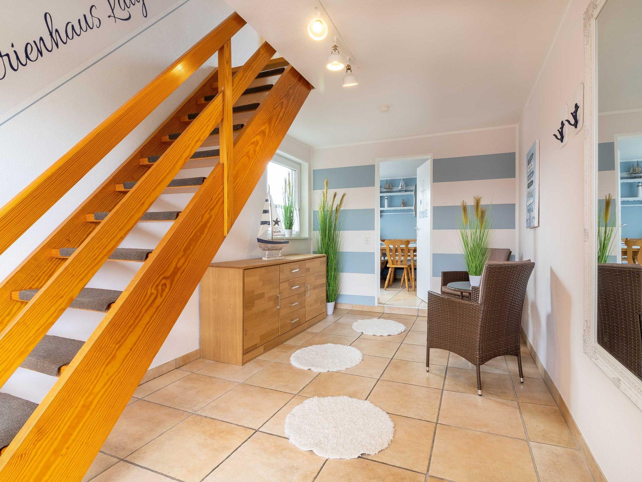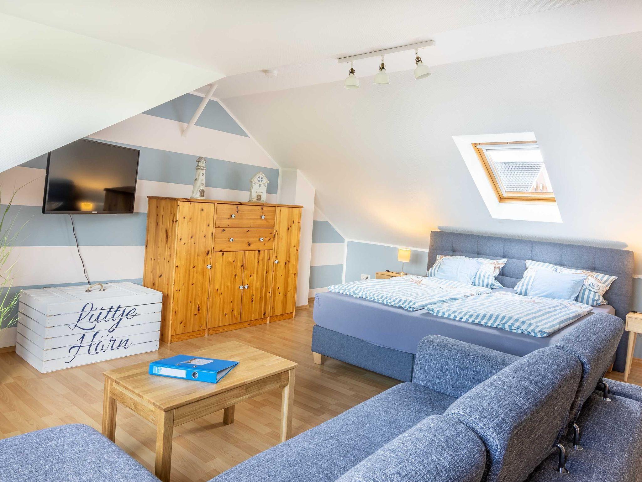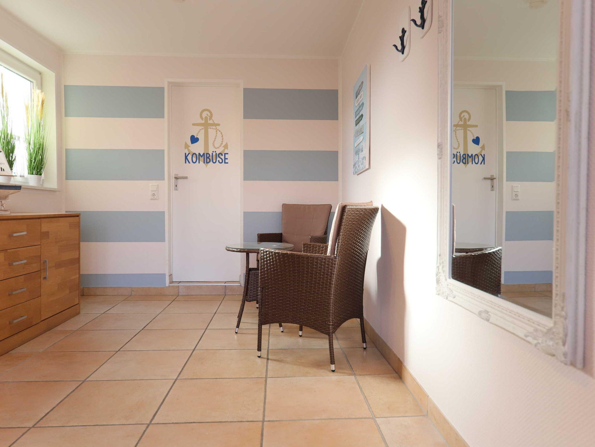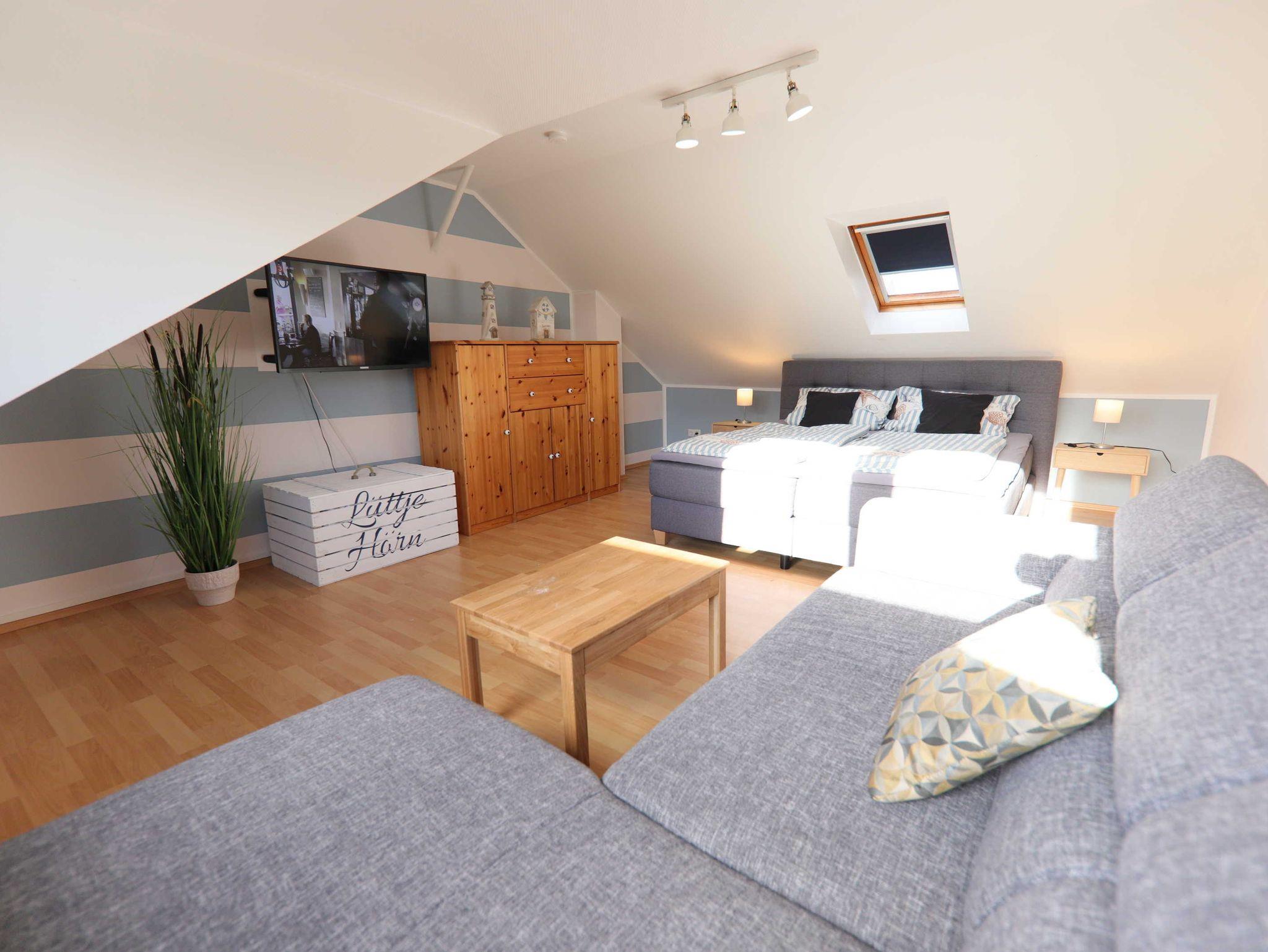 Das großzügige Apartment Meer ist 60 m² groß und befindet sich in ruhiger Sackgassenlag nur wenige Gehminuten vom Naturstrand von Schillig entfernt. Es bietet zwei Personen ausreichend Platz für einen erholsamen Urlaub. Das Apartment erstreckt sich über zwei Etagen. Im Erdgeschoss befindet sich die separate Küche mit Backofen und einem Kochfeld mit vier Herdplatten, einer Mikrowelle und einem Kühlschrank mit Gefrierfach, Kaffeemaschine, Toaster und Wasserkoche sowie einer Geschirrspüler. Das Badezimmer ist mit einer Dusche und WC ausgestattet und verfügt über ein Fenster. Von der Küche aus gelangen Sie auf die Südterrasse mit angrenzendem kleinen Gartenstück, dass mit der Nachbarwohnung geteilt wird und einem unverbauten Blick über die Felder. Die erste Etage verfügt über ein großes Wohnzimmer mit einem Fernsehapparat und Satellitenanschluss. Der Schlafbereich mit Boxspringbett (180x200) ist im Wohnzimmer integriert. Das Appartment befindet sich in Sackgassenlage nur wenige Gehminuten vom Sandstrand entfernt. Restaurants und Einkaufsmöglichkeiten sind in der Nähe. Ein eigener Parkplatz befindet sich direkt am Ferienobjekt. Die Wohnung verfügt über eine Gas- Zentralheizung, die Böden sind z. T. gefliest und z. T. mit Laminat ausgelegt.