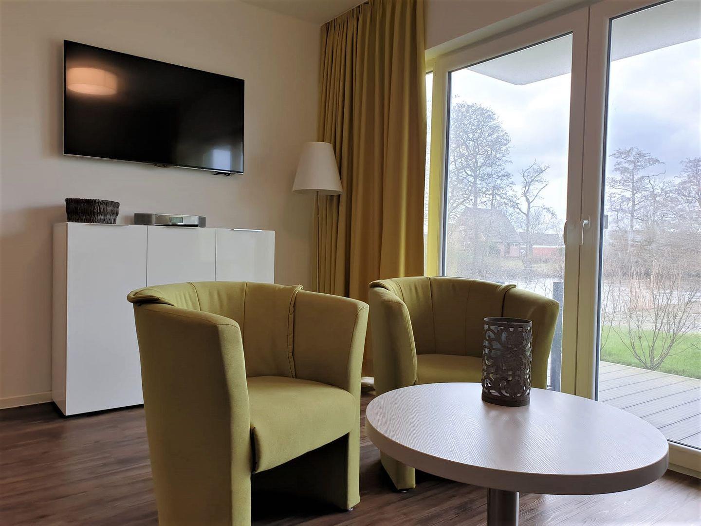 Der helle Wohnbereich verfügt über ein Schlafsofa, einen Couchtisch und zwei Sessel.