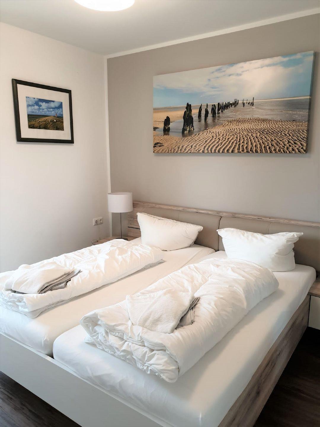 Im Schlafzimmer steht Ihnen ein modernes Doppelbett mit Nachtkonsolen und ein Kleiderschrank zur Verfügung.